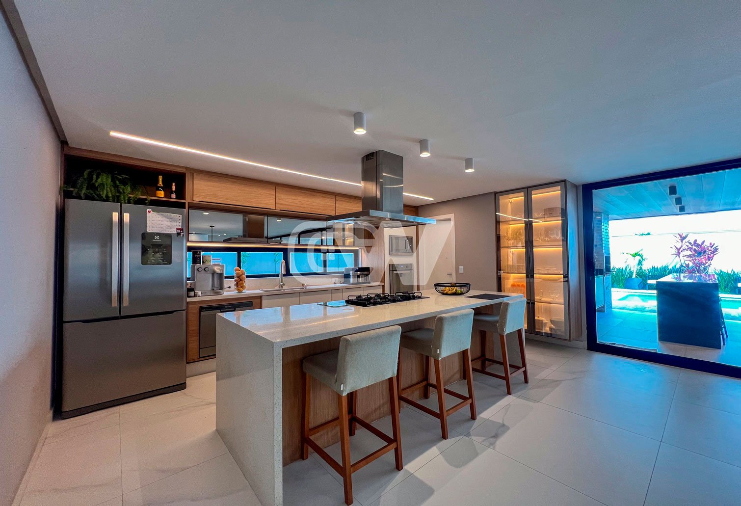 1º Pavimento: Hall de entrada com Pé direito duplo, projeto de iluminação, suíte térrea, Lavabo decorado, cozinha com ilha, repleta de armários.