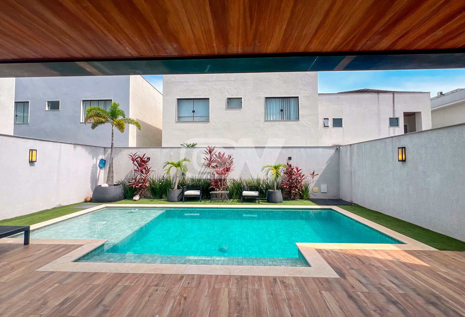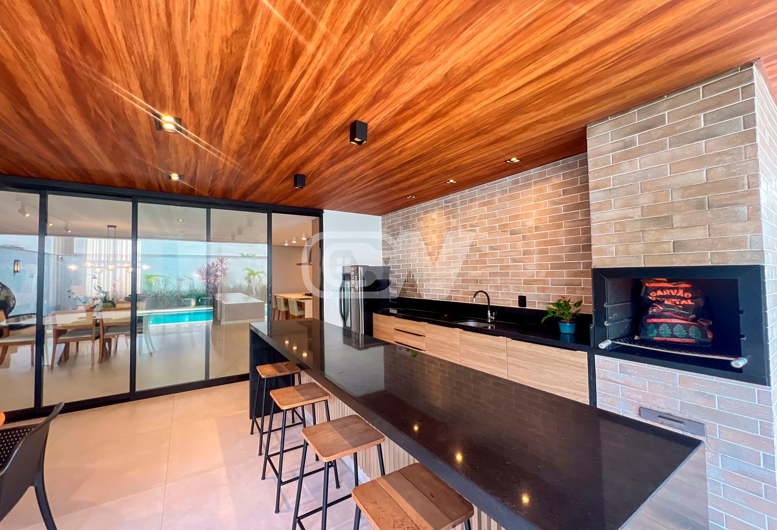 Lazer: área gourmet com ilha de apoio, churrasqueira, armários, piscina com cascata e iluminação banheiro de apoio, depósito área de serviço.