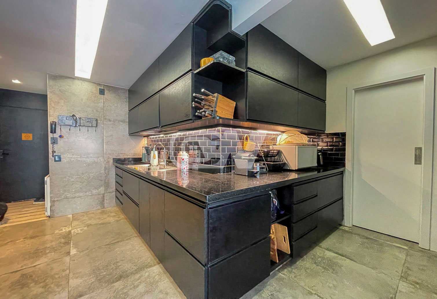 A área social é composta por uma ampla sala, integrada à varanda com cortina de vidro, proporcionando excelente iluminação natural e conforto. A cozinha planejada, moderna e integrada, valoriza a praticidade do dia a dia.