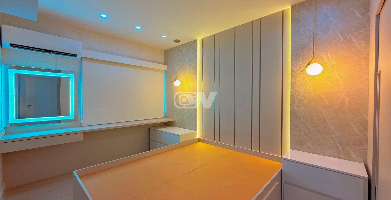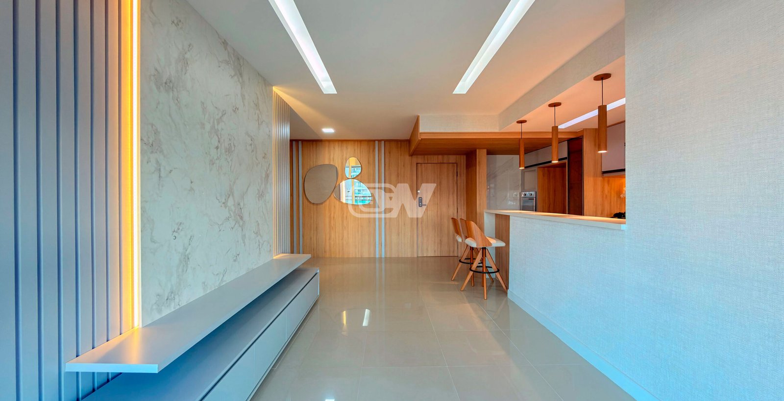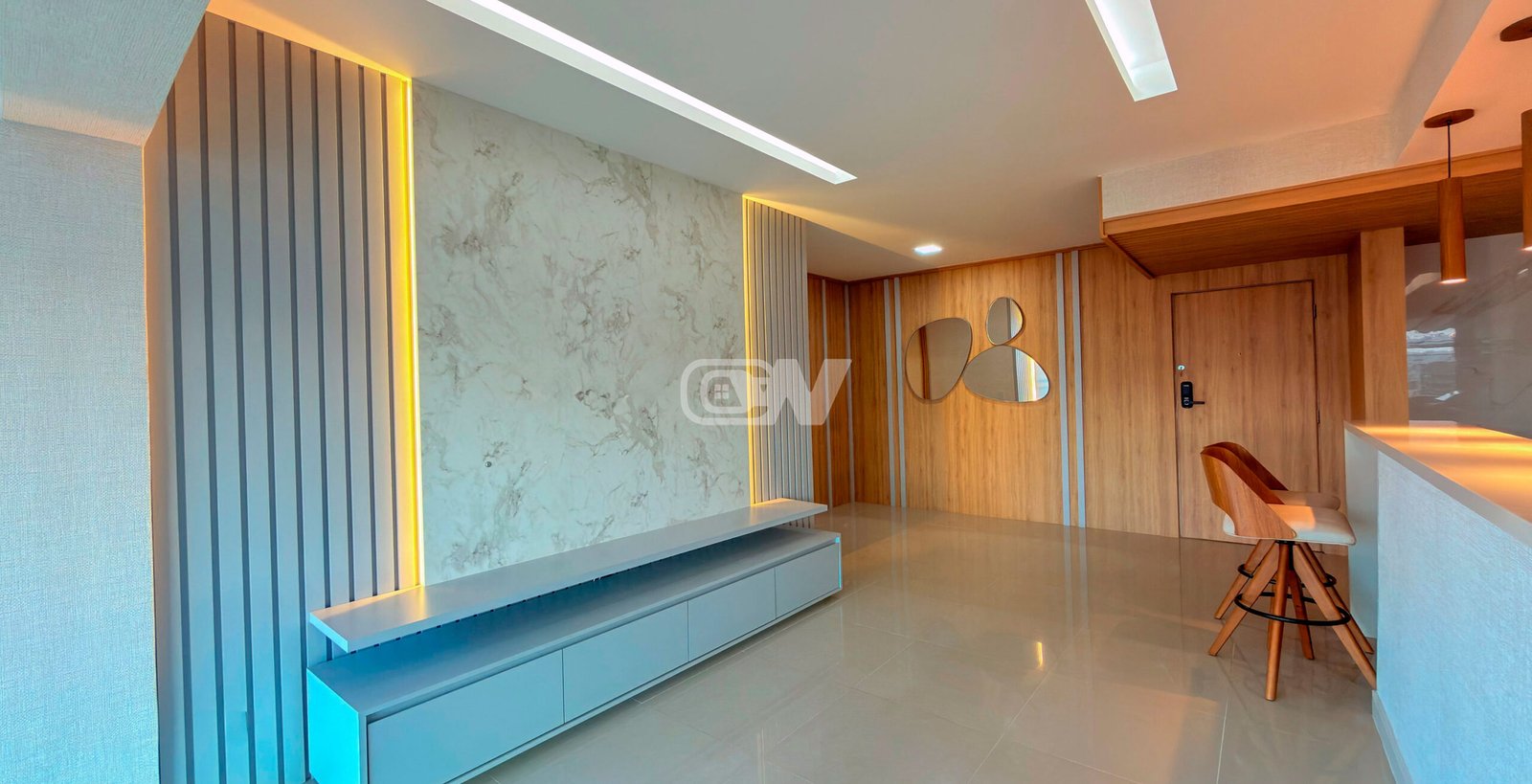 Sala em três (3) três ambientes, climatizada com ar condicionado modelo K7, projeto de iluminação direto e indireto, decorado com planejados, com acesso a varanda gourmet fechada com cortina de vidro com vista para o lazer do condomínio, banheiro com bancada esculpida, (#) três quartos com armários planejados, sendo a suíte principal com close.