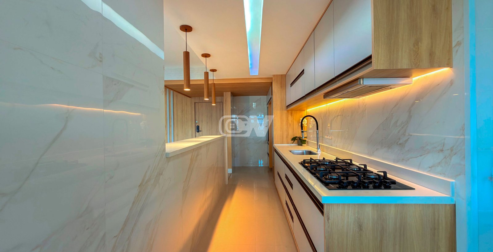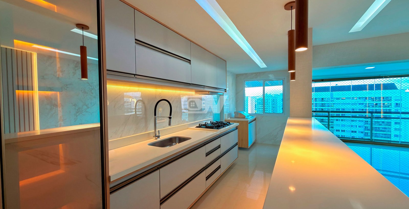 Copa-cozinha estilo americana com armários planejados, área de serviço e dependência de funcionários completa.