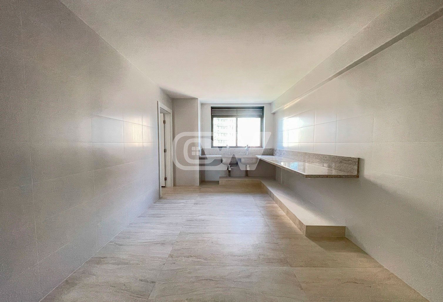 A cozinha é espaçosa, com preparação para copa ou ilha, além de contar com despensa, área de serviço e dependência de funcionário.