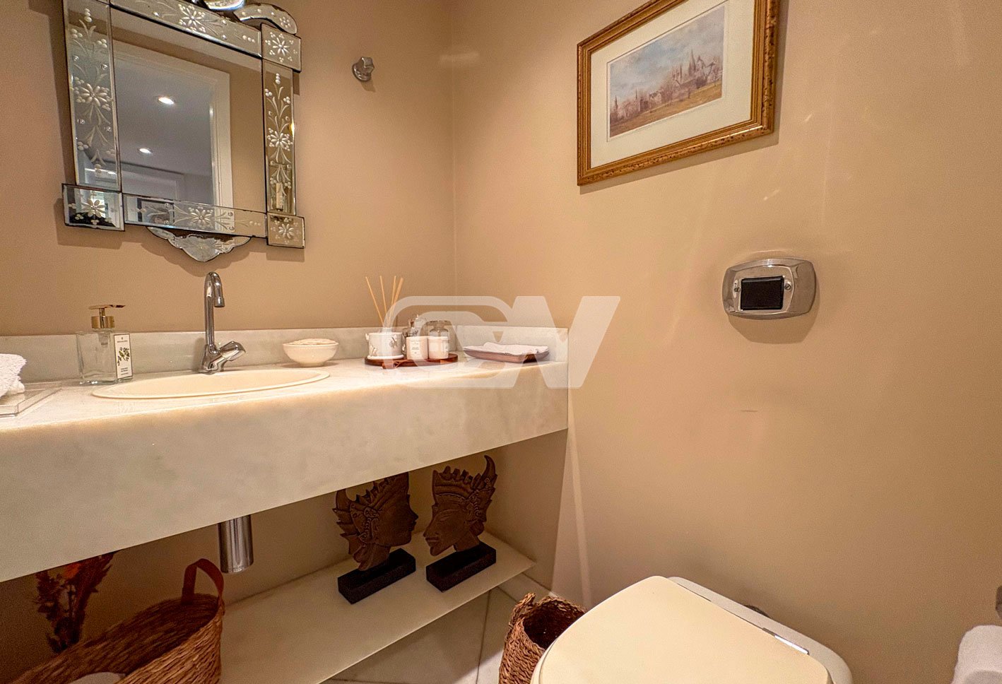 Quatro quartos sendo dois quartos revertidos em escritório com varanda, banheiro completo e duas suítes com varanda.