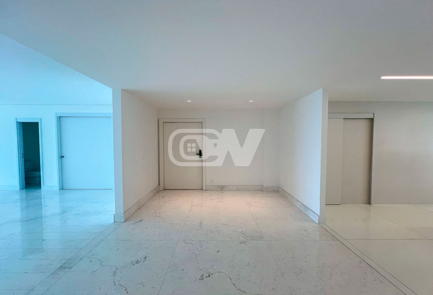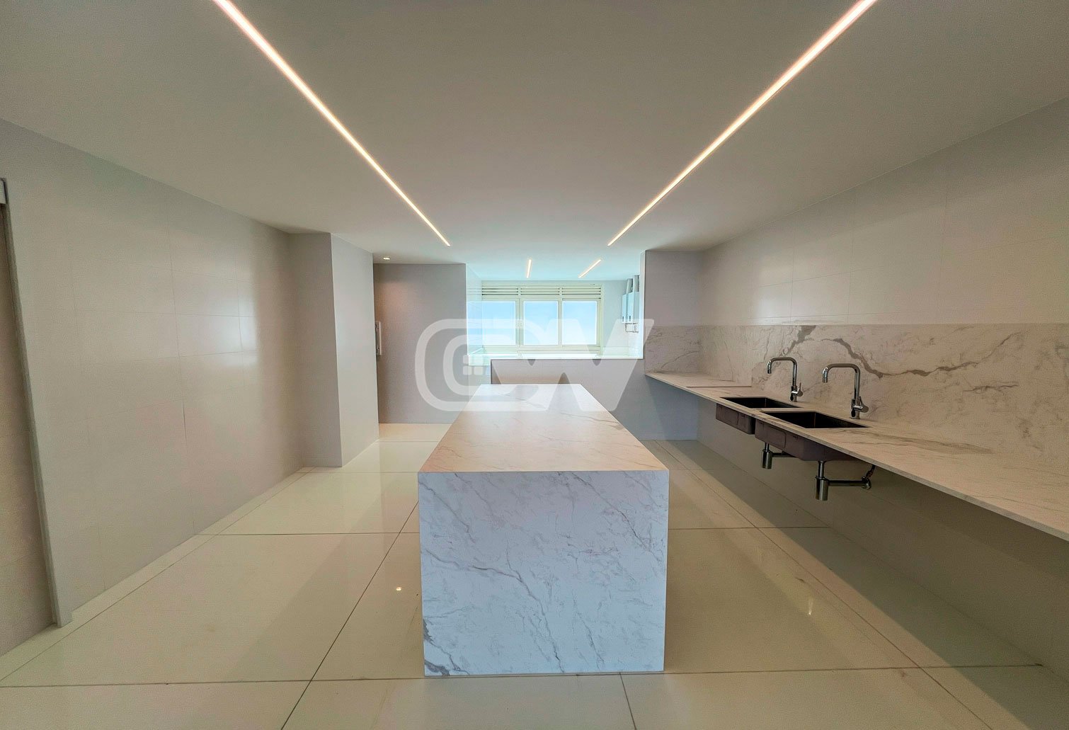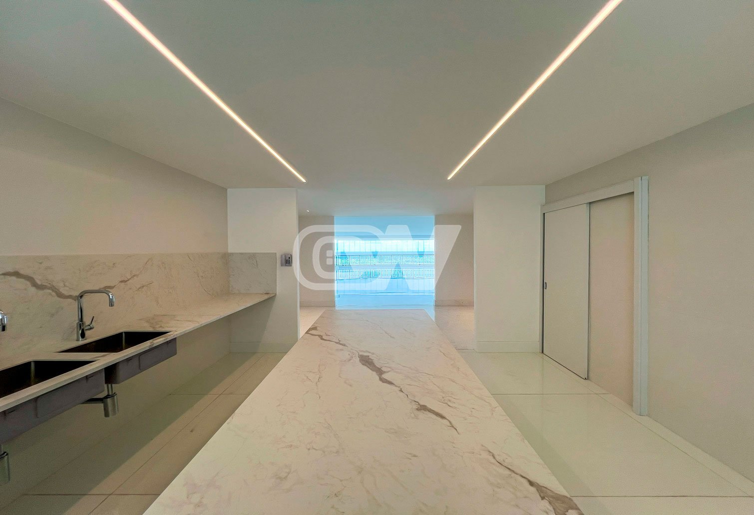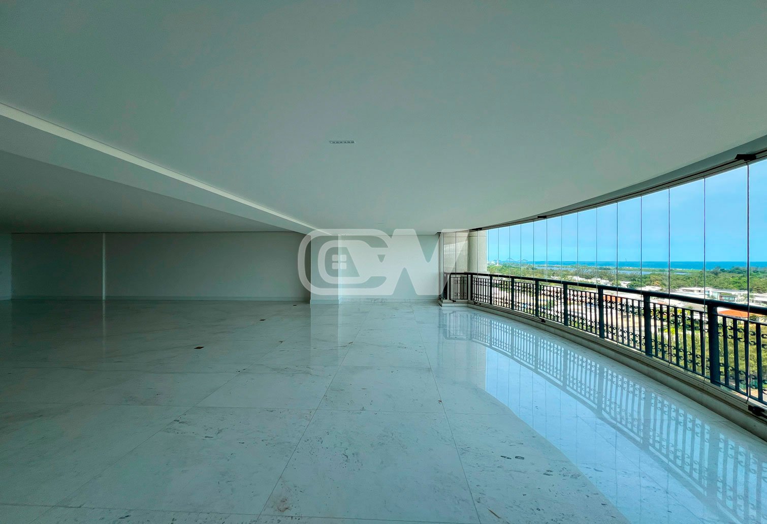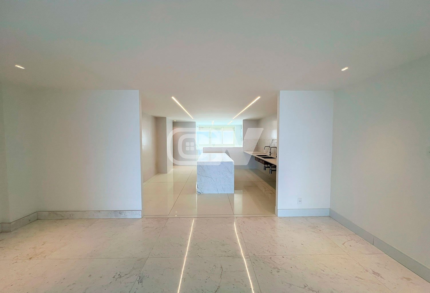 O imóvel possui ampla sala em múltiplos ambientes, com elegante piso em mármore Piguês acetinado branco, que valoriza ainda mais a sofisticação do espaço. A varanda foi totalmente integrada à área social, com cortina de vidro e piso nivelado com a sala, criando um ambiente amplo, iluminado e perfeito para receber.