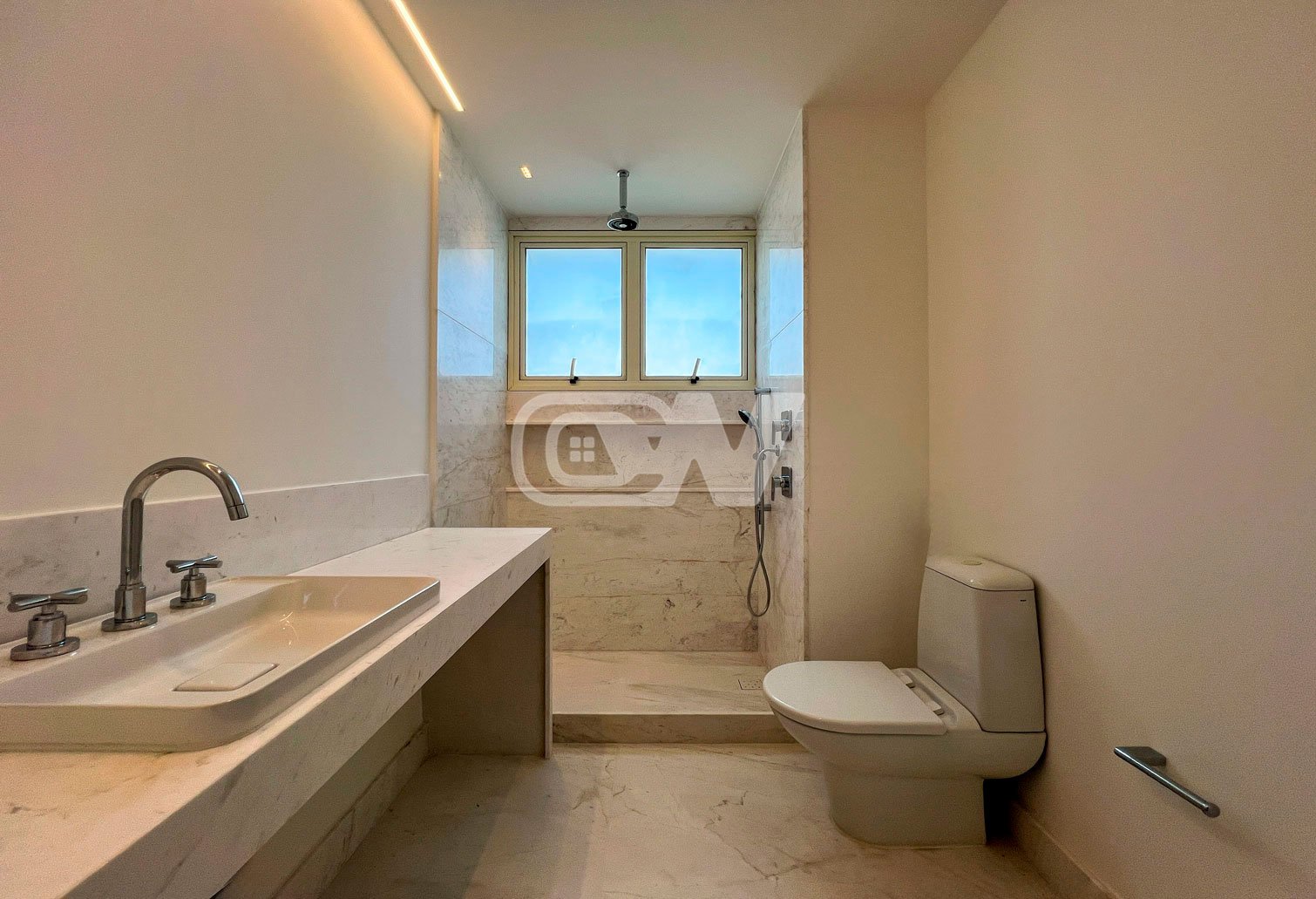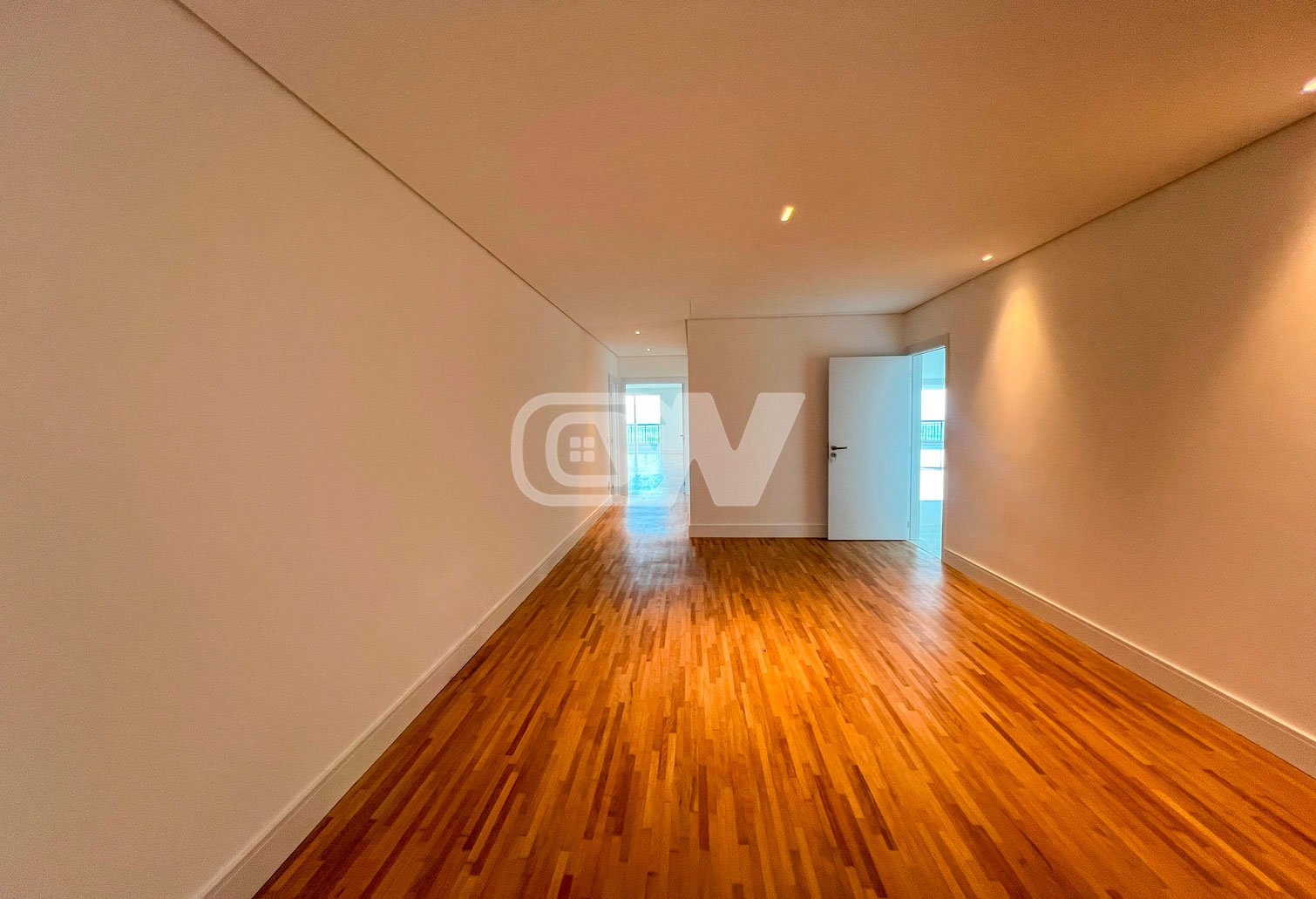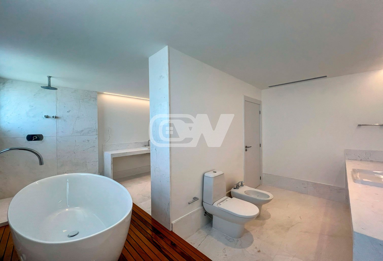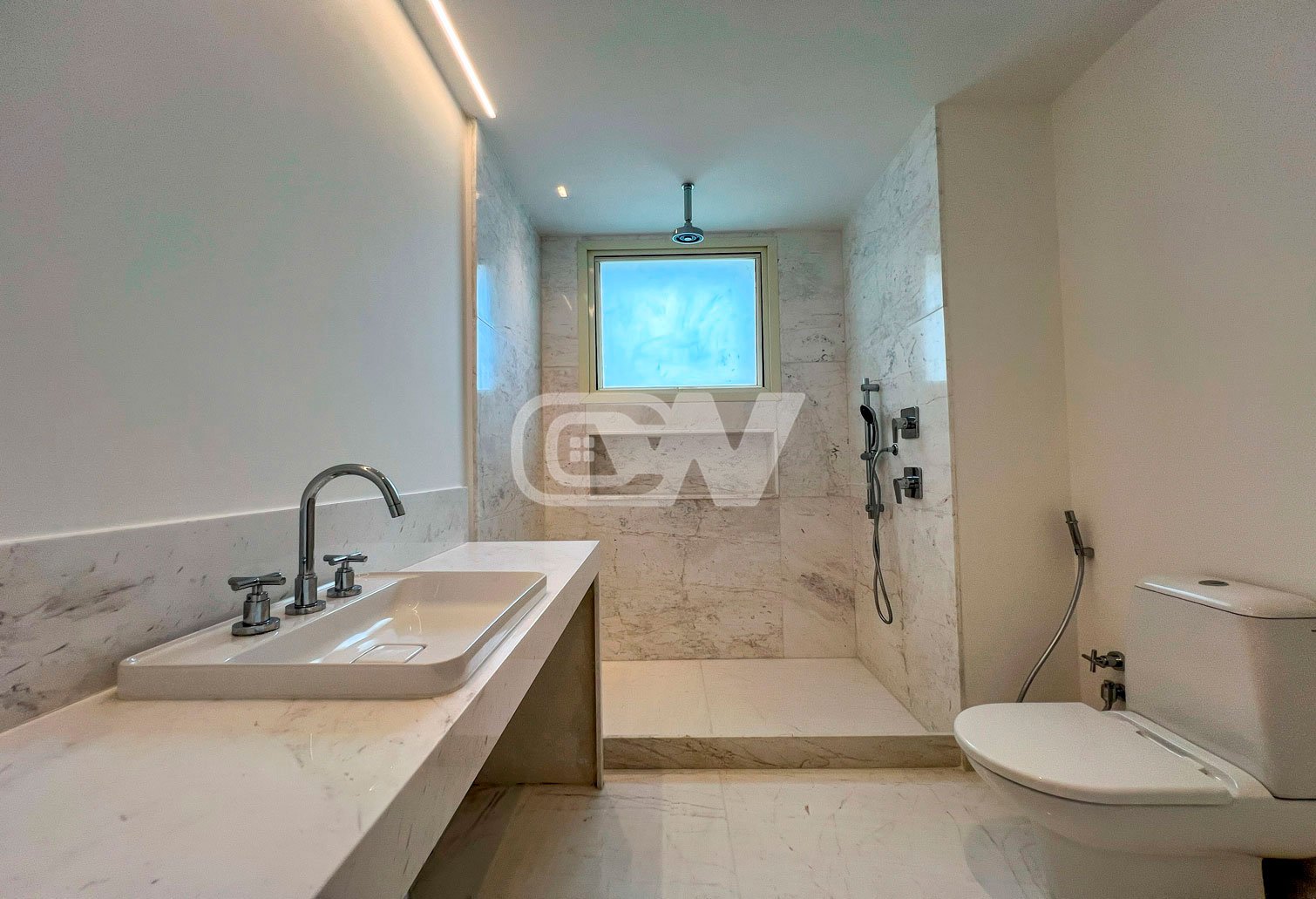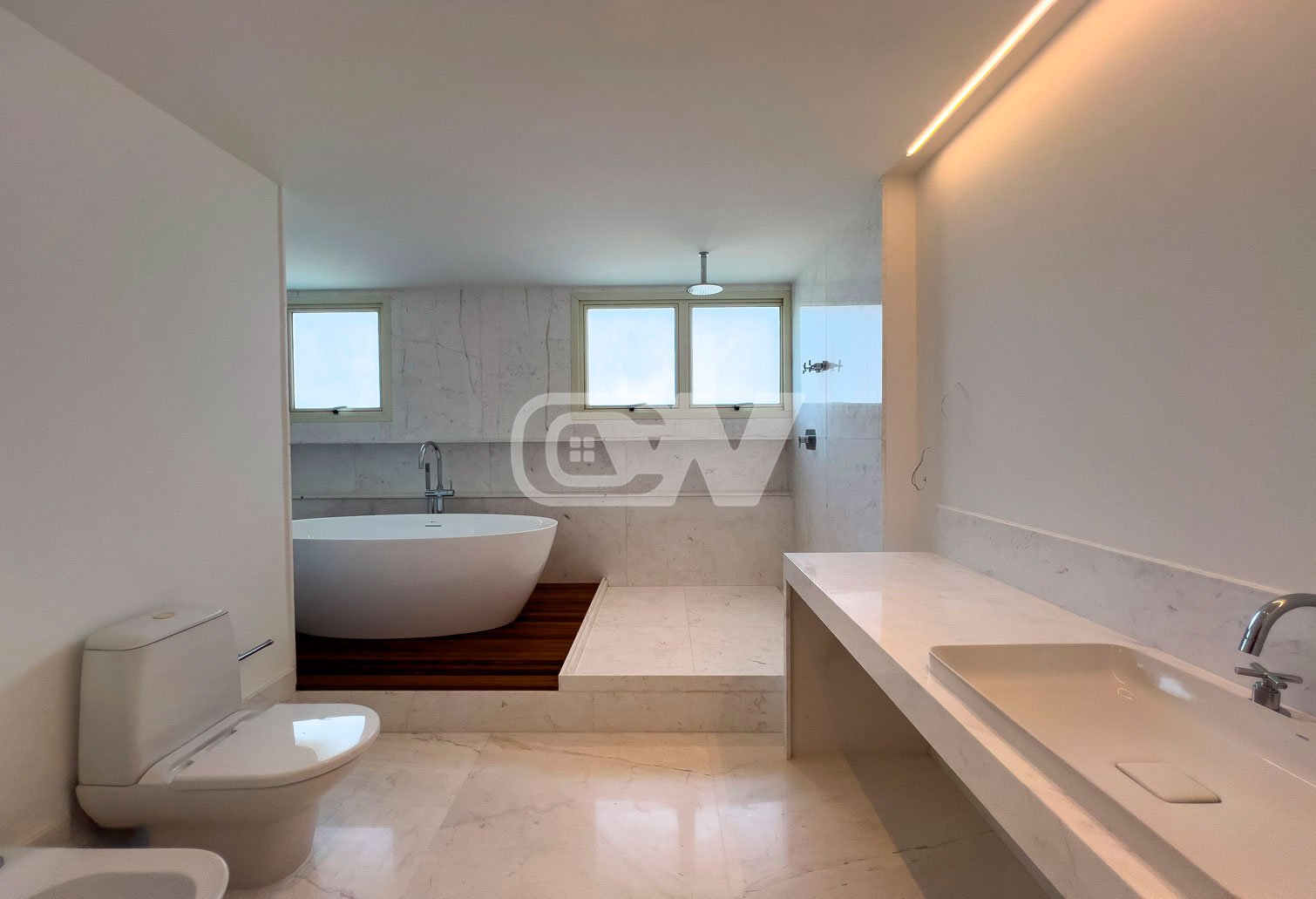 Na área íntima, o apartamento conta com cinco suítes, todas com piso em madeira, proporcionando conforto e aconchego. A suíte master se destaca pelo seu espaço generoso, distribuído em dois ambientes, além de amplo closet e um elegante salão de banho, equipado com duas cubas, banheira de imersão e varanda privativa com cortina de vidro.