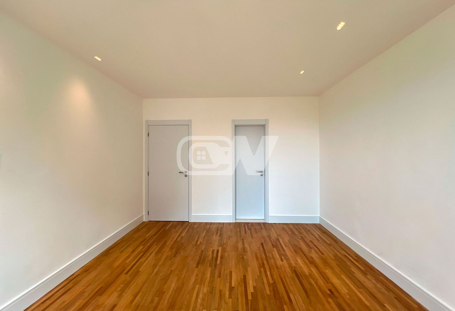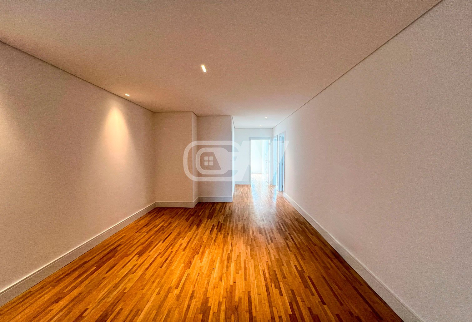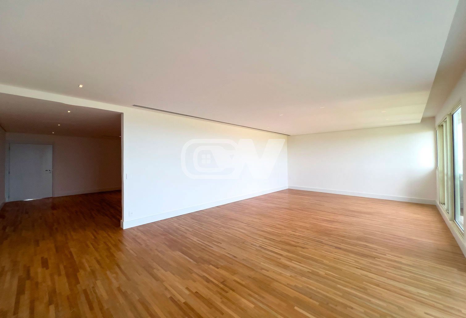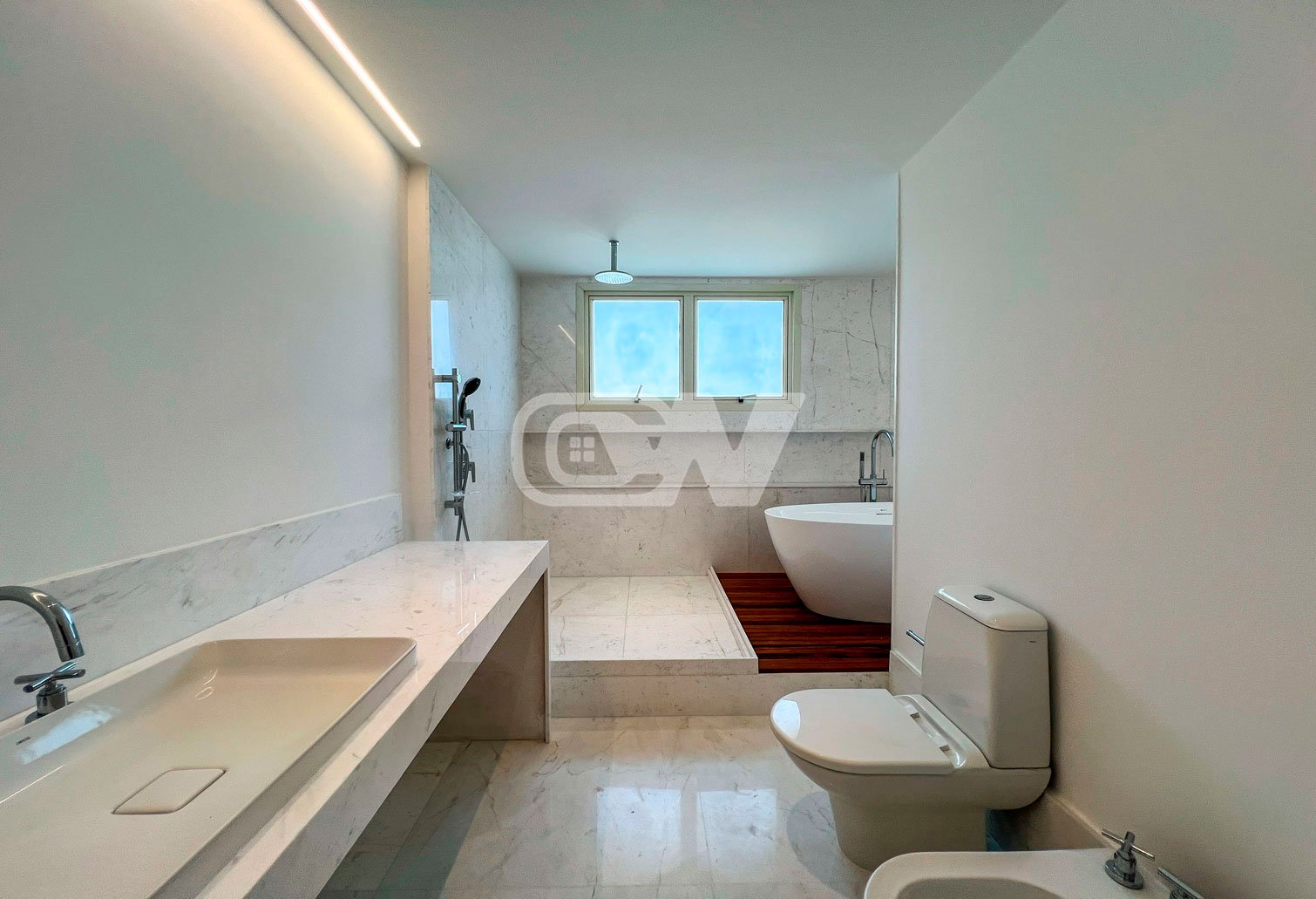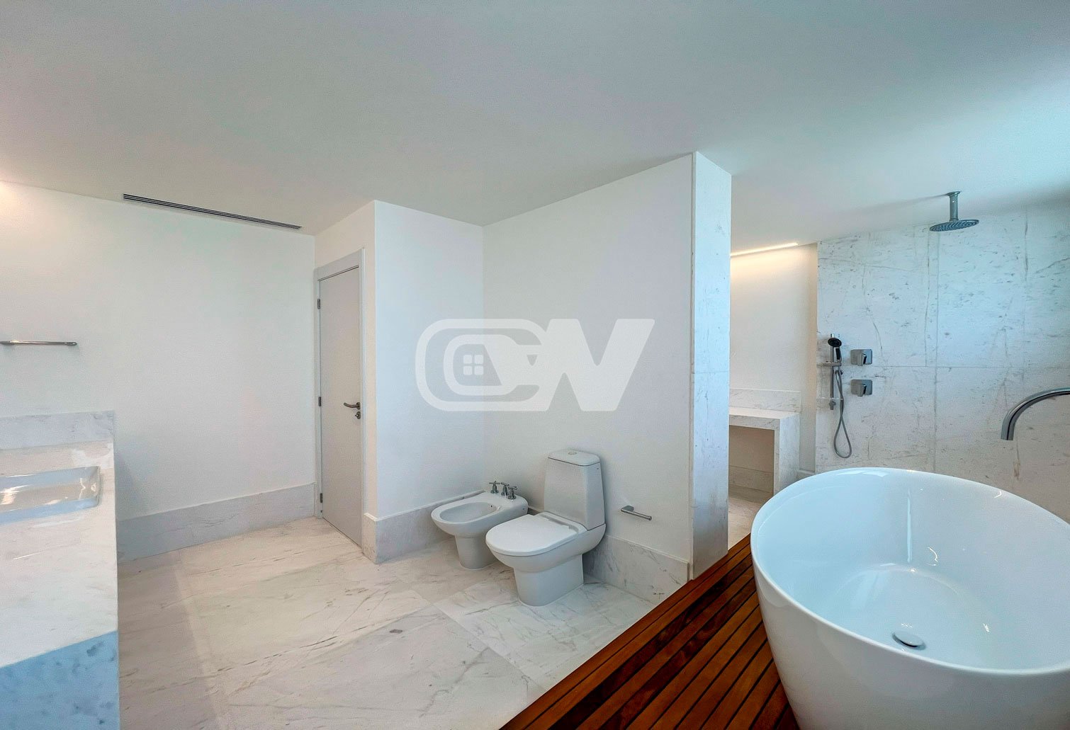 Na área íntima, o apartamento conta com cinco suítes, todas com piso em madeira, proporcionando conforto e aconchego. A suíte master se destaca pelo seu espaço generoso, distribuído em dois ambientes, além de amplo closet e um elegante salão de banho, equipado com duas cubas, banheira de imersão e varanda privativa com cortina de vidro.