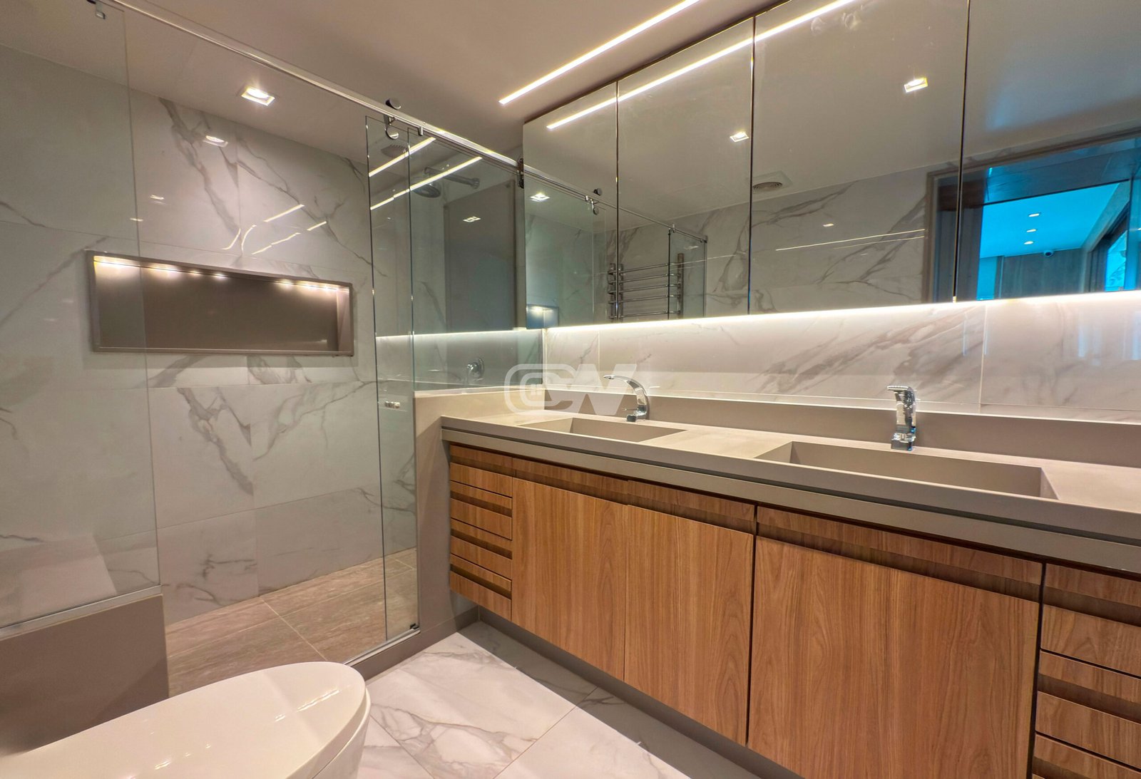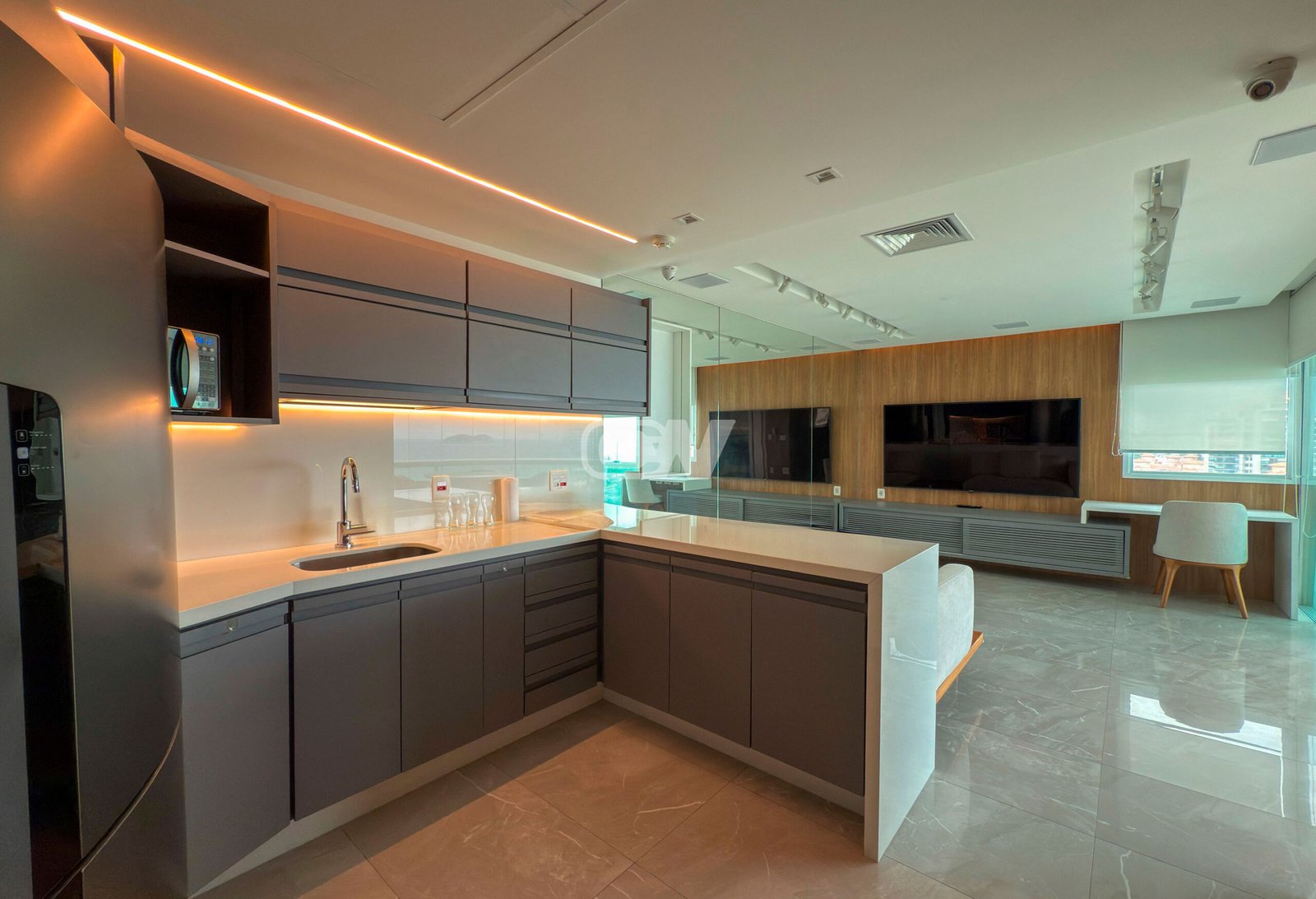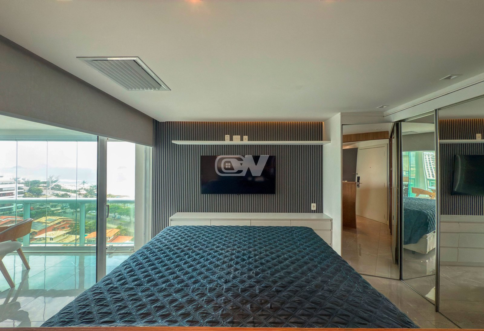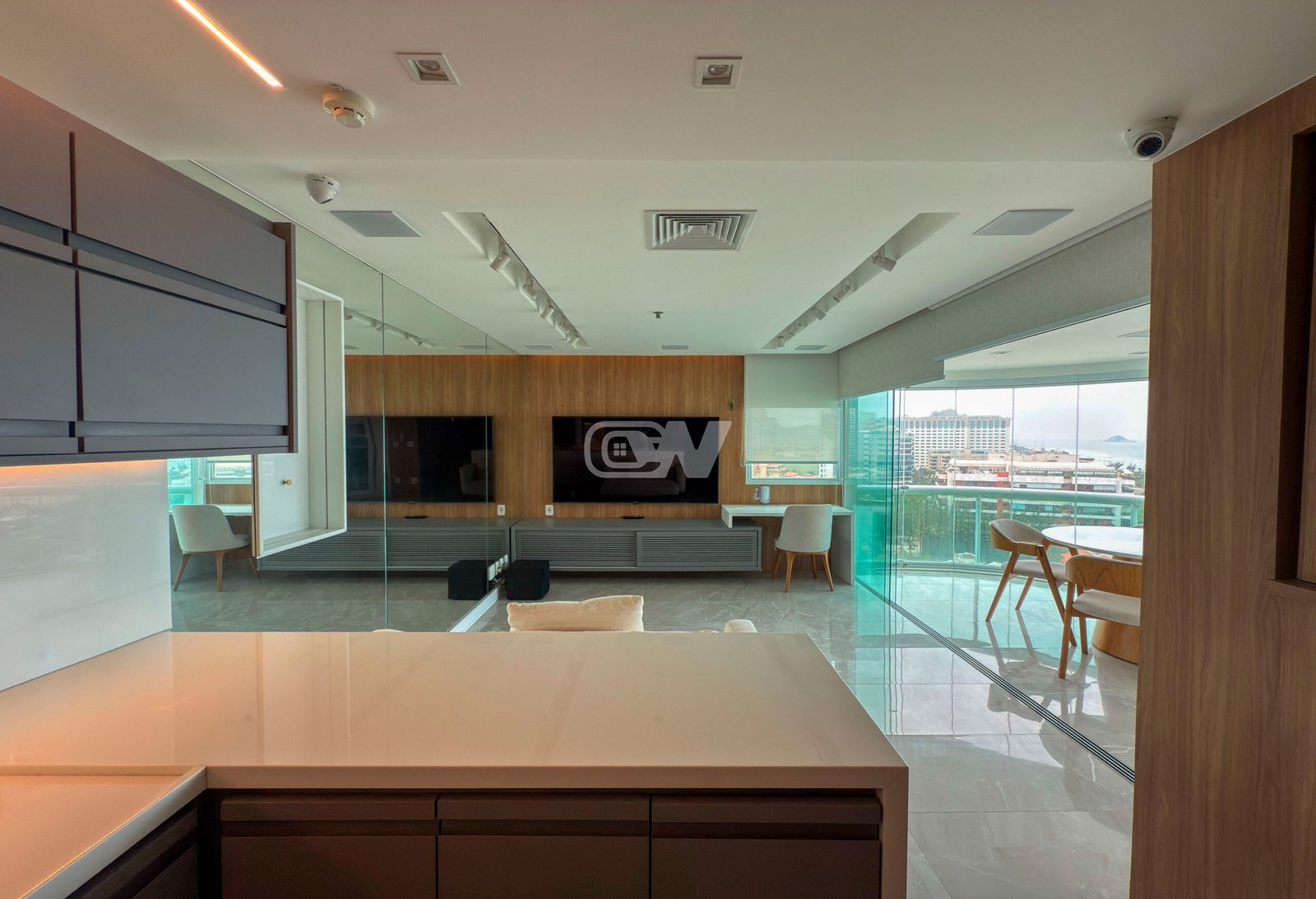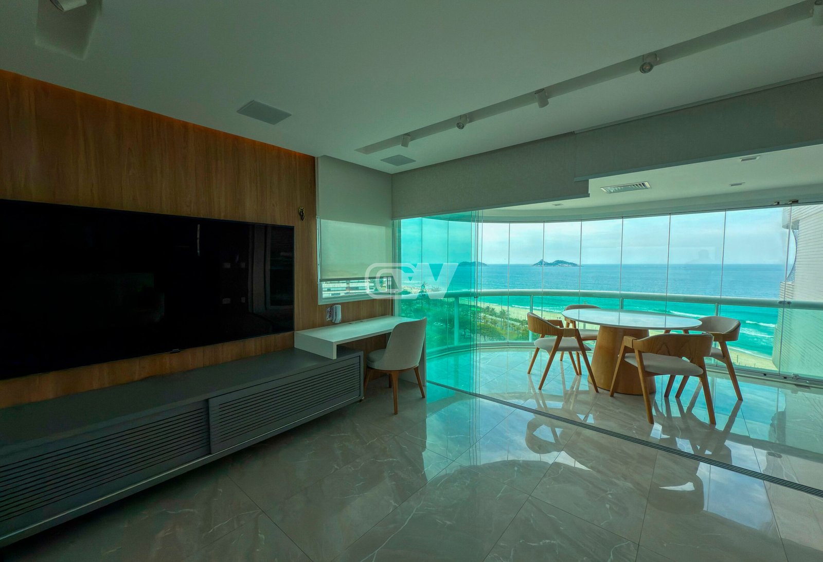 VARANDA COM VISTA MAR, SALA COM PISO EM PORCELANATO, AR CONDICIONADO, COZINHA PLANEJADA E SUITE COMPLETA.