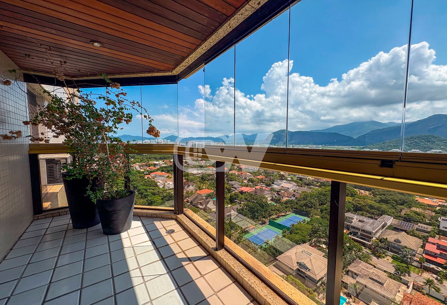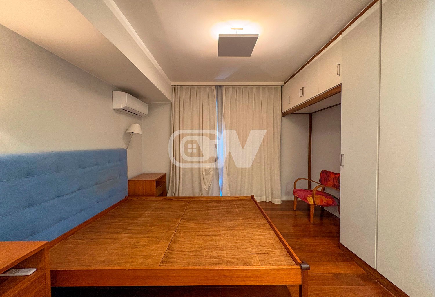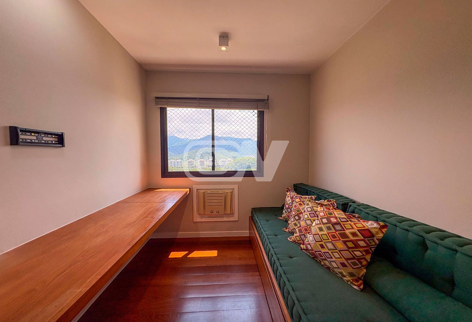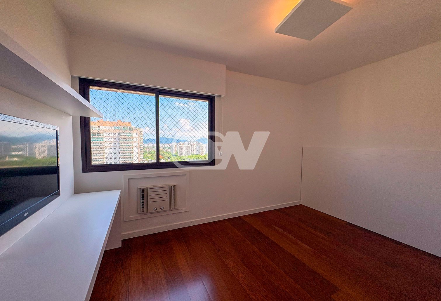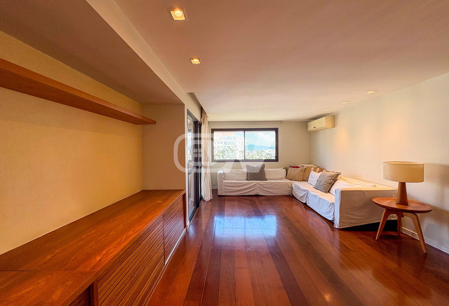 A área social é composta por sala ampla em dois ambientes, integrada à varanda, ideal para receber. São 4 dormitórios, sendo 2 suítes, todos com marcenaria planejada e ar-condicionado. A suíte principal conta com varanda privativa e vista agradável para o verde.