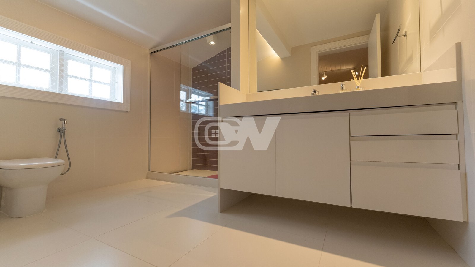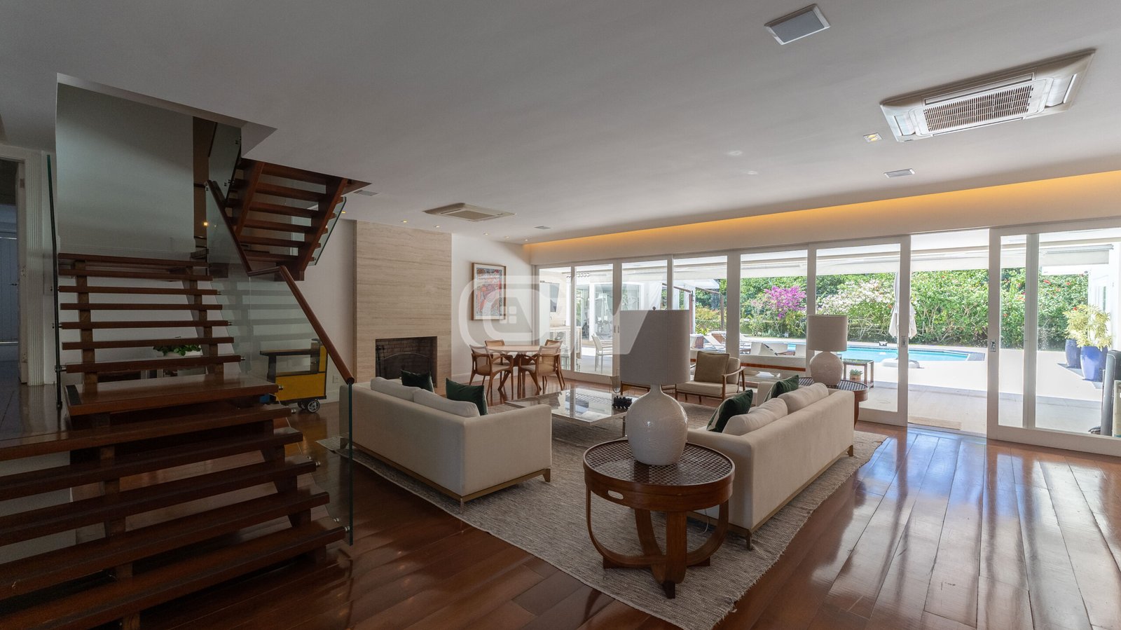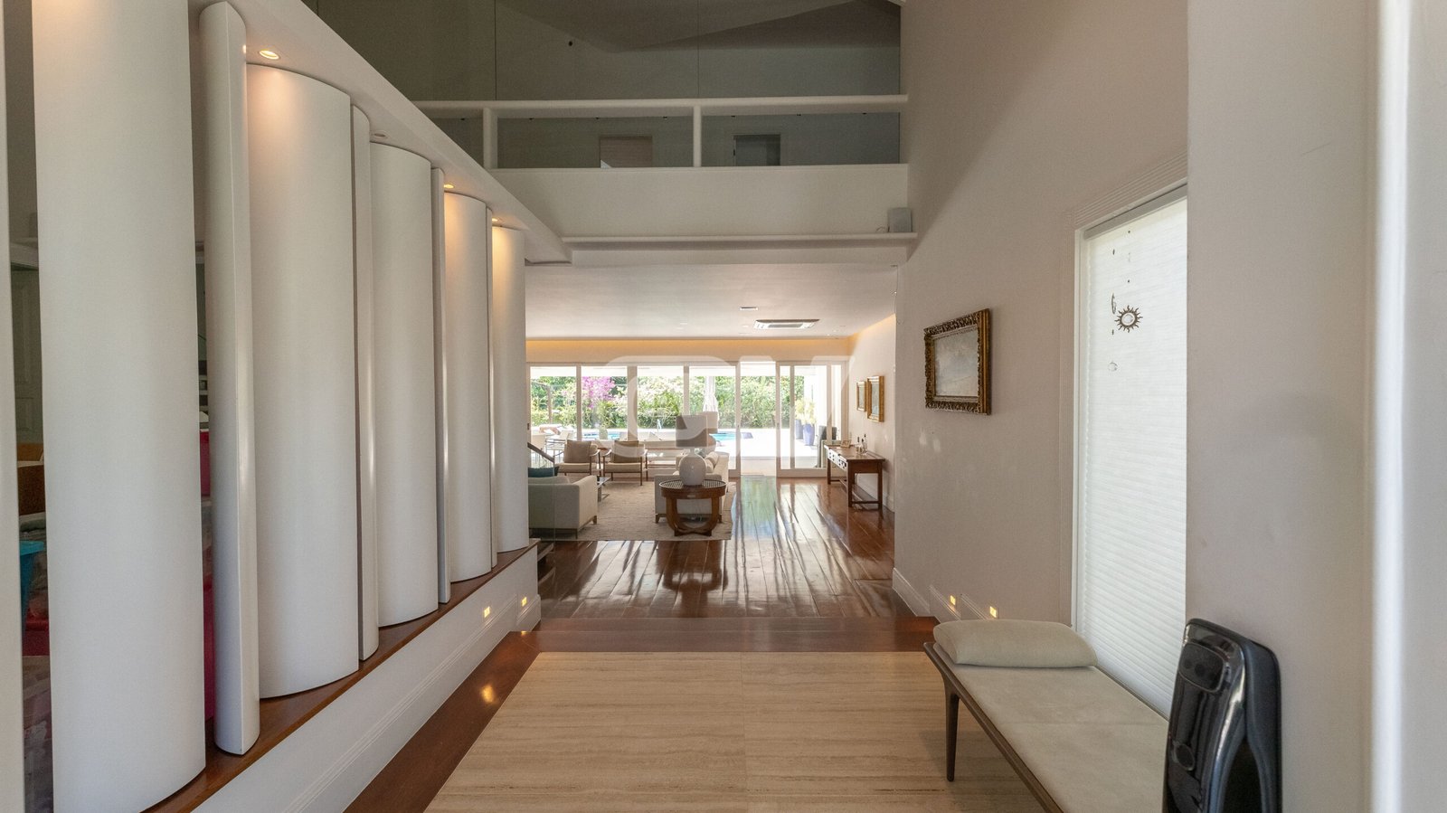 1° Pavimento: Hall de entrada, sala dividida em vários ambientes com pé direito duplo, lavabo, lavabo, duas suítes térreas e escritório.