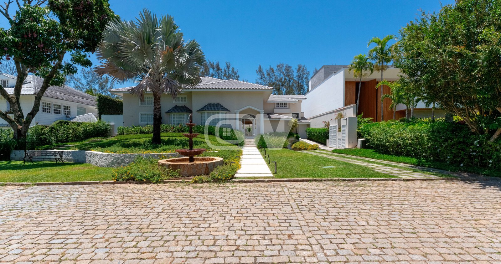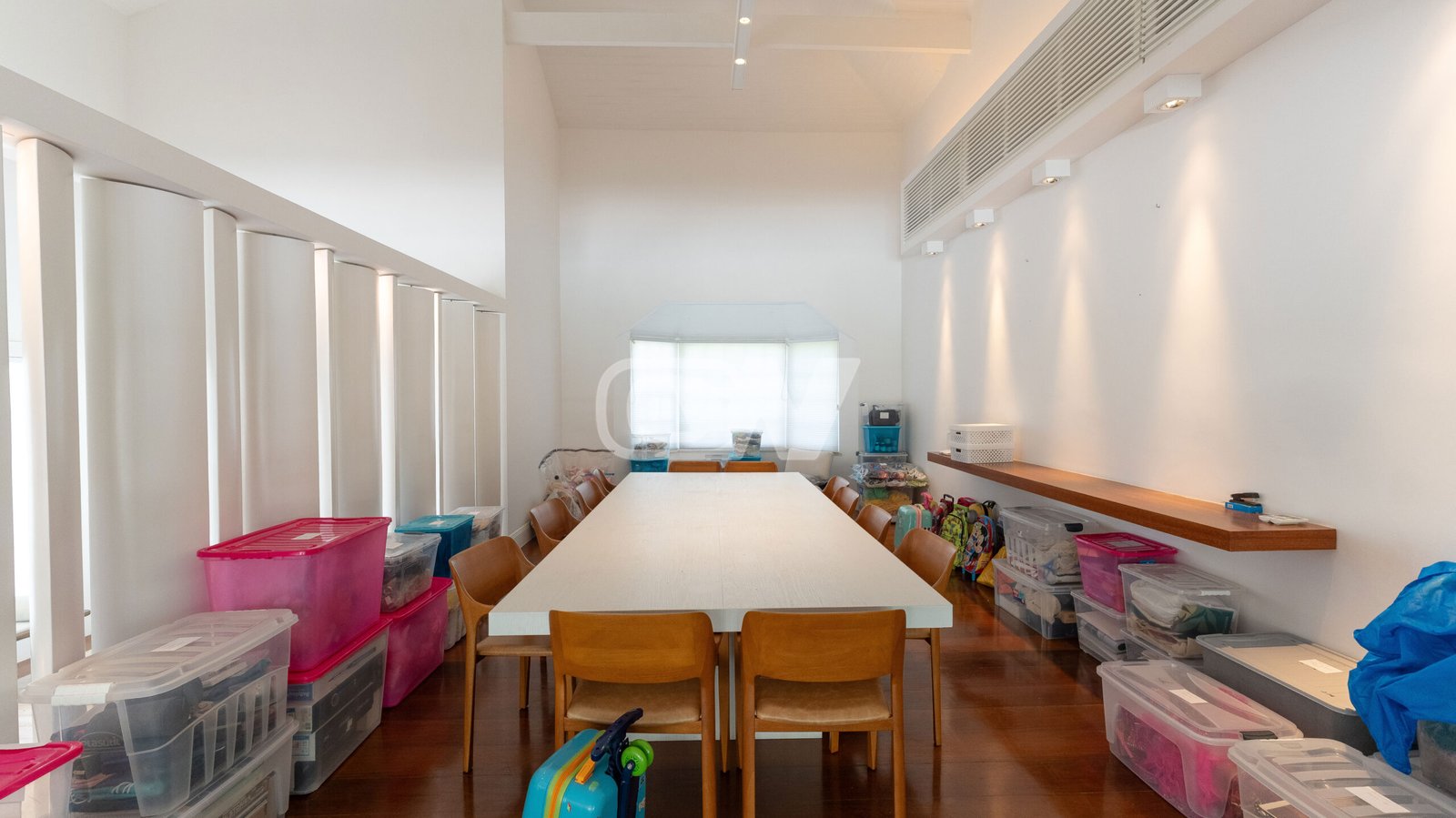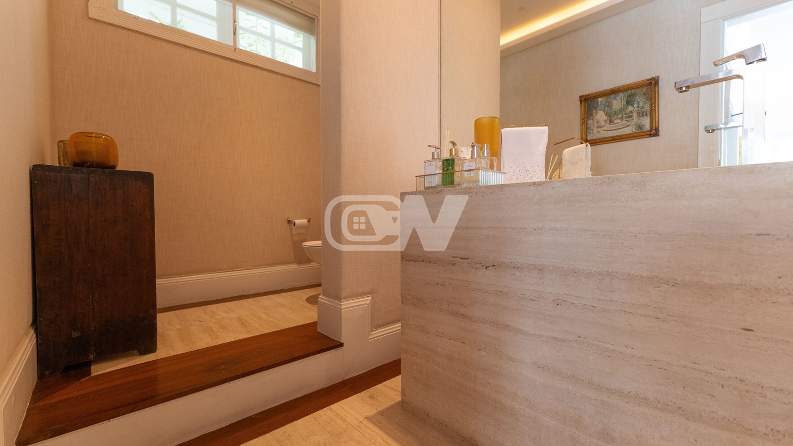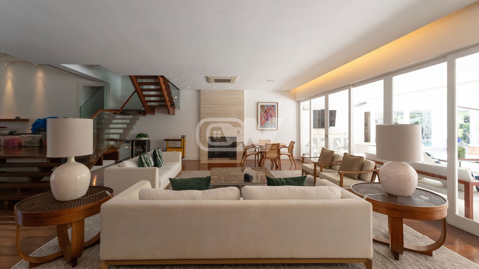 1° Pavimento: Hall de entrada, sala dividida em vários ambientes com pé direito duplo, lavabo, lavabo, duas suítes térreas e escritório.