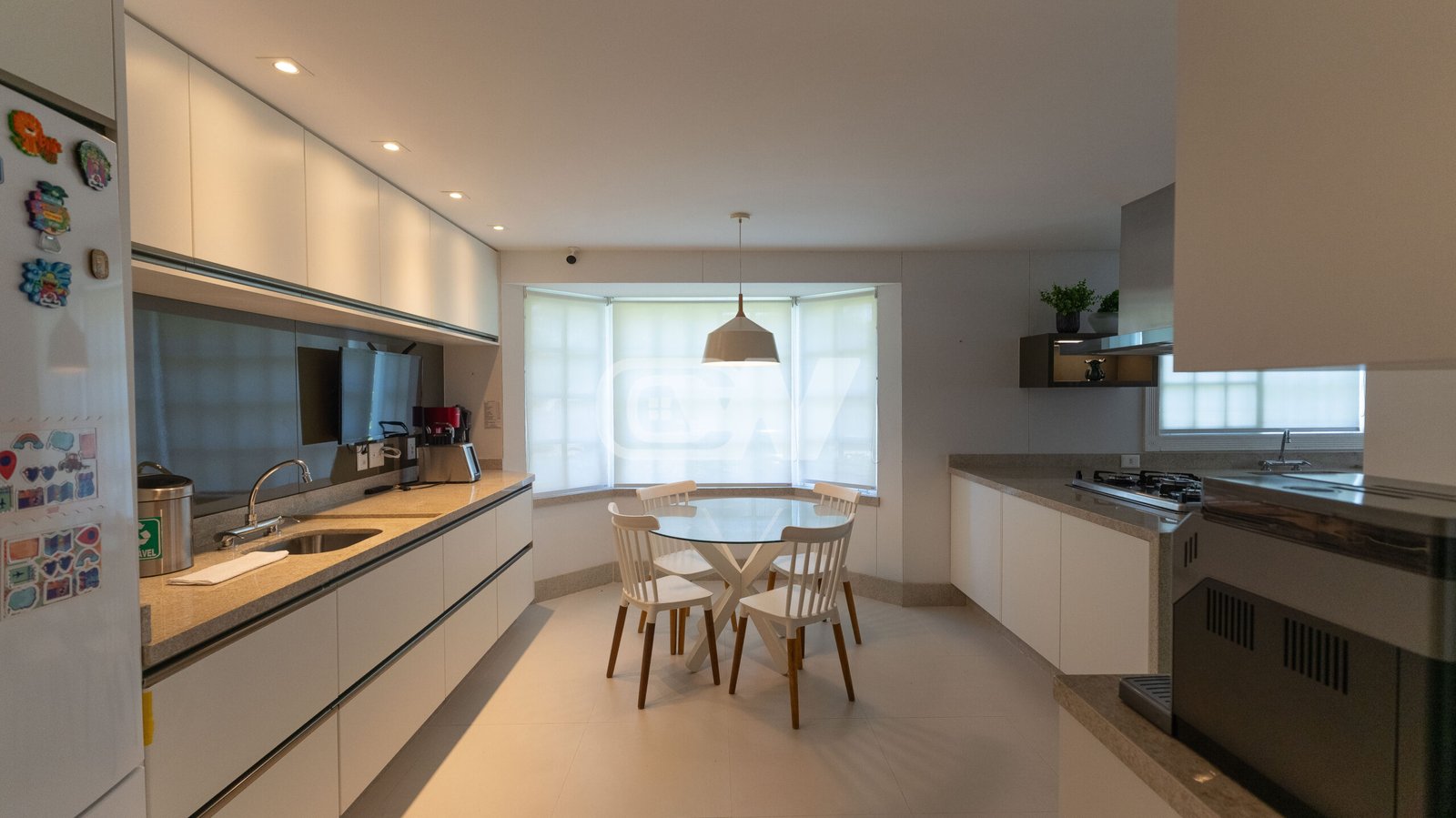 Ampla copa cozinha com armários planejados, despensa, área de serviço e dependência completa.