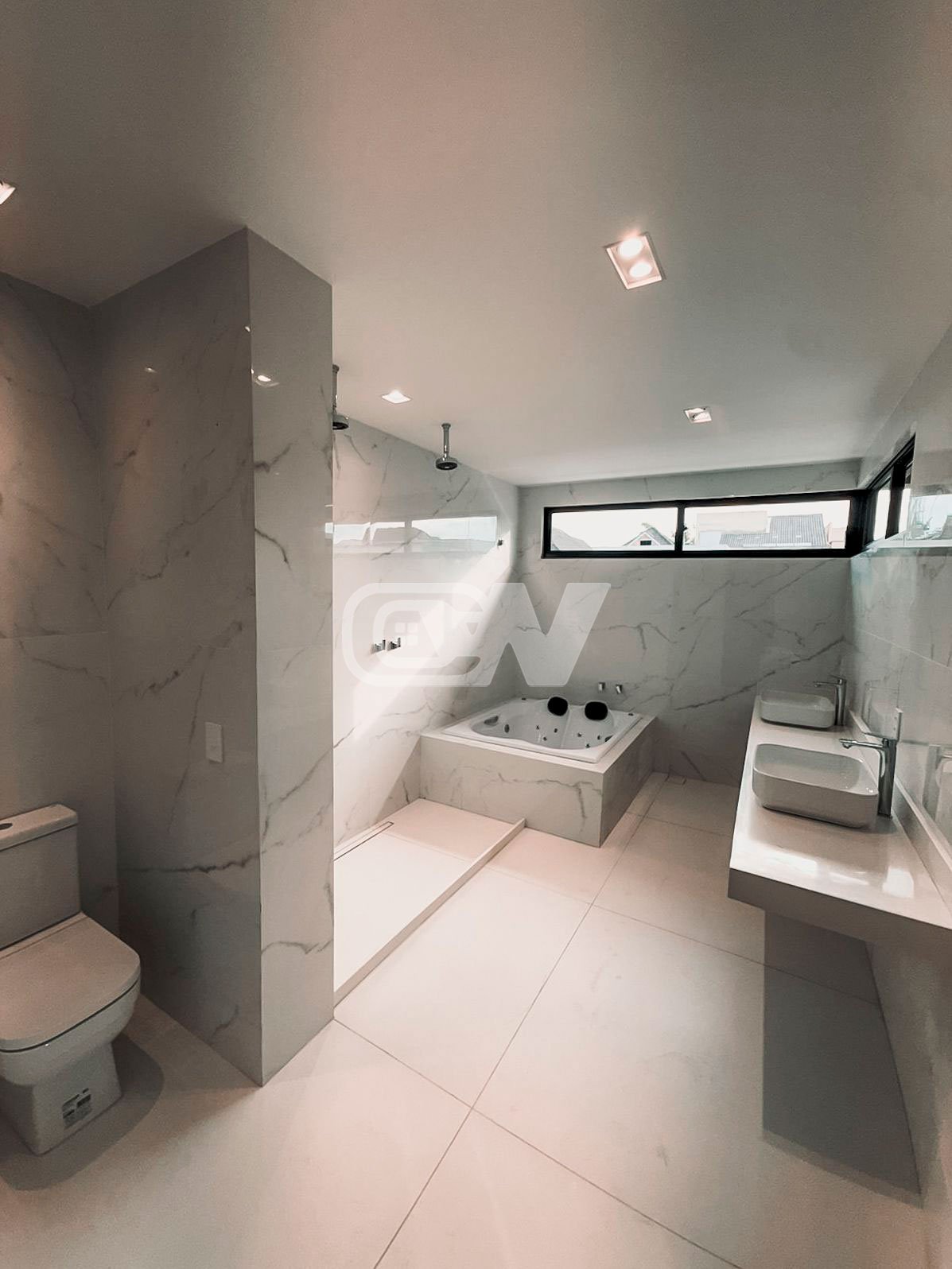 No segundo pavimento, encontram-se mais três suítes, todas com piso laminado, bancadas em mármore e sofisticados chuveiros de teto. A suíte master é um destaque à parte: extremamente espaçosa, conta com banheira de hidromassagem, dois chuveiros de teto, bancada em quartzo branco com duas cubas, um elegante closet e varanda privativa.