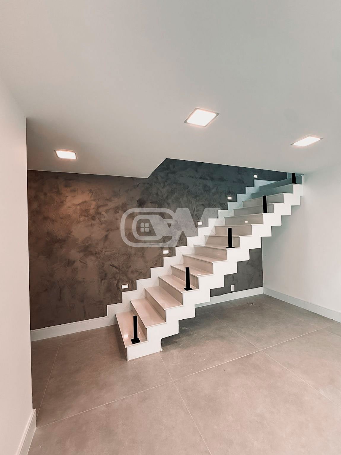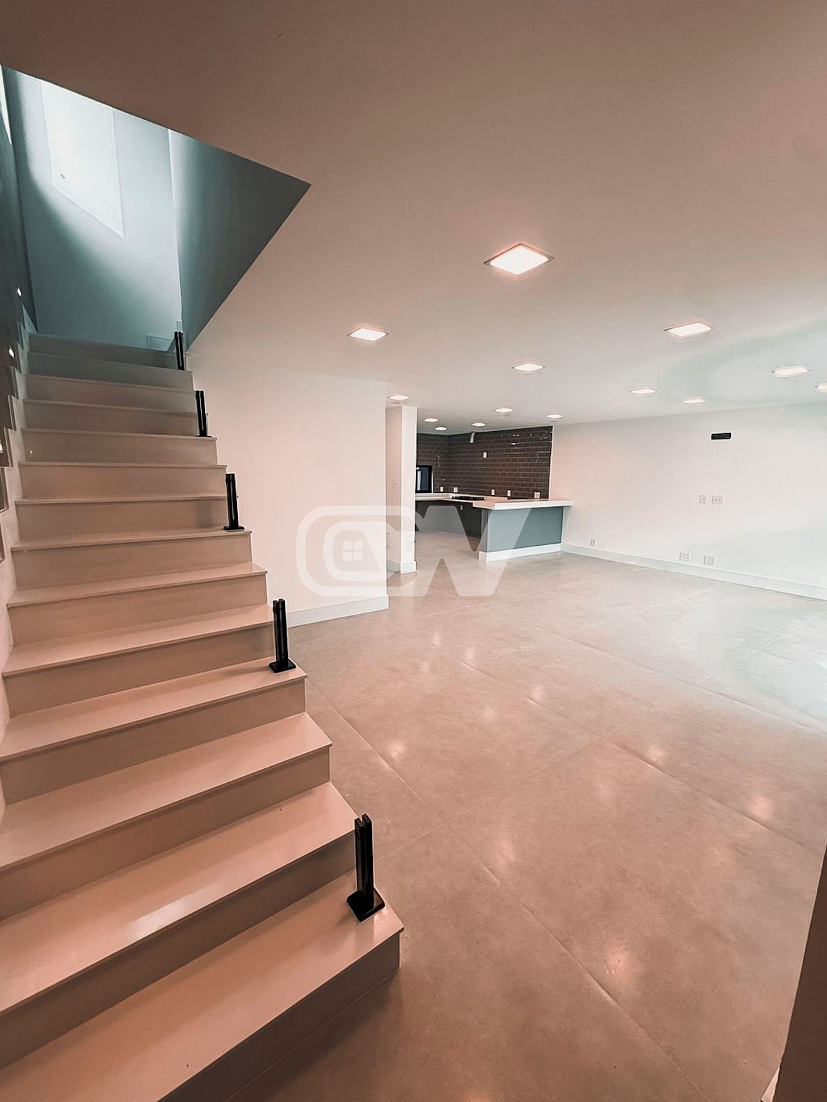 Na parte interna, o projeto em conceito aberto valoriza amplitude e sofisticação. A sala de estar integra-se harmoniosamente à sala de jantar e à cozinha, criando um ambiente moderno e funcional. Todo o piso em porcelanato de grandes formatos reforça a elegância do espaço. As bancadas da cozinha e a escada são em quartzo branco, agregando requinte e durabilidade. Ainda no primeiro pavimento, o imóvel dispõe de lavabo com cuba esculpida, uma confortável suíte térrea e lavanderia independente.