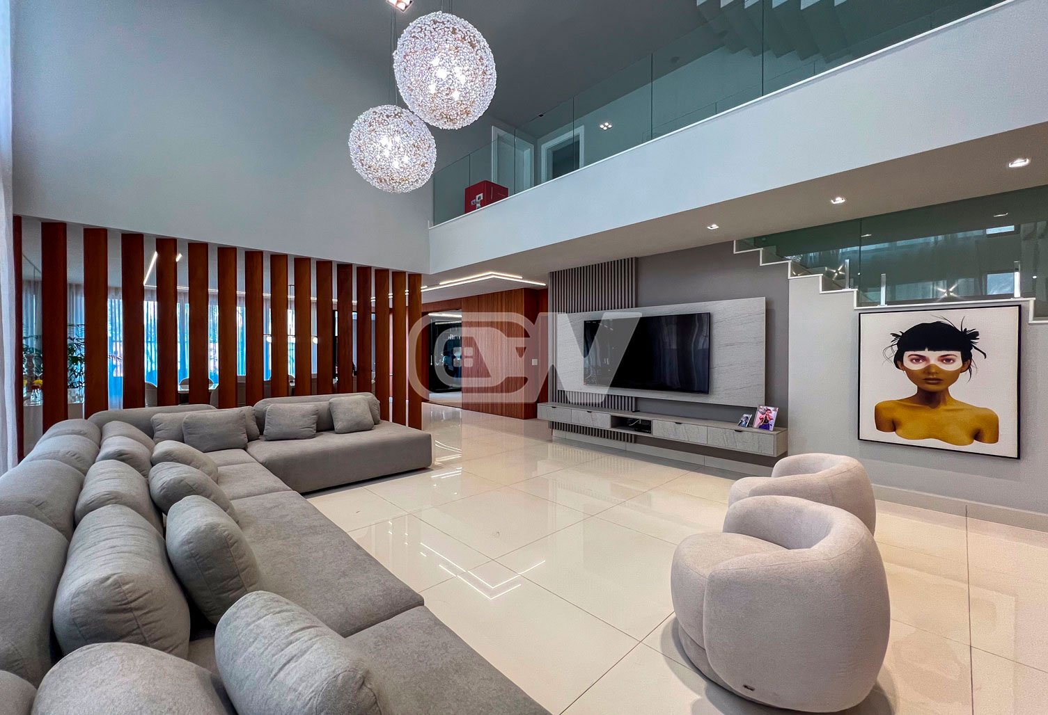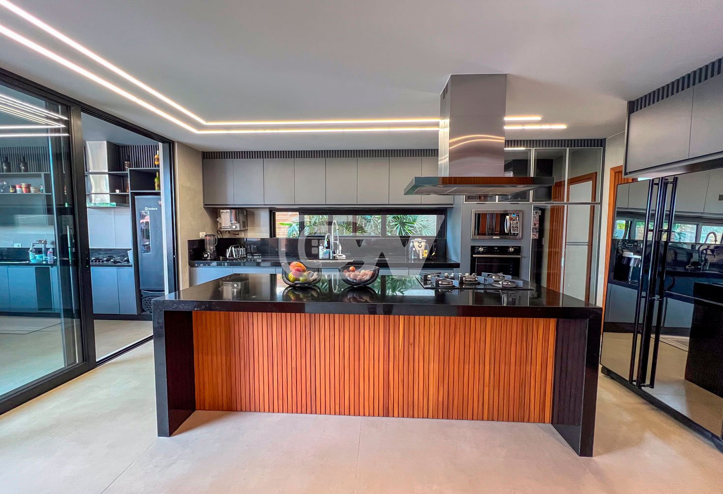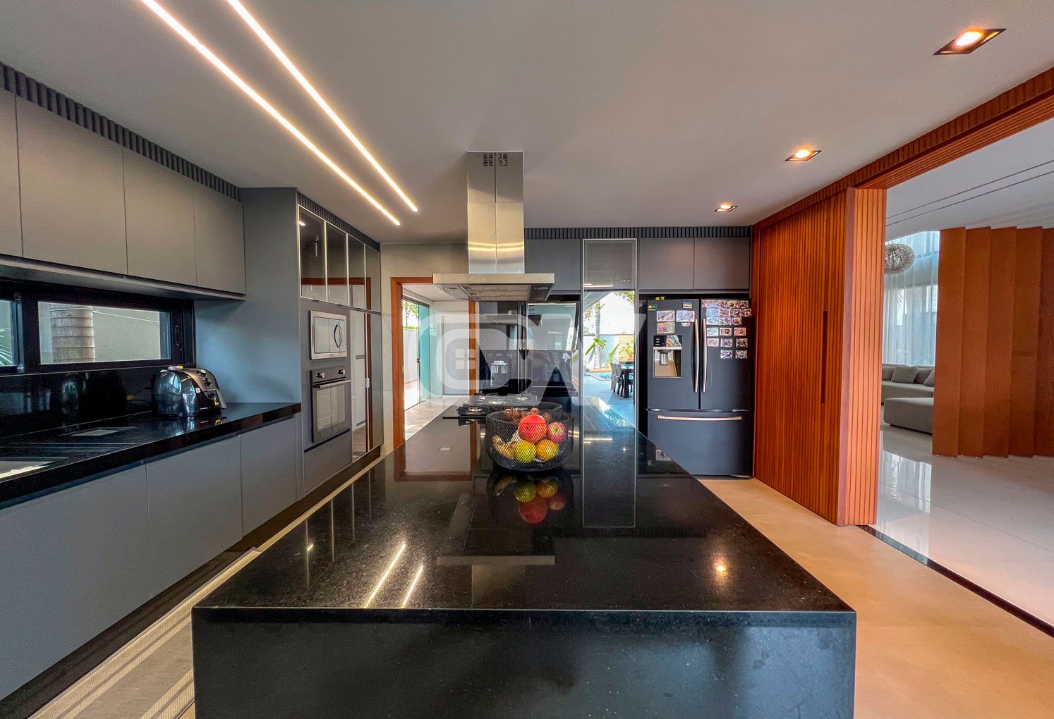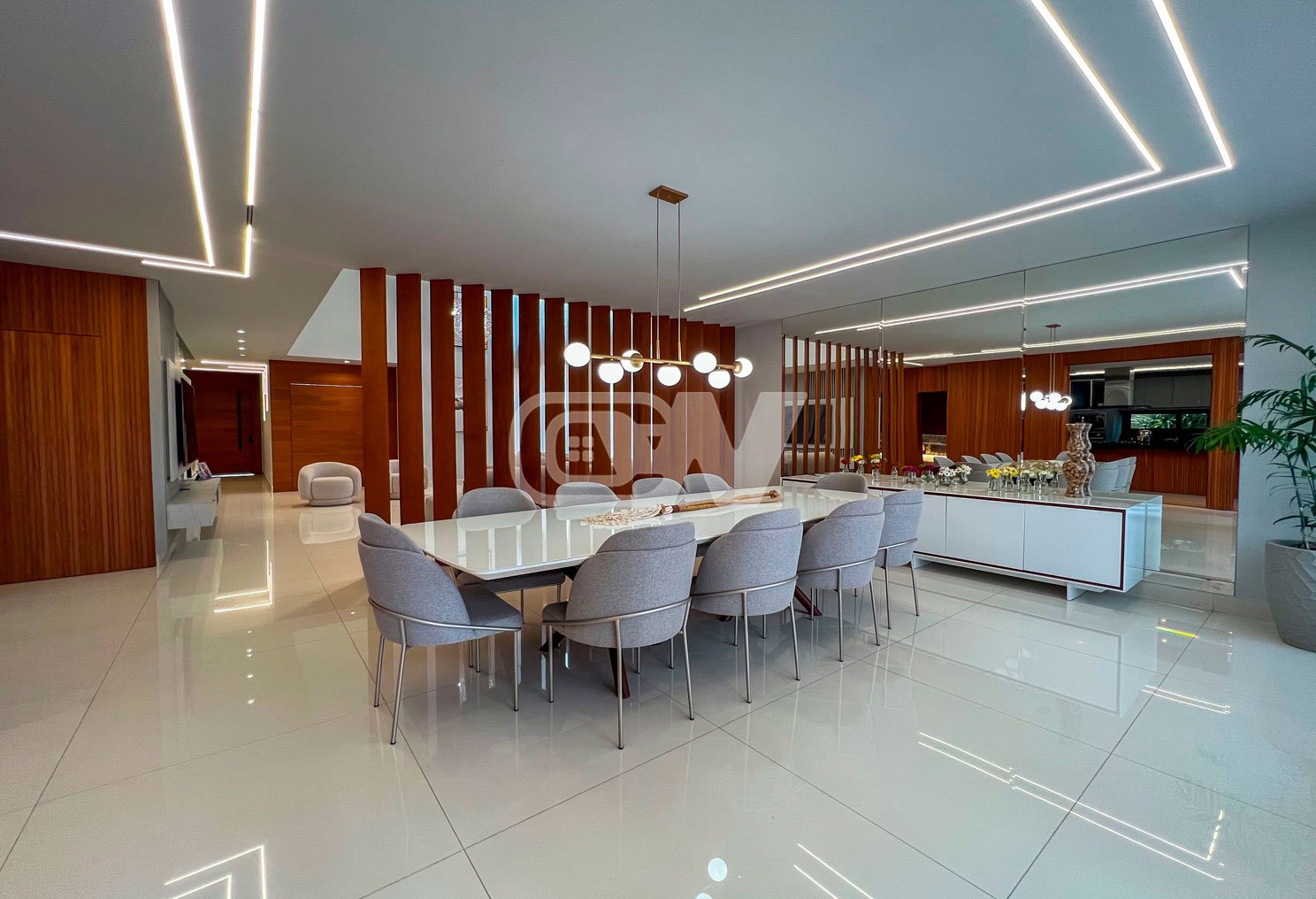1º Pavimento: Sala dividida em três ambientes, suíte térrea, sala de tv, lavabo com bancada em ônix, cozinha integrada com área gourmet e sala de jantar, área de serviço e dependência de empregada completa.