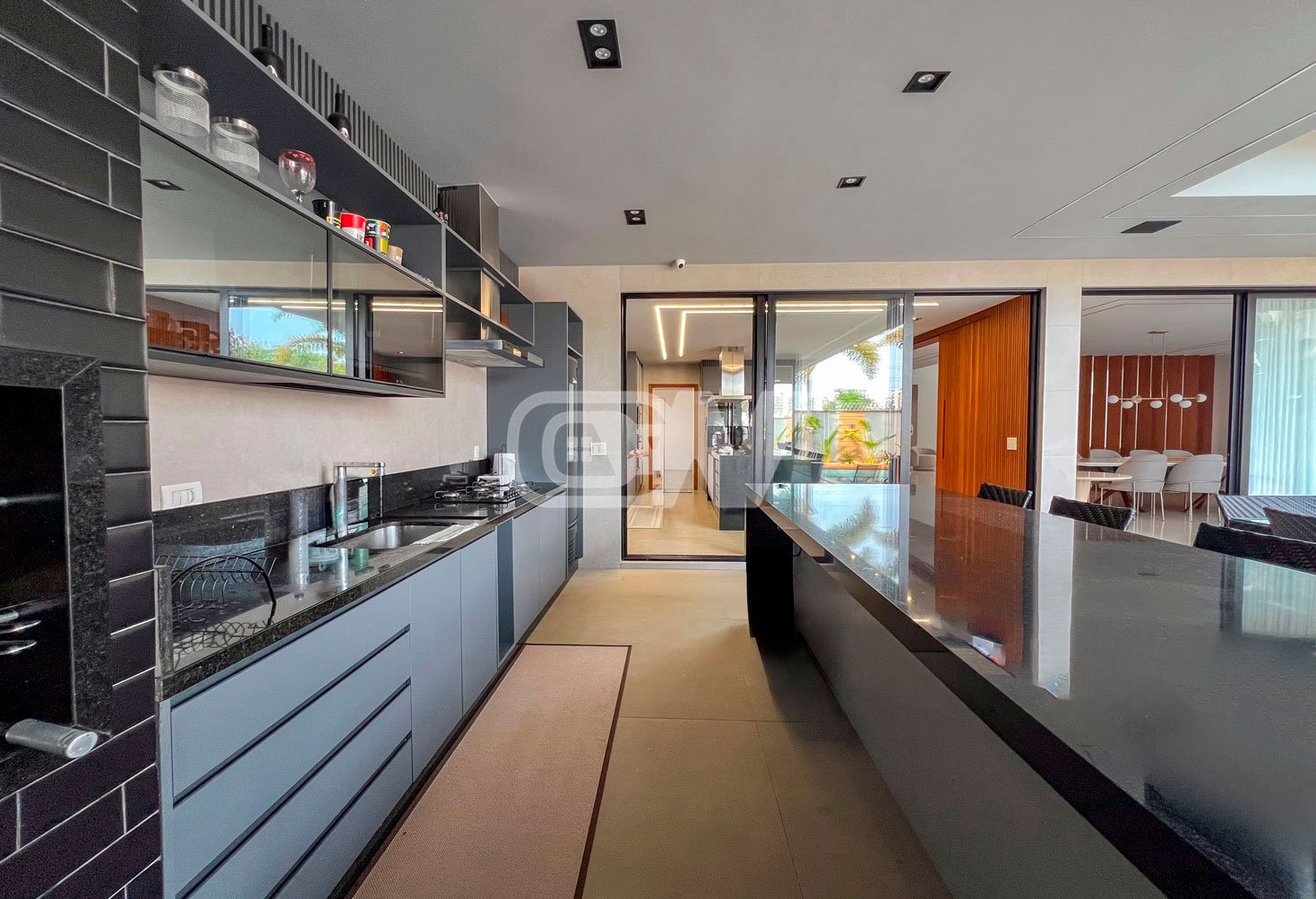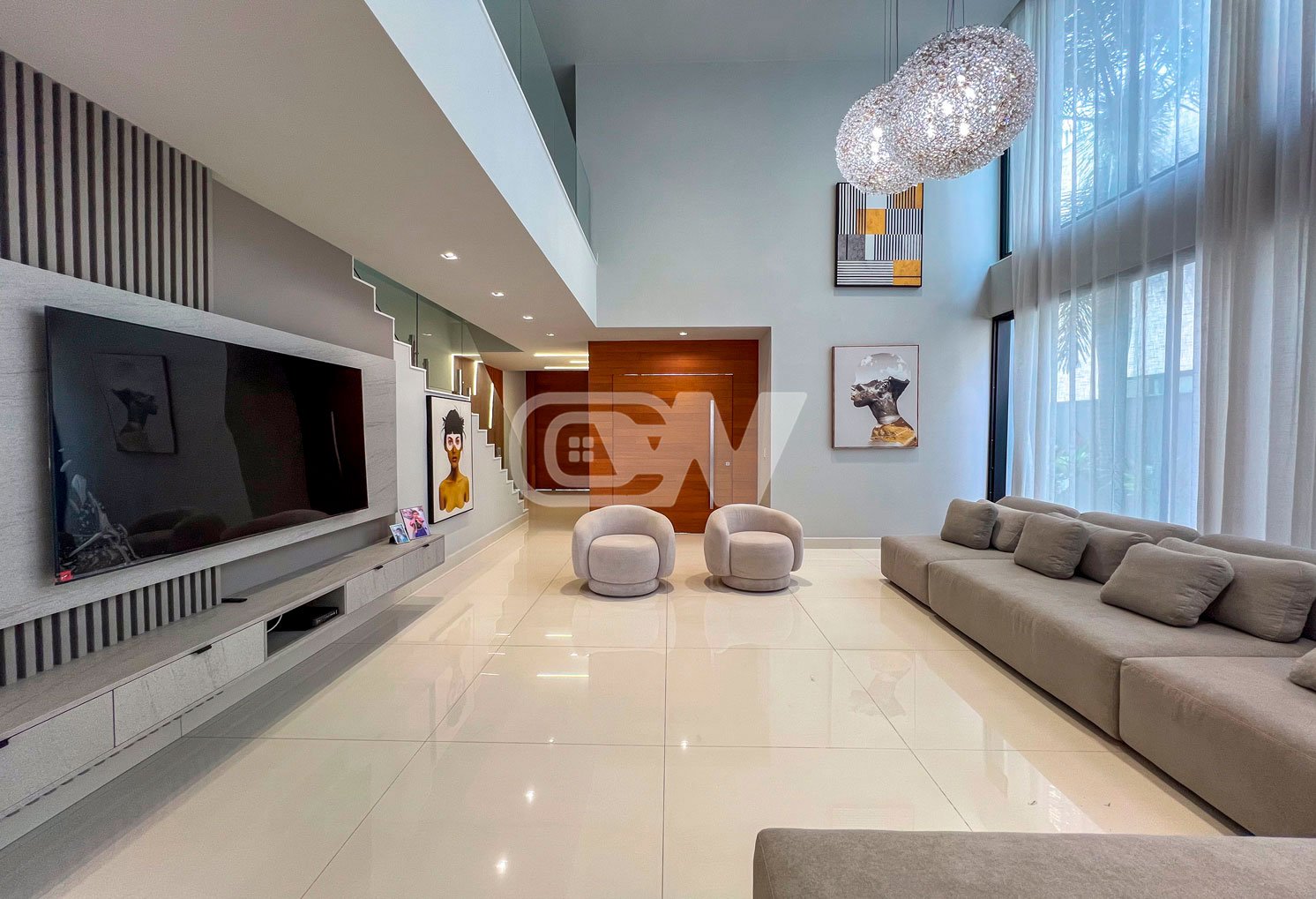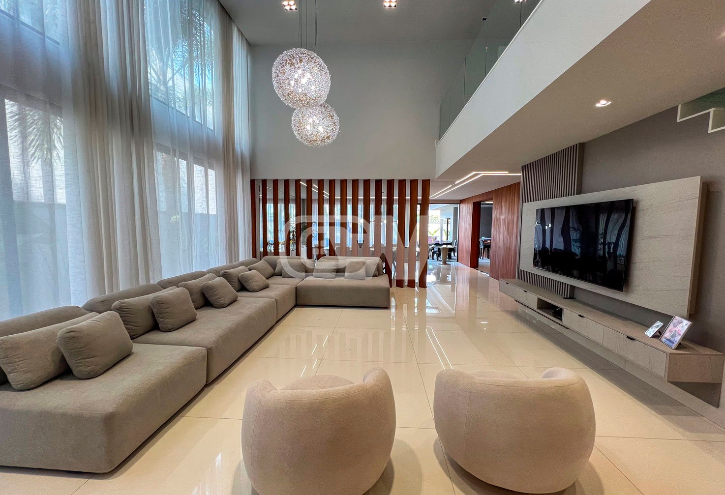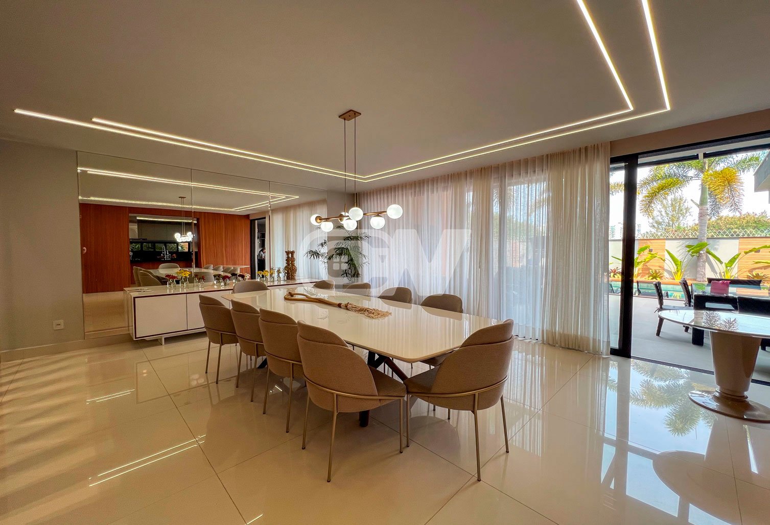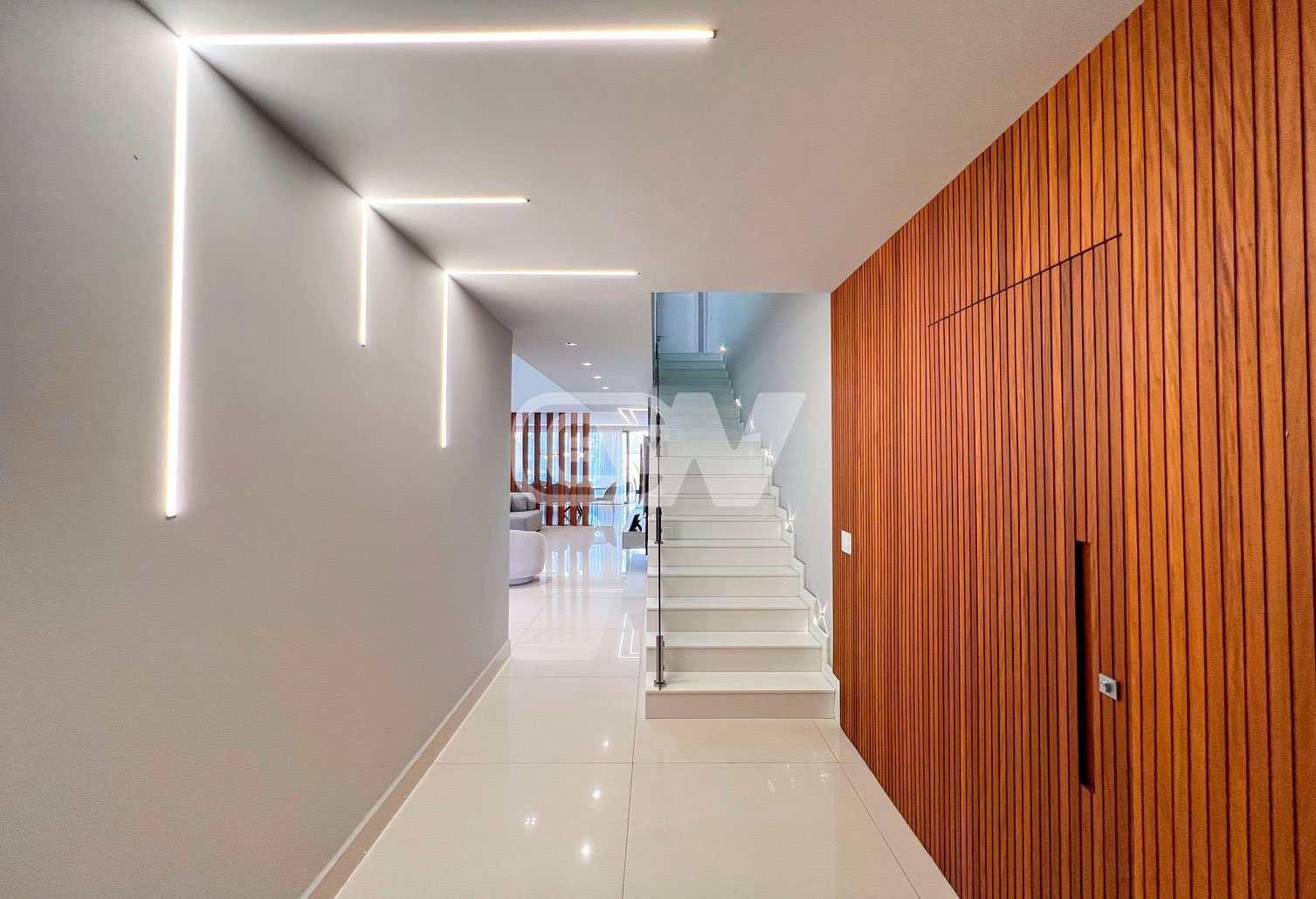 1º Pavimento: Sala dividida em três ambientes, suíte térrea, sala de tv, lavabo com bancada em ônix, cozinha integrada com área gourmet e sala de jantar, área de serviço e dependência de empregada completa.