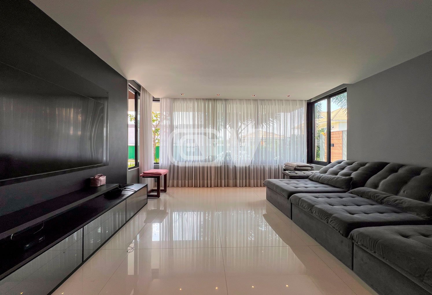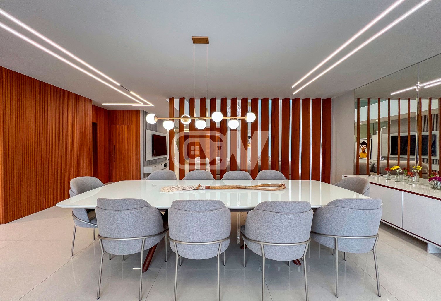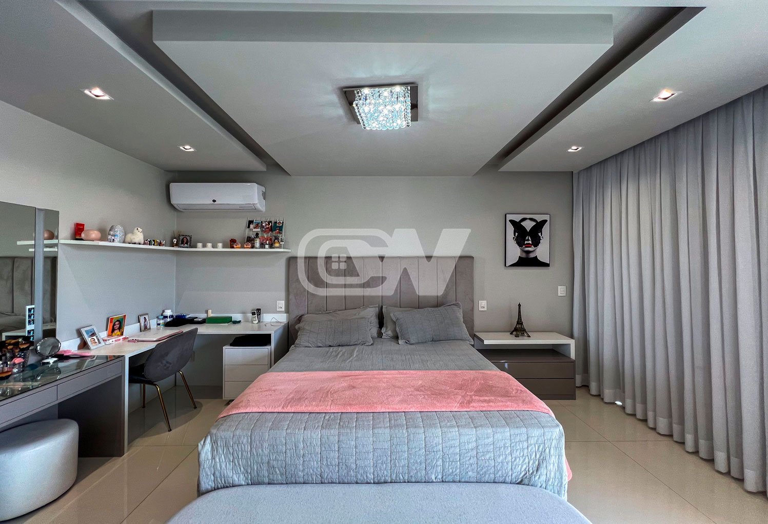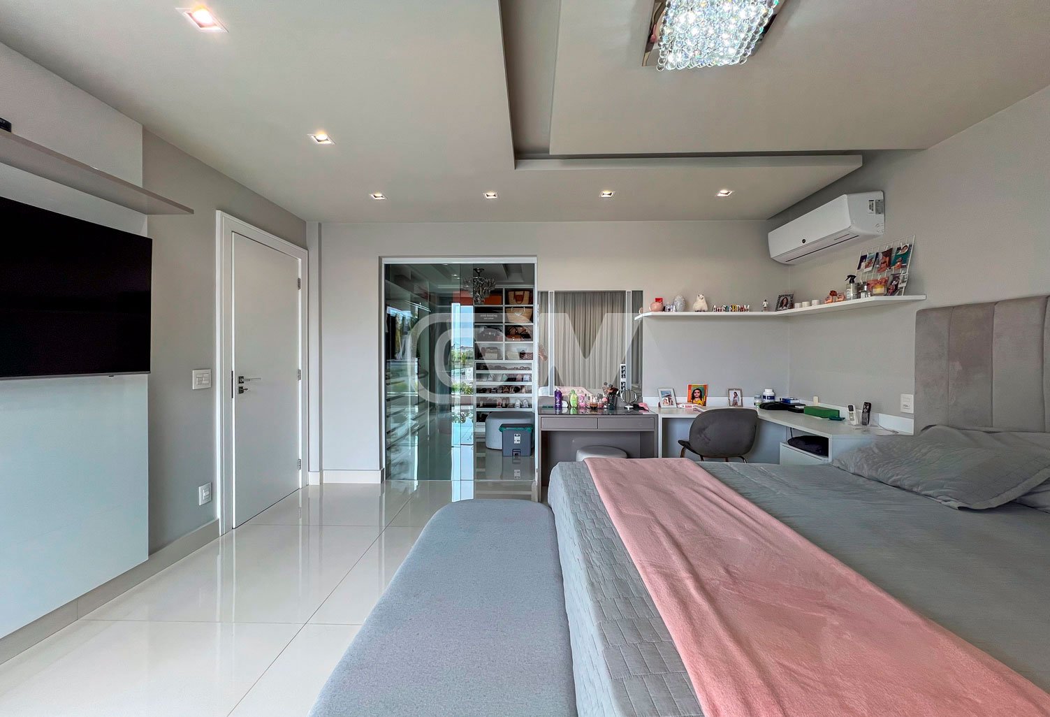 1º Pavimento: Sala dividida em três ambientes, suíte térrea, sala de tv, lavabo com bancada em ônix, cozinha integrada com área gourmet e sala de jantar, área de serviço e dependência de empregada completa.