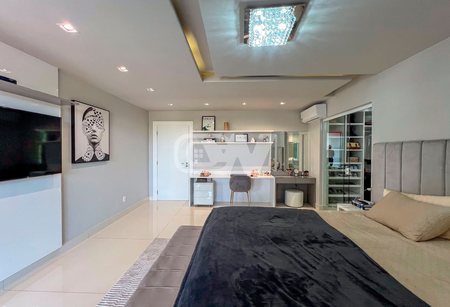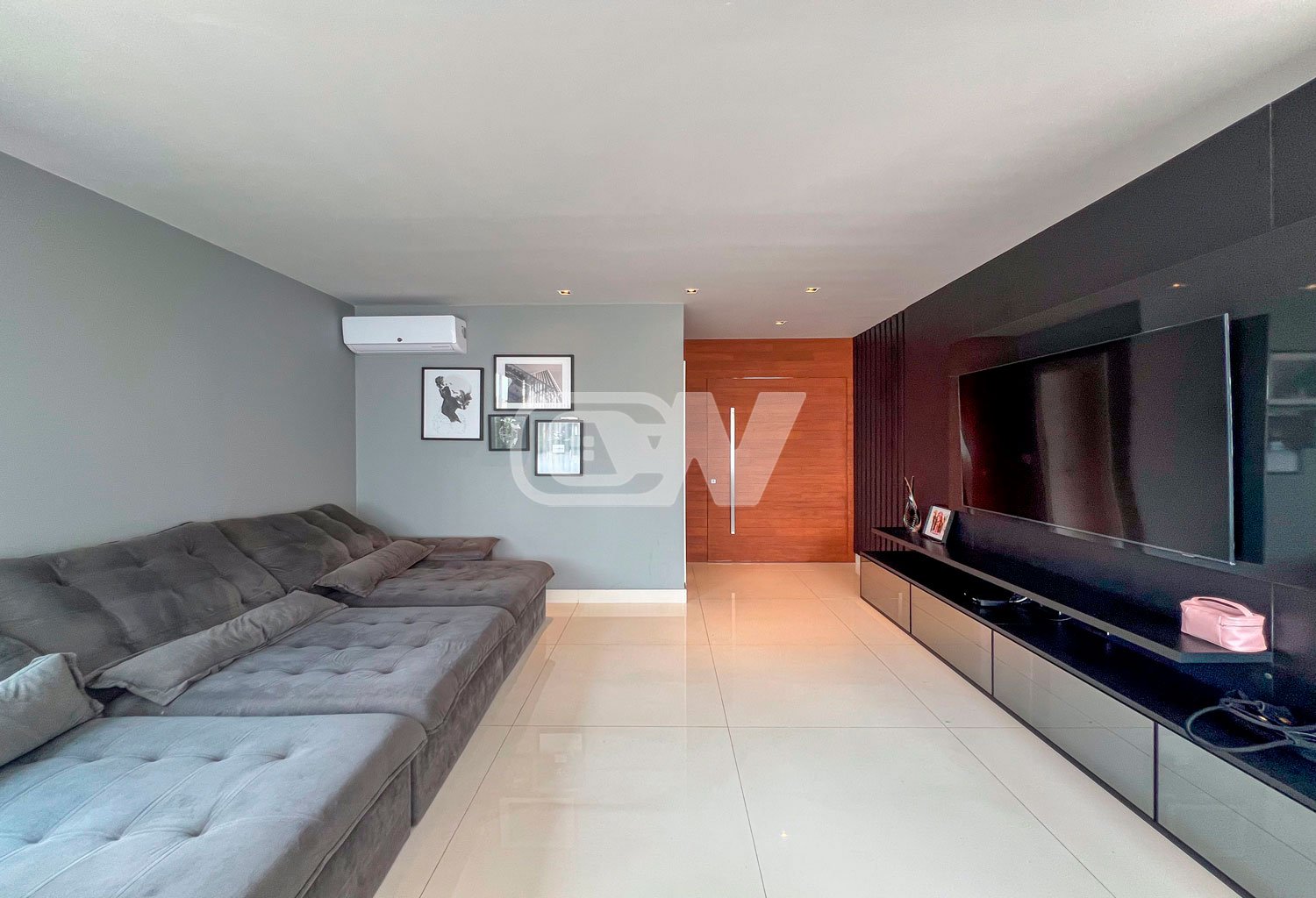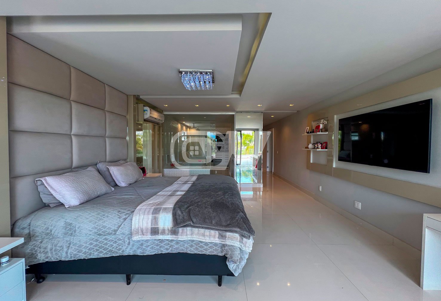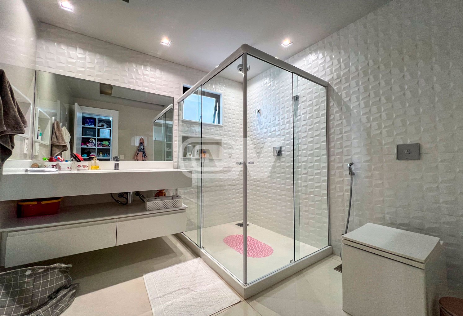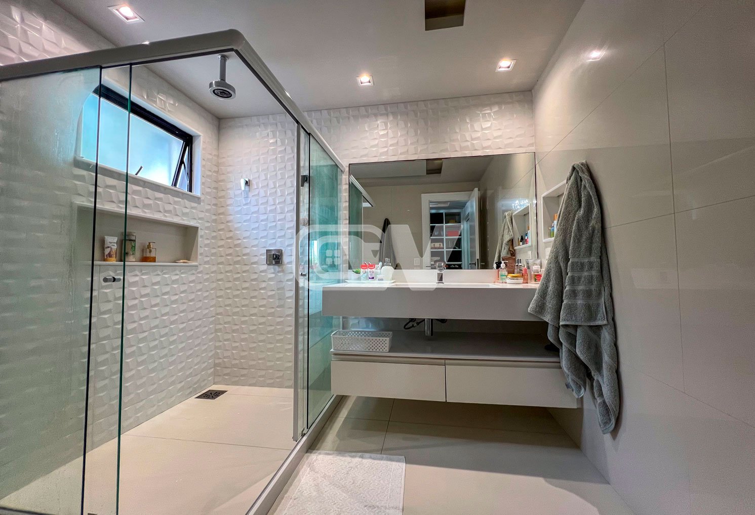 1º Pavimento: Sala dividida em três ambientes, suíte térrea, sala de tv, lavabo com bancada em ônix, cozinha integrada com área gourmet e sala de jantar, área de serviço e dependência de empregada completa.