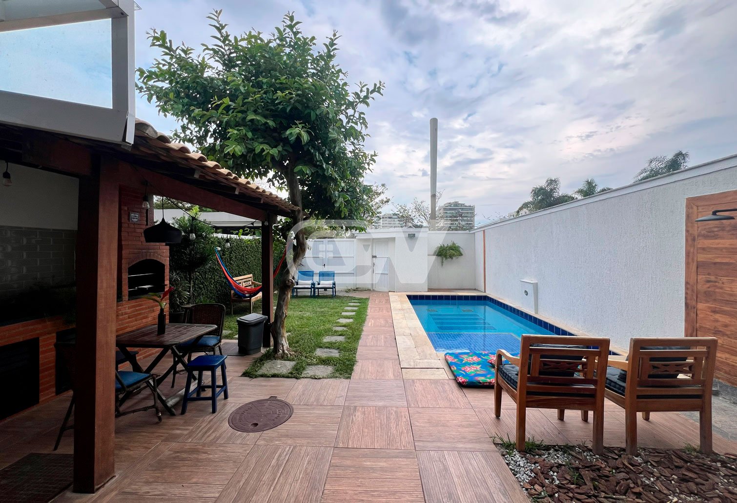 Área de Lazer: Varanda coberta com área gourmet com de churrasqueira, banheiro de apoio, piscina, garagem e jardim.