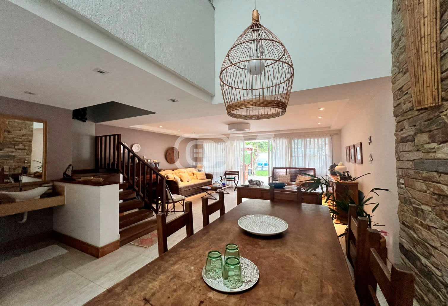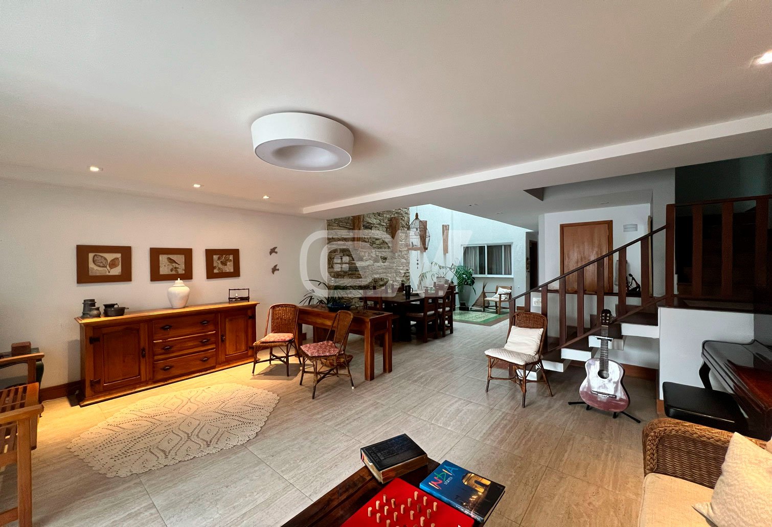 1º Pavimento: Sala em vários ambientes, suíte térrea, lavabo, ampla copa cozinha com armários planejados, área de serviço e dependência completa.