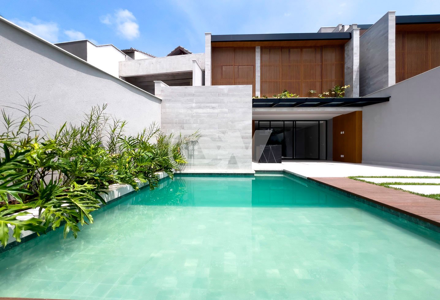 Lazer na frente da casa possui piscina com cascata, sauna com mergulho, banheiro, espaço gourmet com churrasqueira e forno a lenha.