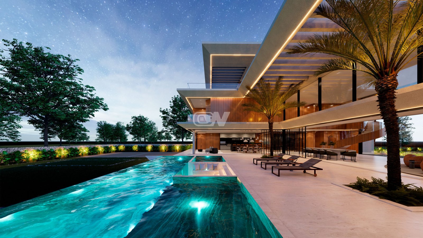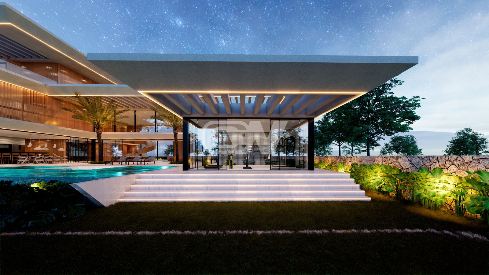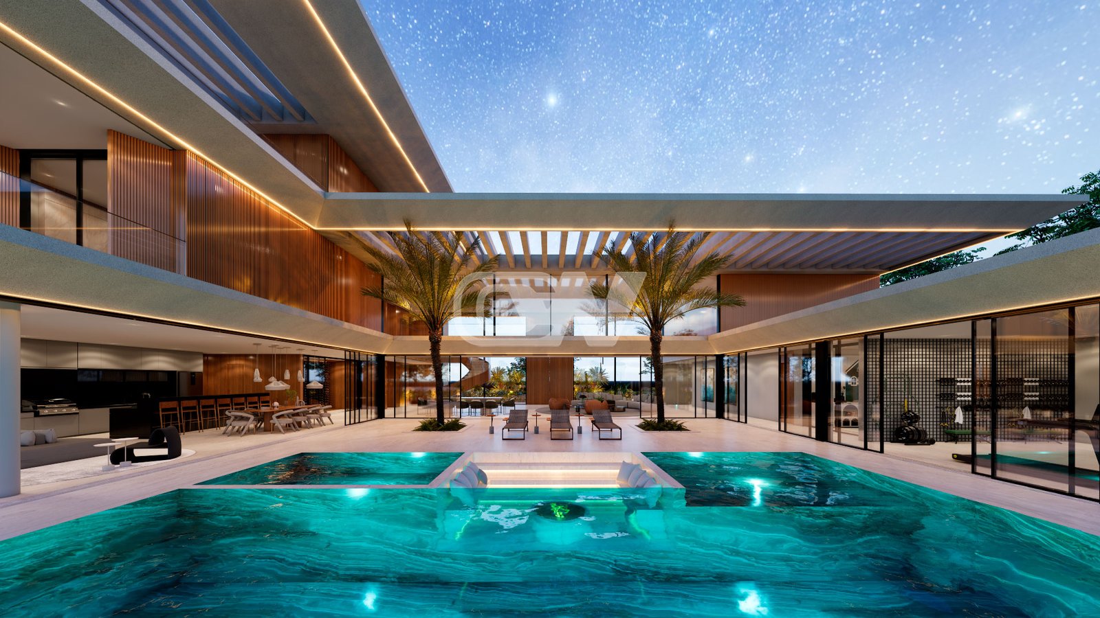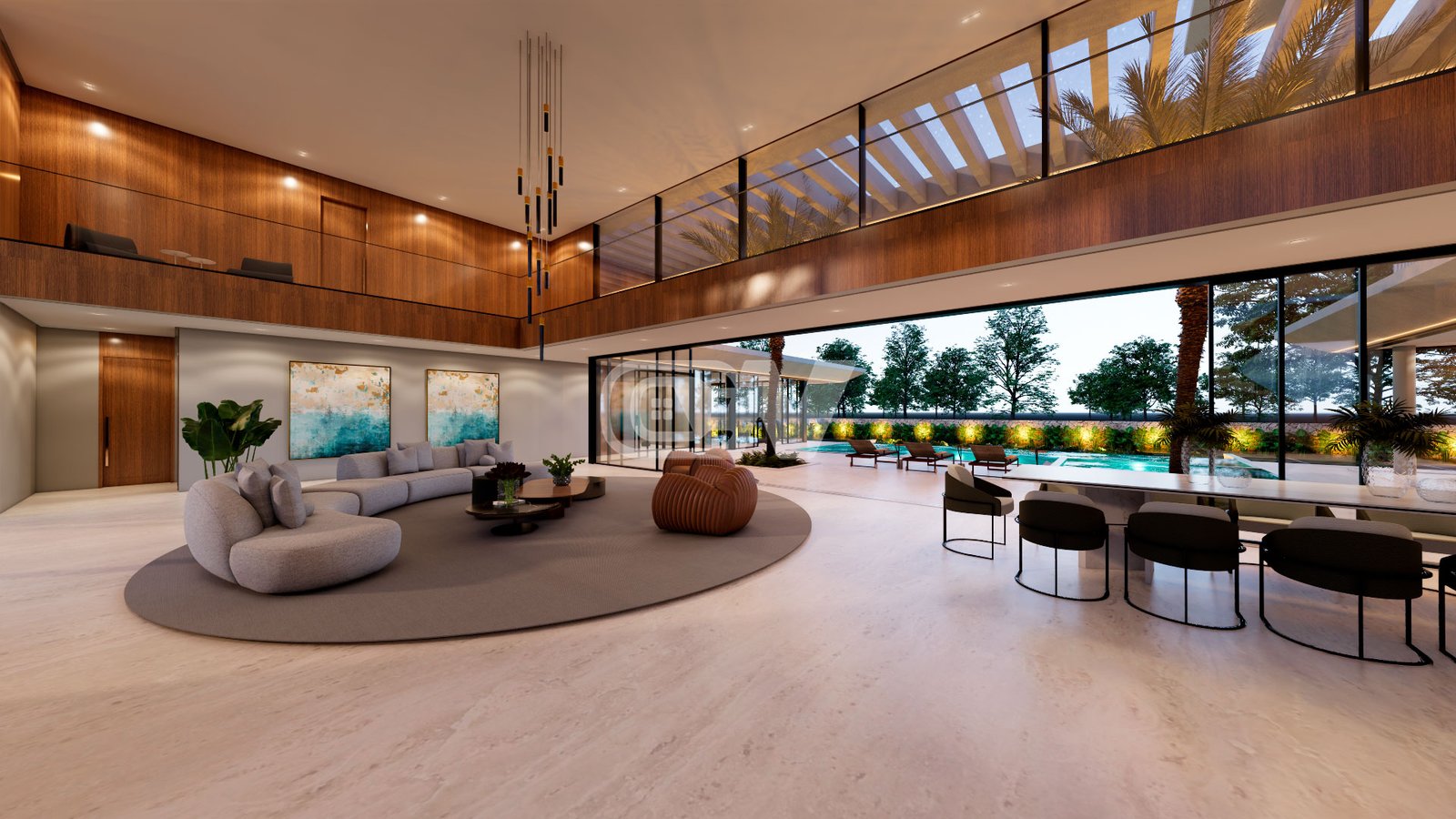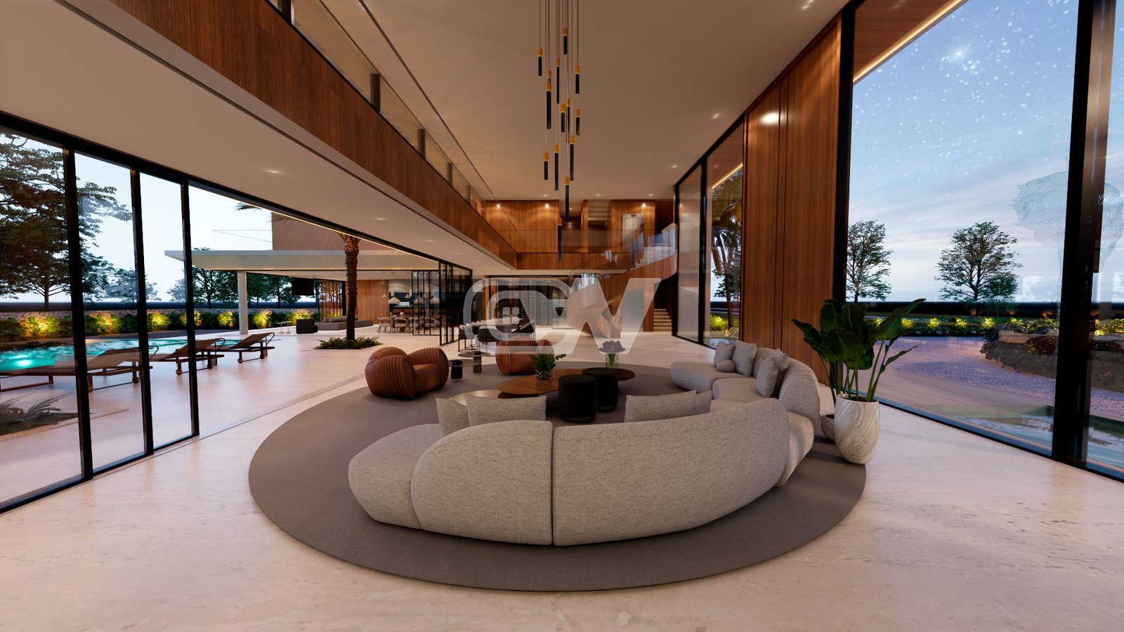 1º Pavimento: Amplo living com múltiplos ambientes, privilegiado por excelente iluminação natural e ventilação, além de um imponente pé-direito duplo. Hall com elevador atendendo todos os níveis (do subsolo ao terceiro pavimento). Conta ainda com adega, lavabo, cinema planejado e escritório.