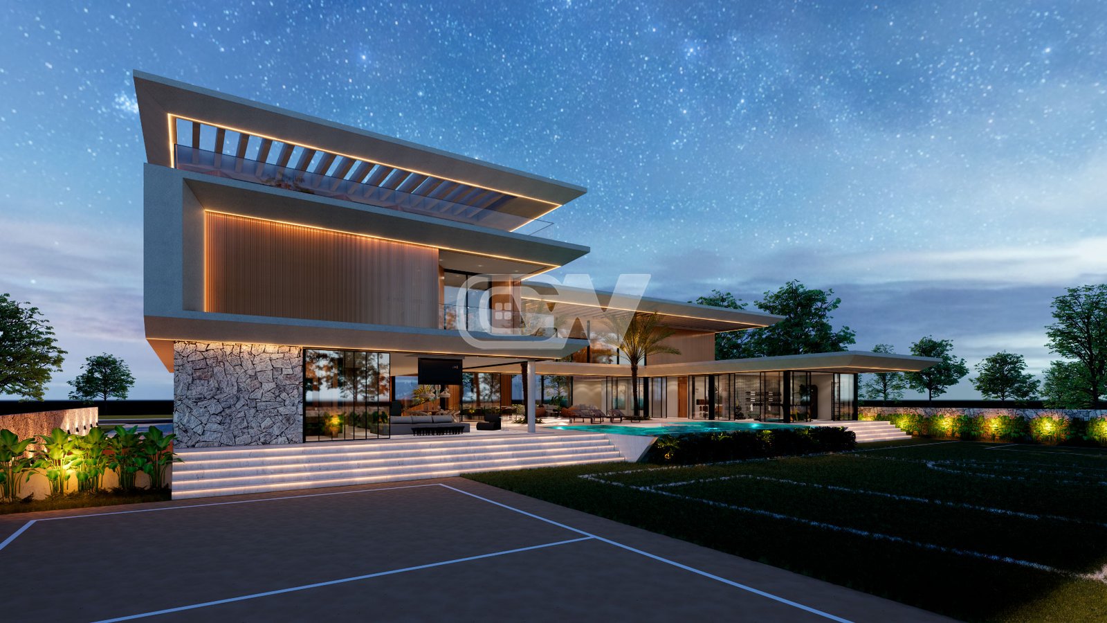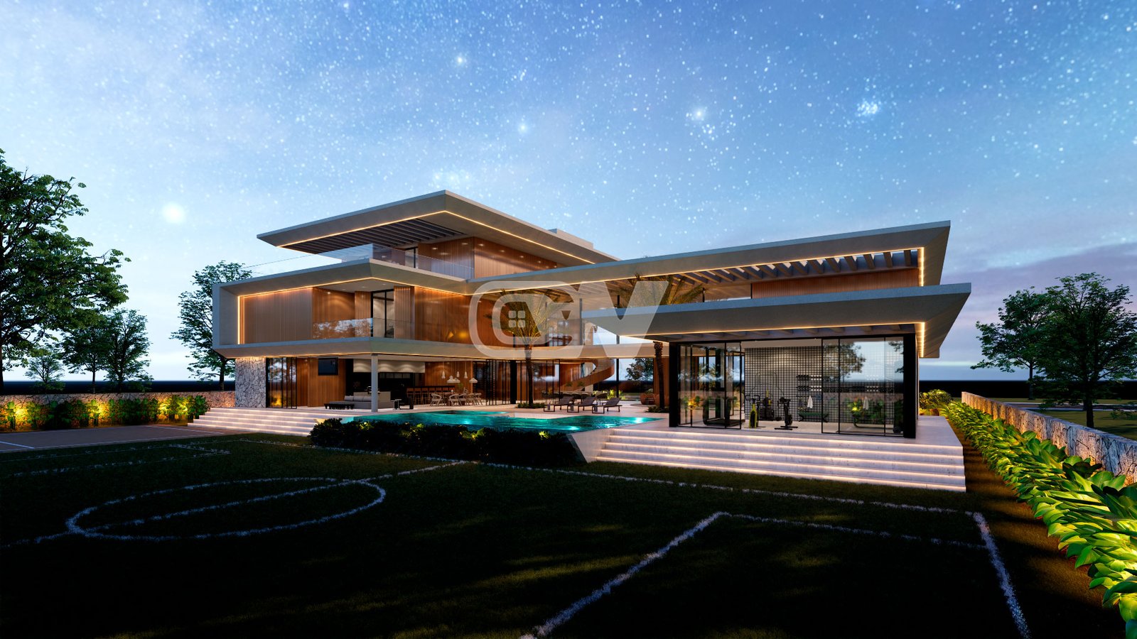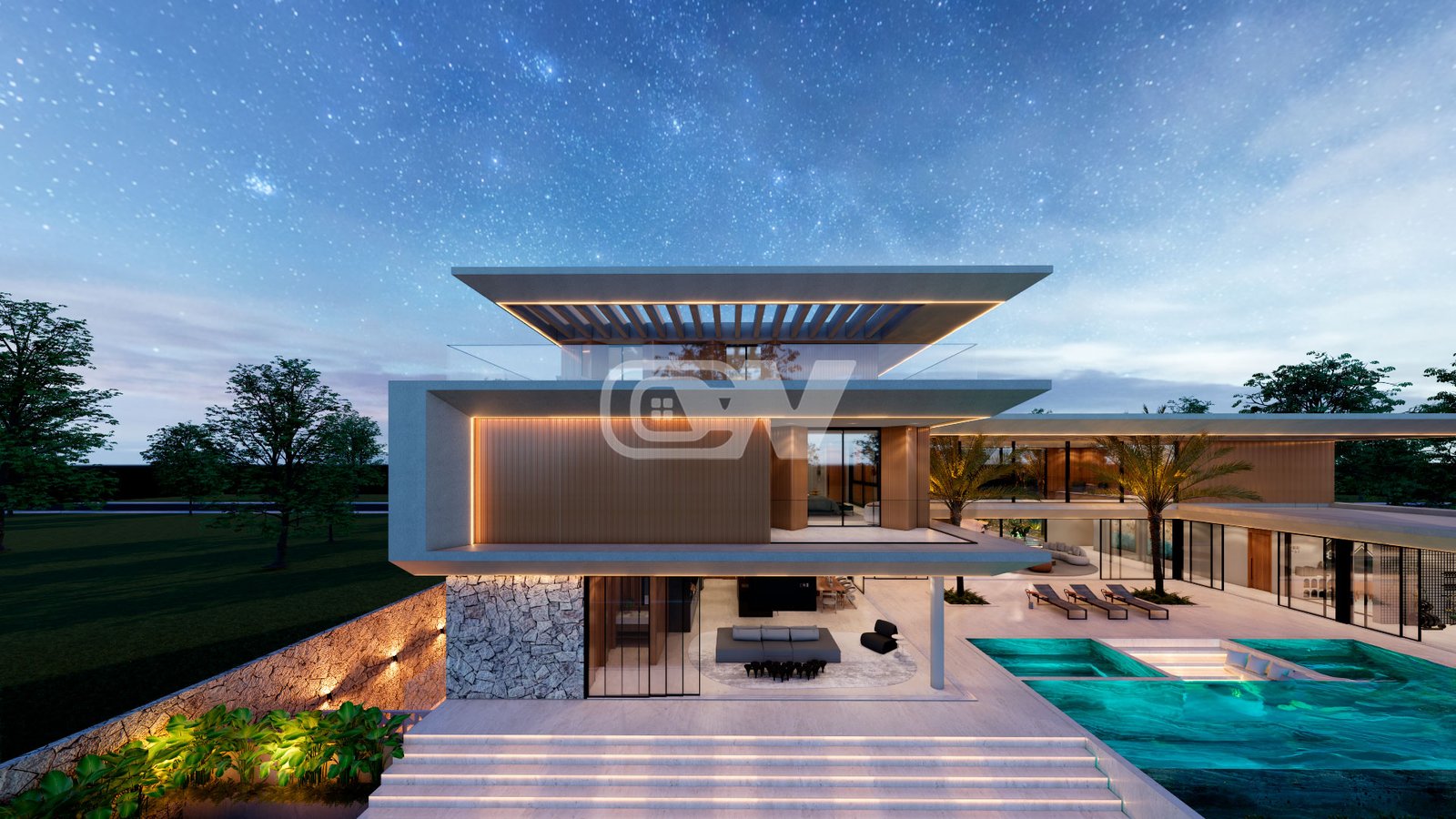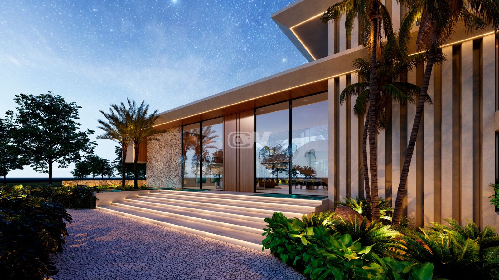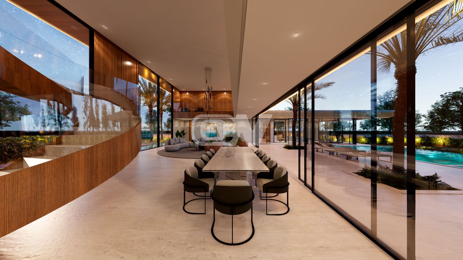 1º Pavimento: Amplo living com múltiplos ambientes, privilegiado por excelente iluminação natural e ventilação, além de um imponente pé-direito duplo. Hall com elevador atendendo todos os níveis (do subsolo ao terceiro pavimento). Conta ainda com adega, lavabo, cinema planejado e escritório.