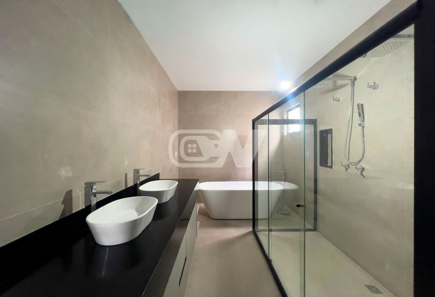2º Pavimento: Área íntima composta por 4 suítes, sendo a suíte master um verdadeiro refúgio, com mais de 90 m², incluindo quarto amplo, sala íntima, closet generoso, banheiro com cuba e chuveiro duplos, banheira, vaso sanitário reservado e varandão privativo. As demais suítes possuem metragens entre 15 m² e 20 m², todas com espaço para closet e banheiros amplos. O pavimento ainda conta com rouparia, home office no mezzanino e circulação com vista para o jardim interno.