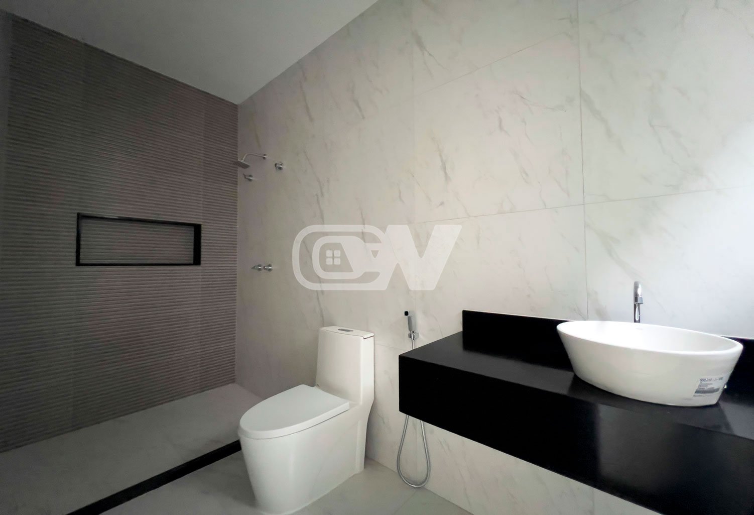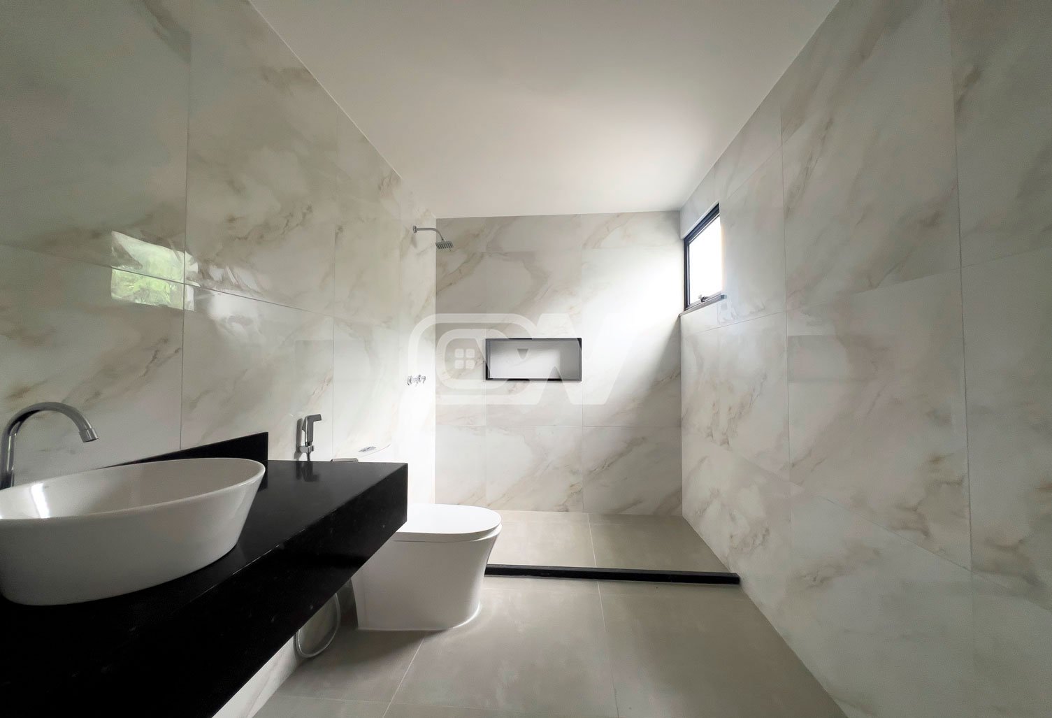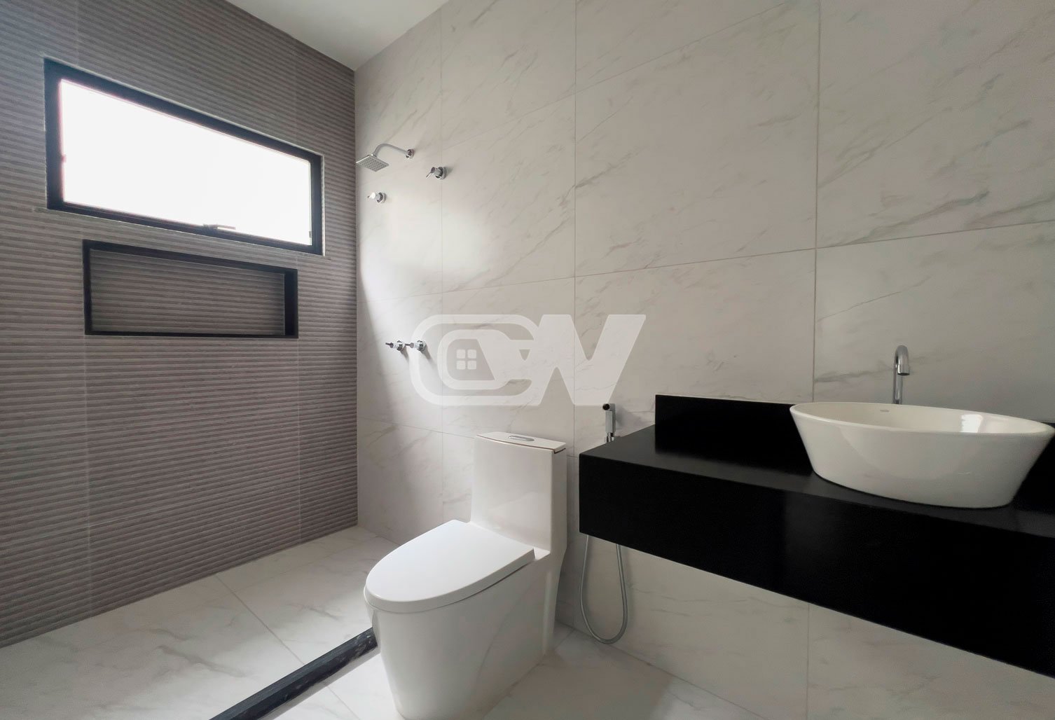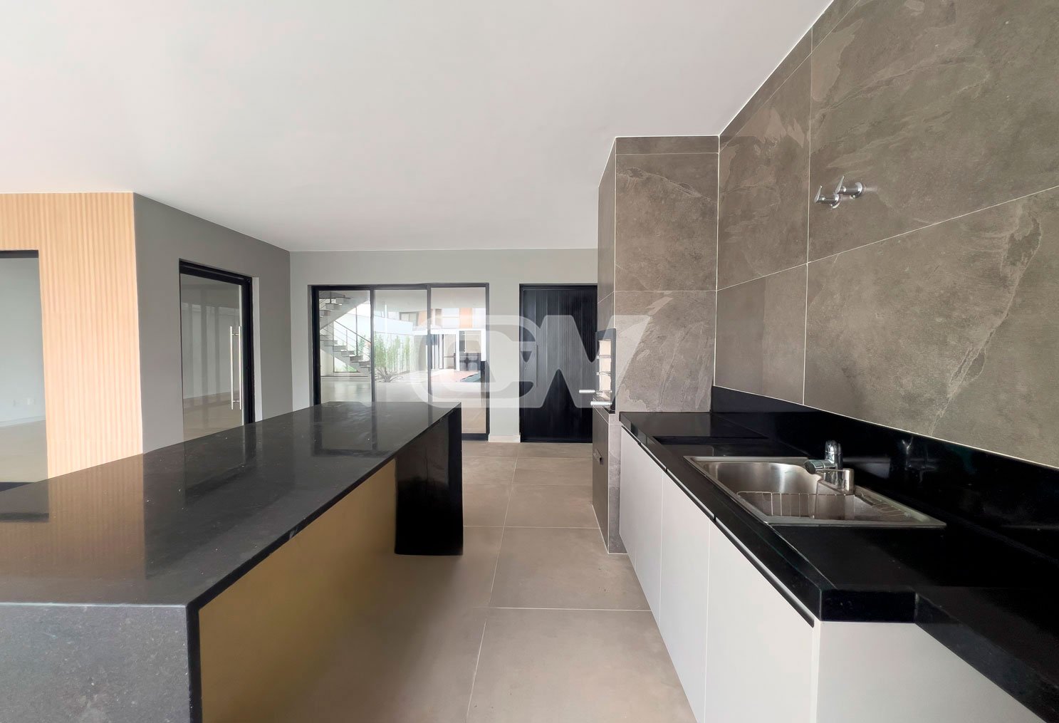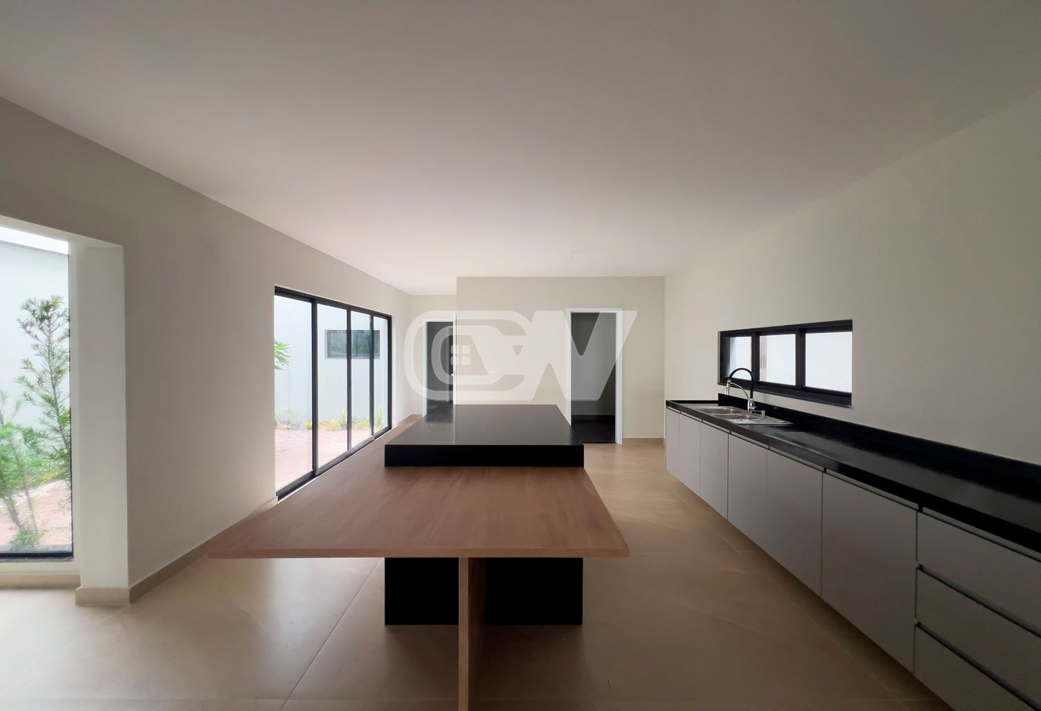 Cozinha moderna com ilha central, despensa, banheiro de apoio e acesso ao jardim interno. Suíte térrea versátil, ideal para escritório. Área de serviço e depósito, com possibilidade de uso como dependência.