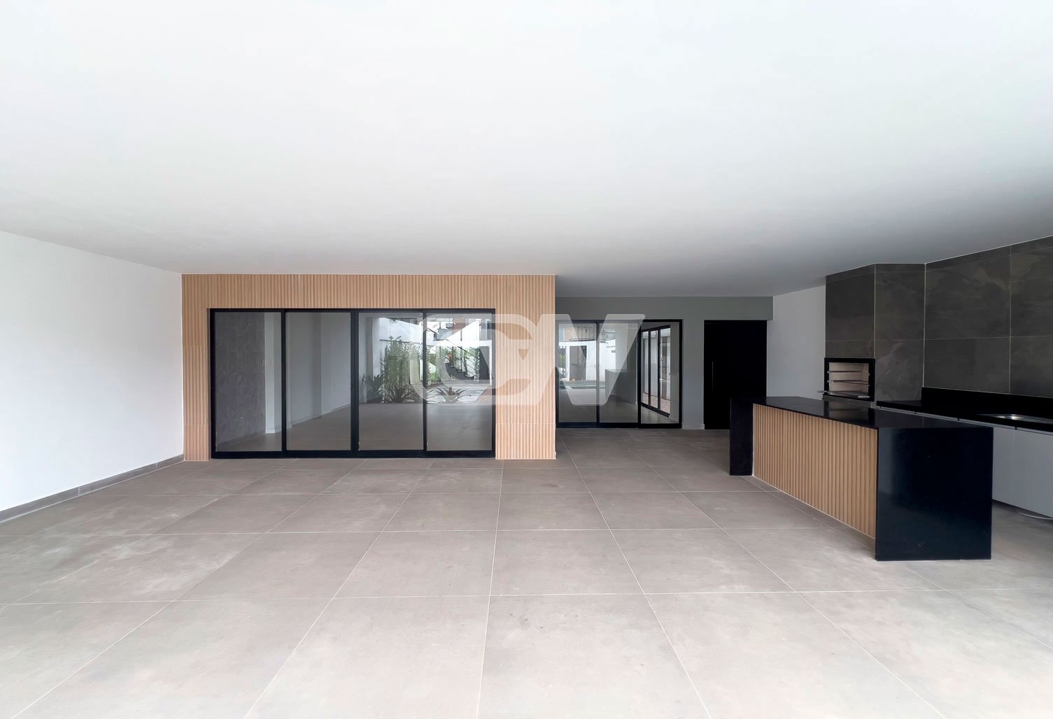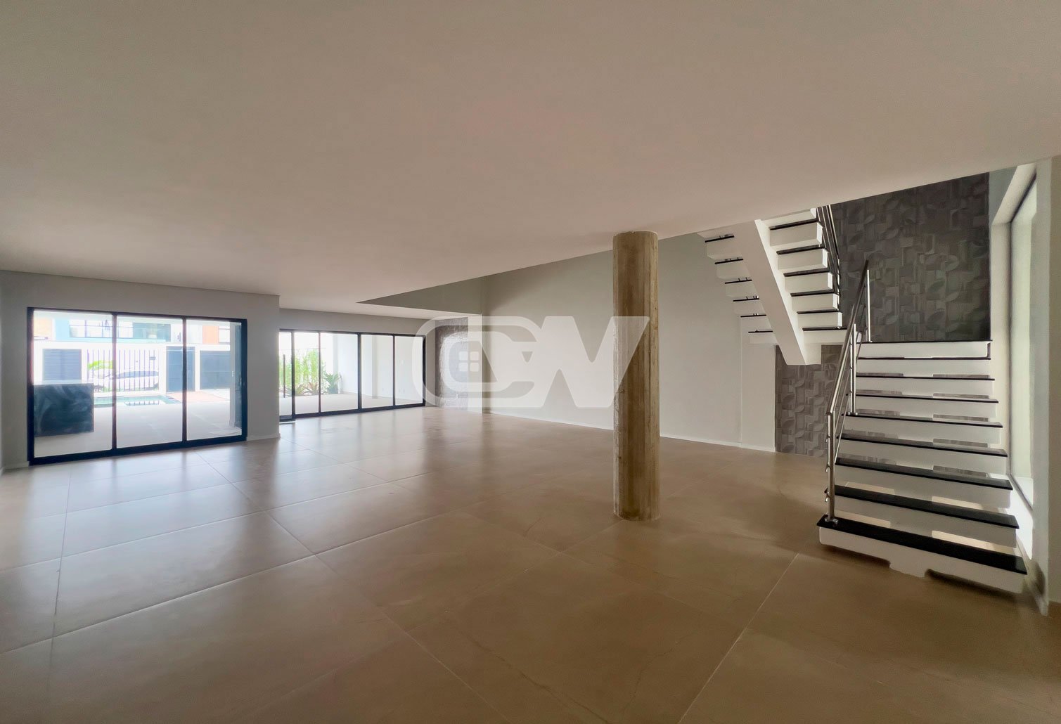 1° Pavimento: Área social marcada por imponência e integração. Sala com aproximadamente 100 m², distribuída em vários ambientes, pé-direito duplo e portas de correr que se abrem para a varanda gourmet e circulação lateral externa.