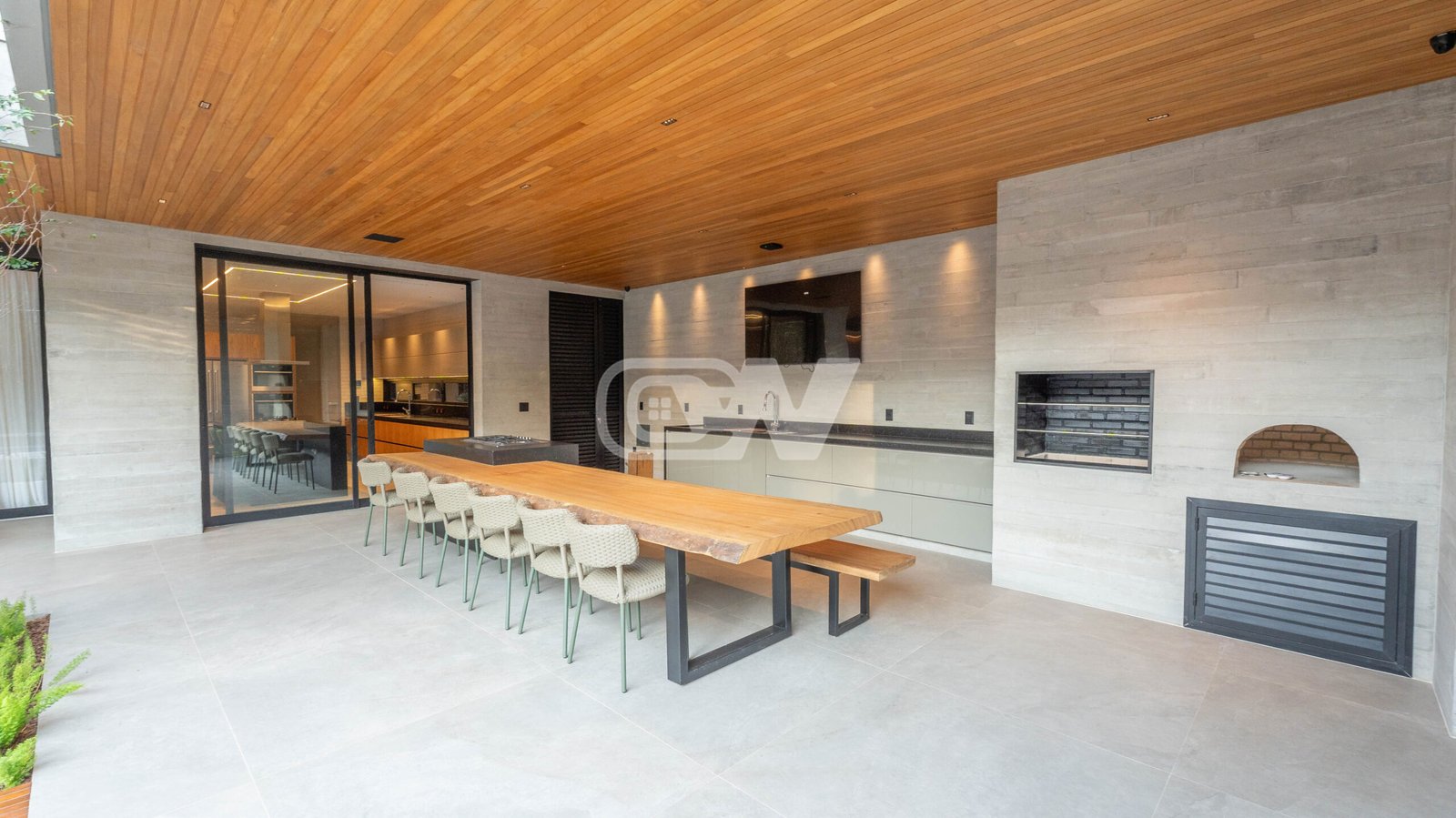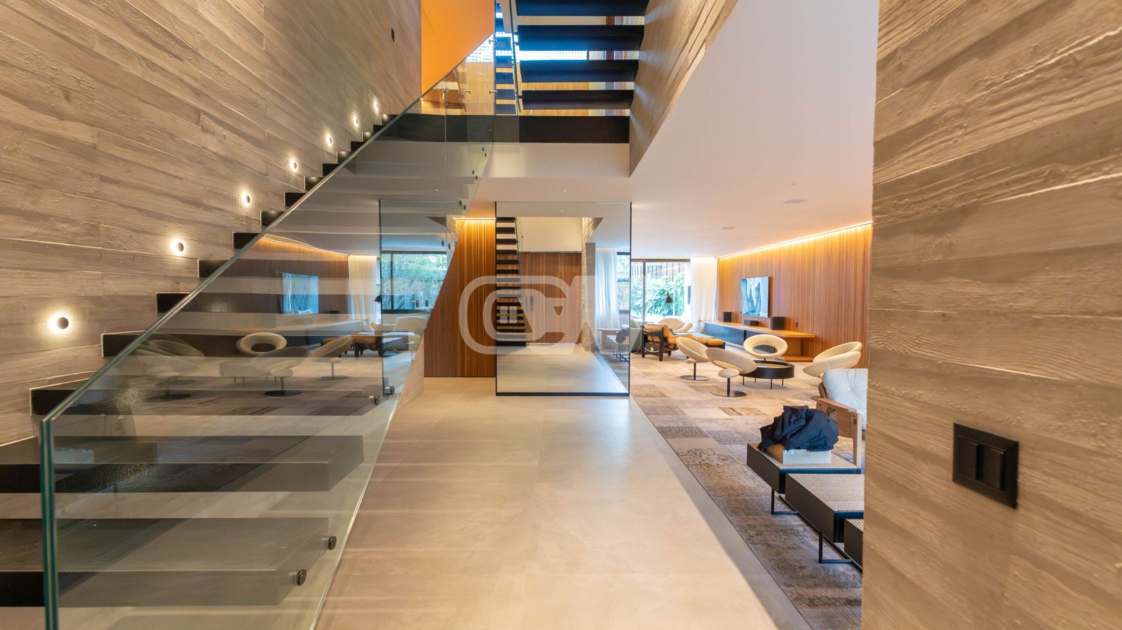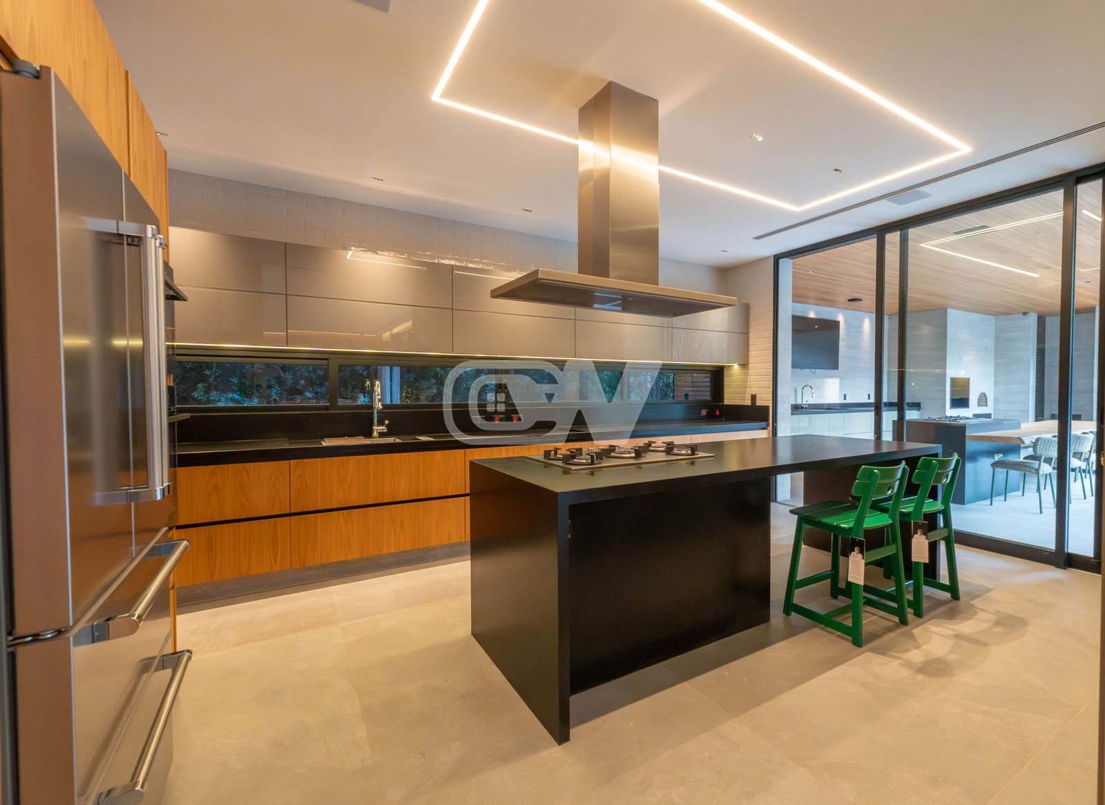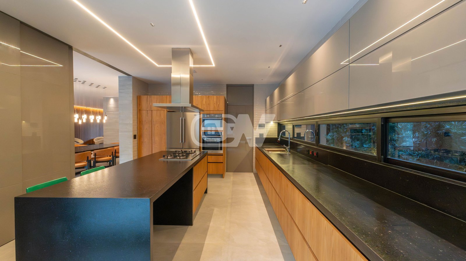 1º Pavimento: Ampla sala em vários ambientes, com projeto de iluminação, climatizada com sistema vrf, lavabo, suíte térrea, ampla copa cozinha com ilha integrada com a área gourmet, despensa, área de serviço e dependência completa.