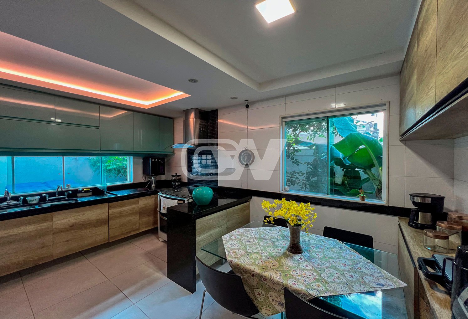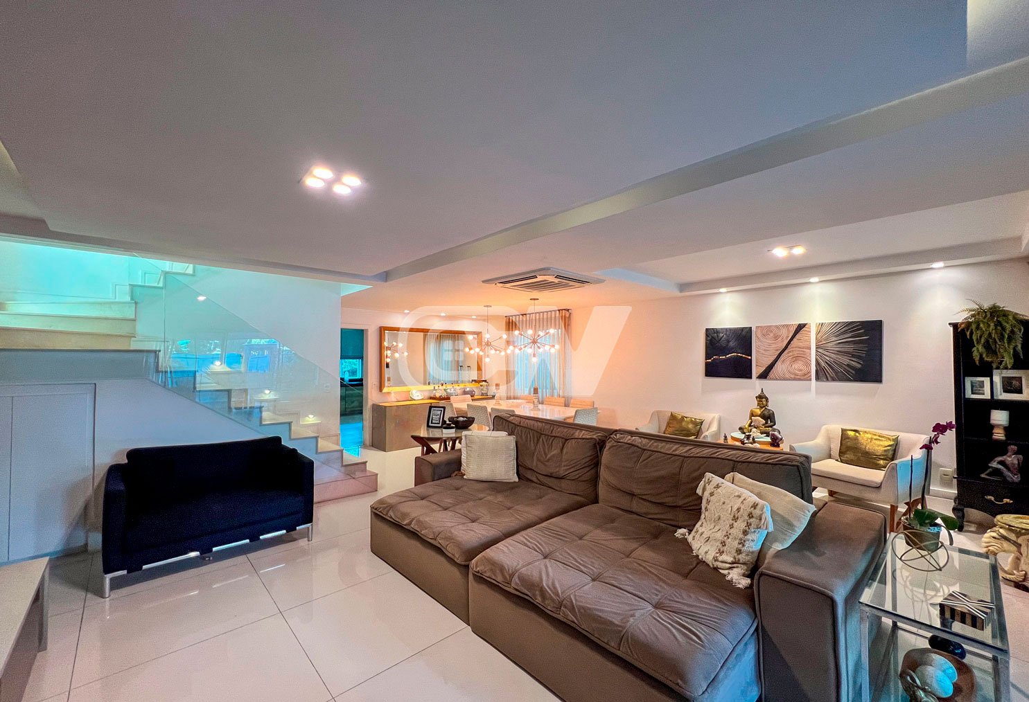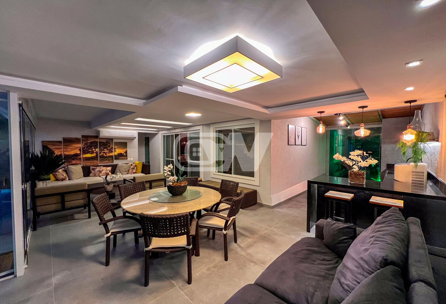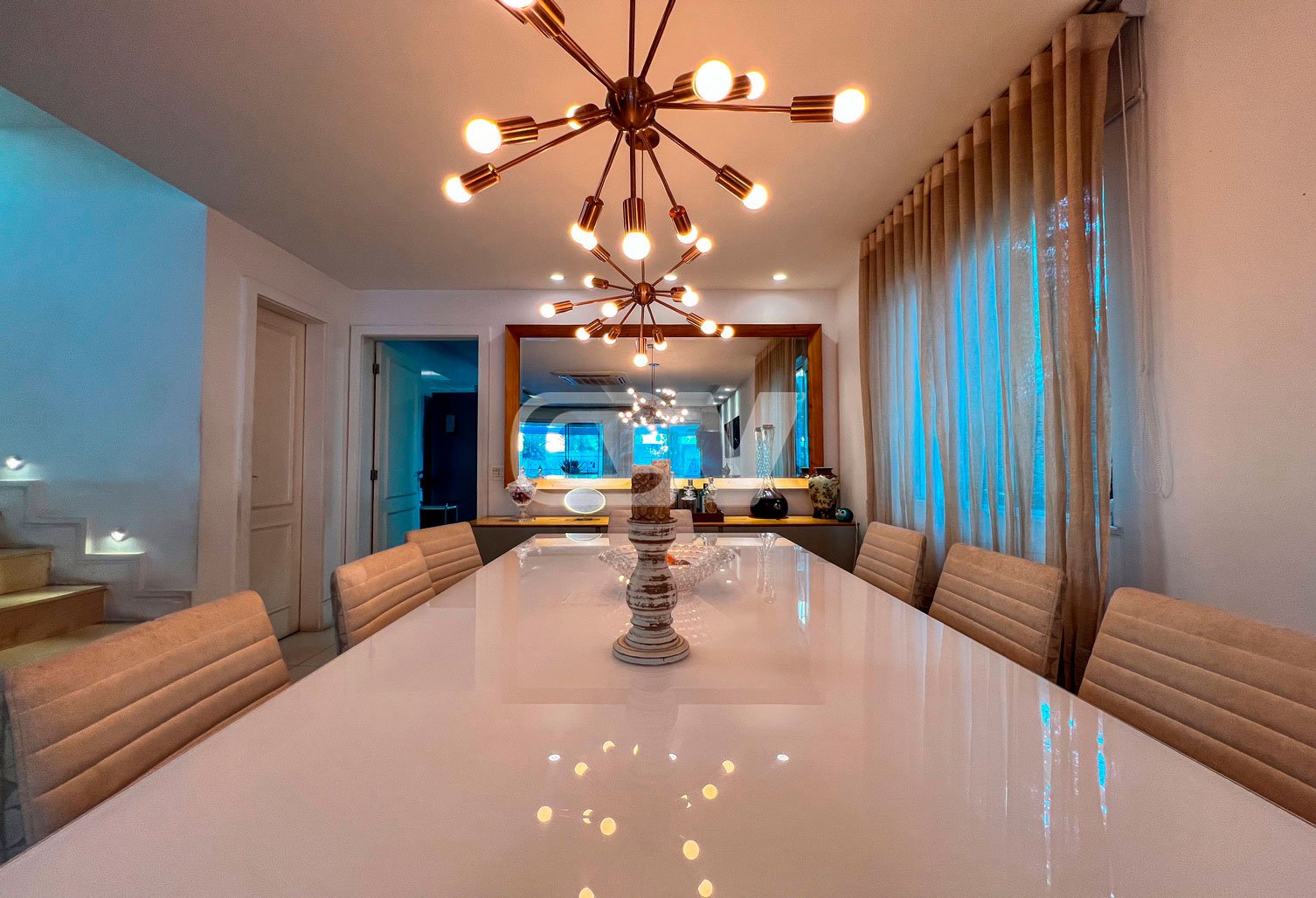 1º PAVIMENTO: Sala ampla dividida em três ambientes, com projeto de iluminação, lavabo, Copa cozinha com moveis planejada, área de serviço e dependência completa.