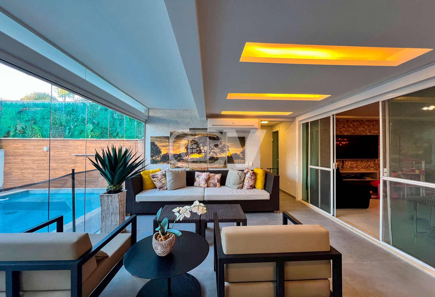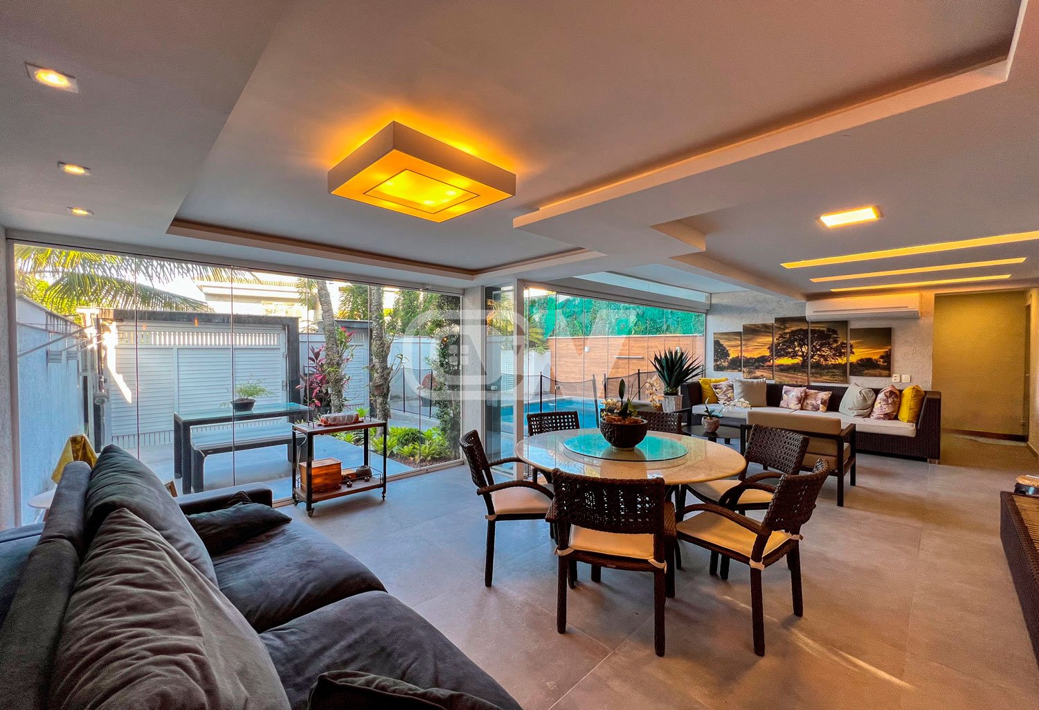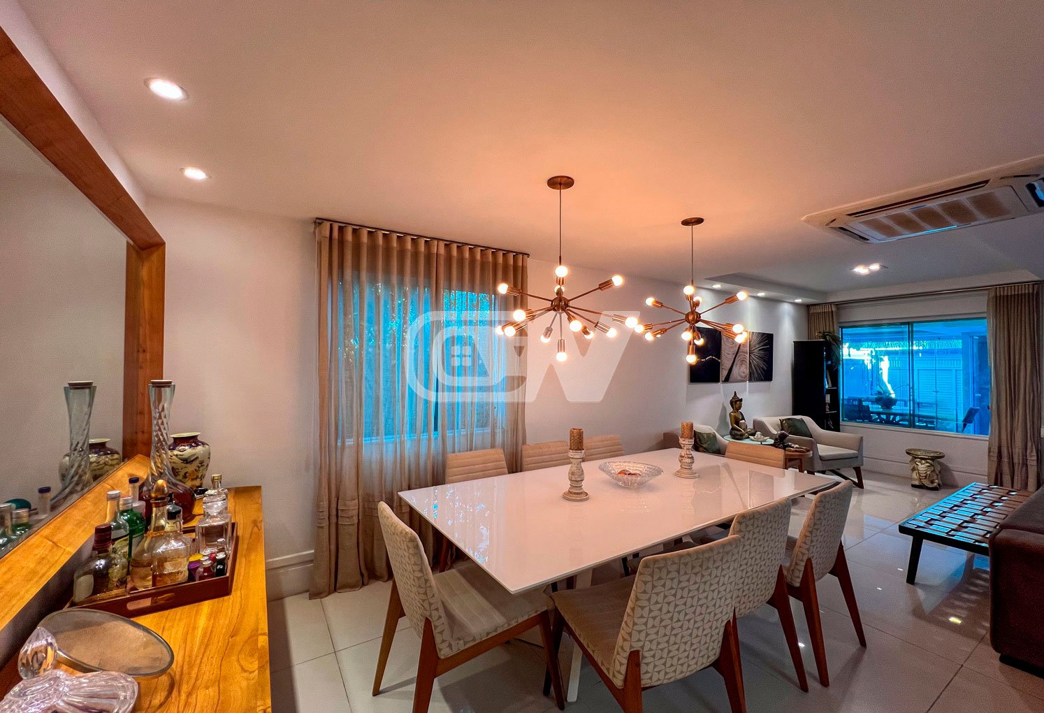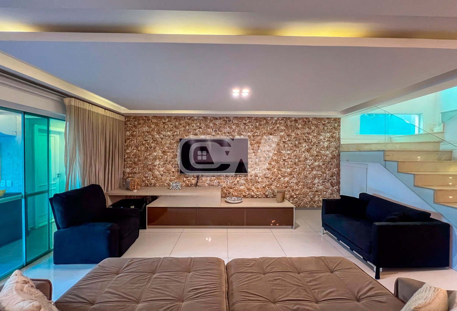 1º PAVIMENTO: Sala ampla dividida em três ambientes, com projeto de iluminação, lavabo, Copa cozinha com moveis planejada, área de serviço e dependência completa.
