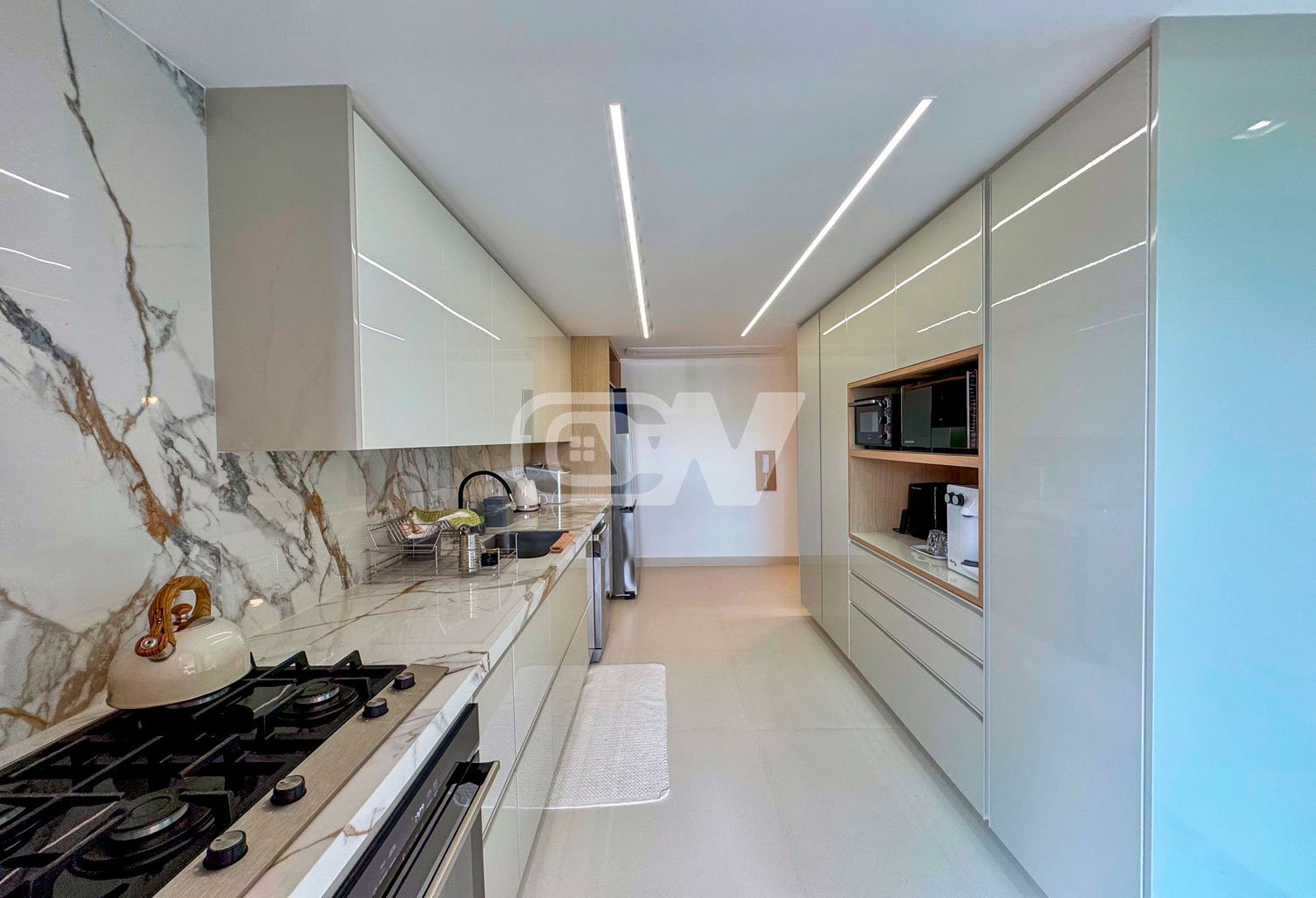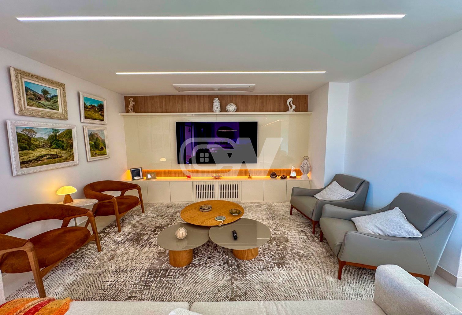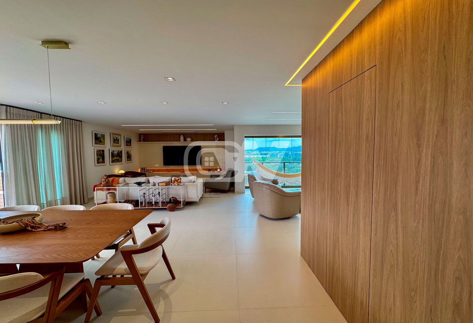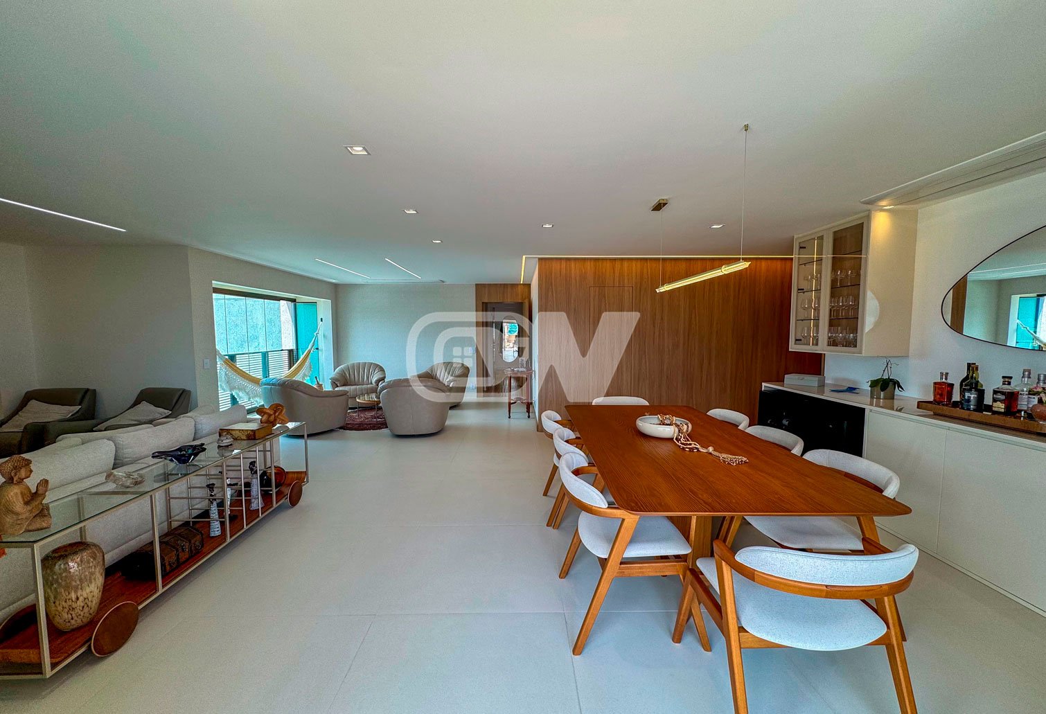 Sala em quatro ambientes em porcelanato, projeto de iluminação em led podendo ser integrada a varanda fechada com cortina de vidro, com vista para o mar, banheiro social, quatro (4) suítes com armários Lacca, sendo a Master com closet. Cozinha com armários planejados Lacca, área de serviço e dependência completa.
