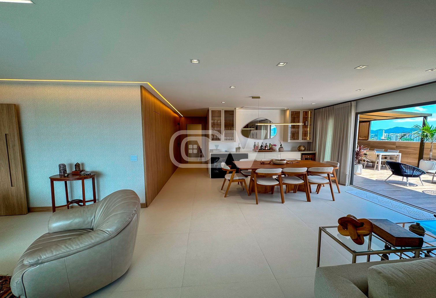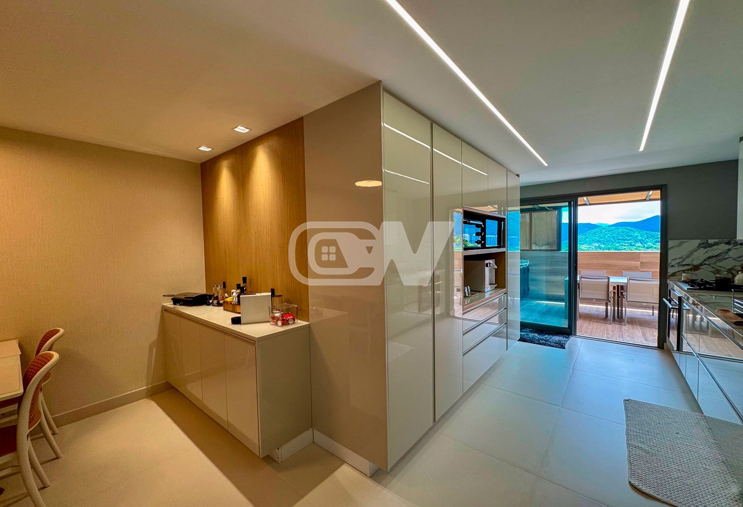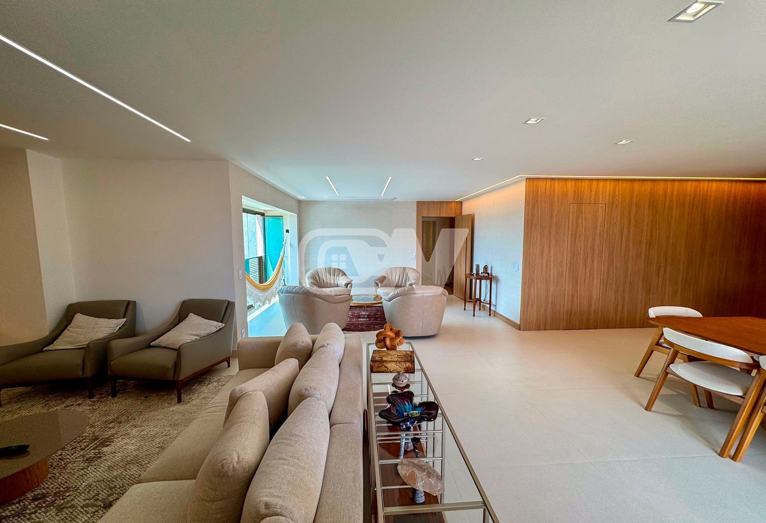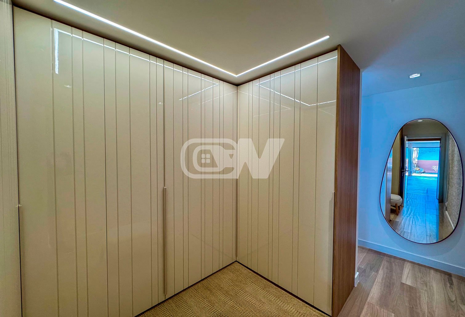 Sala em quatro ambientes em porcelanato, projeto de iluminação em led podendo ser integrada a varanda fechada com cortina de vidro, com vista para o mar, banheiro social, quatro (4) suítes com armários Lacca, sendo a Master com closet. Cozinha com armários planejados Lacca, área de serviço e dependência completa.