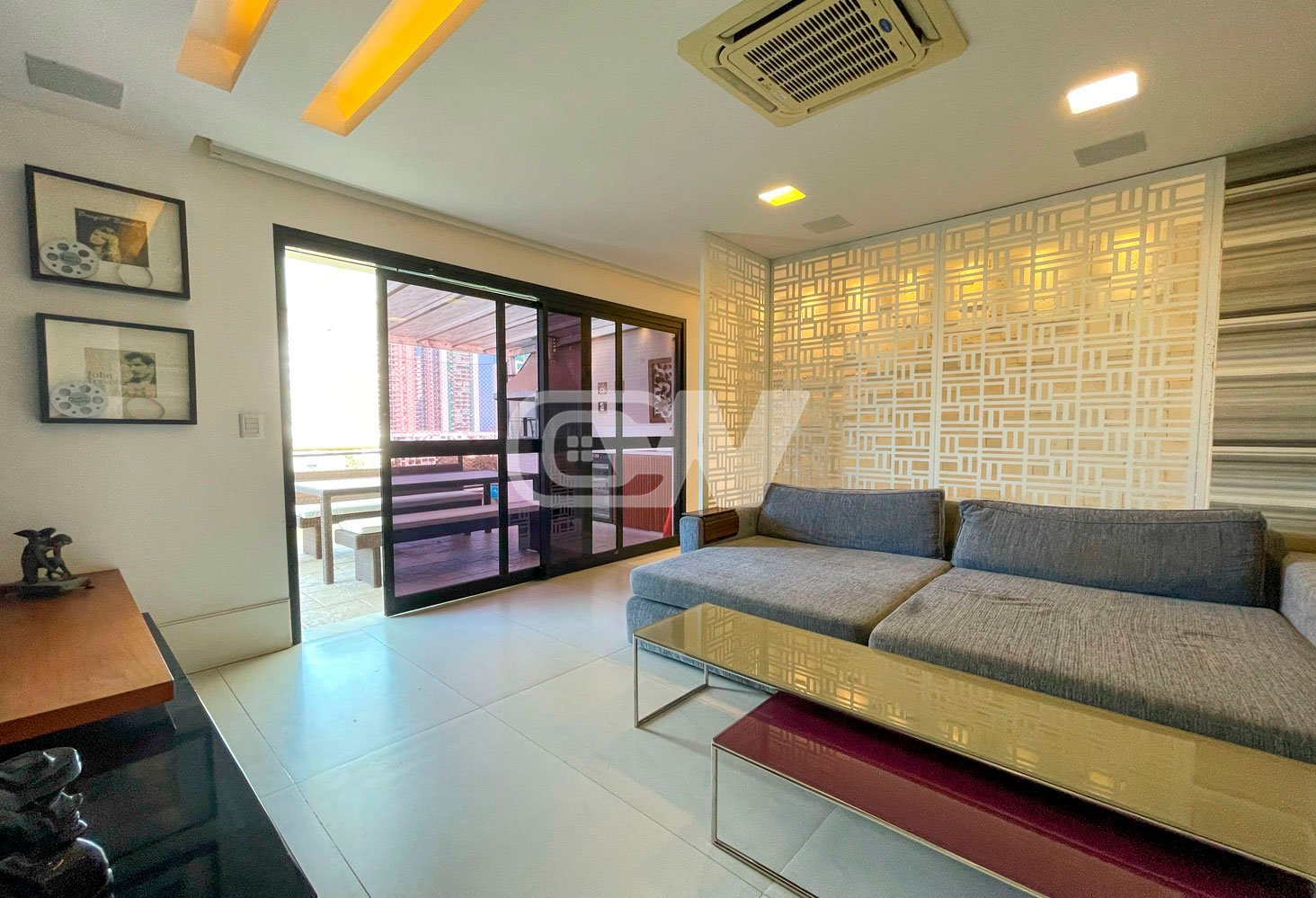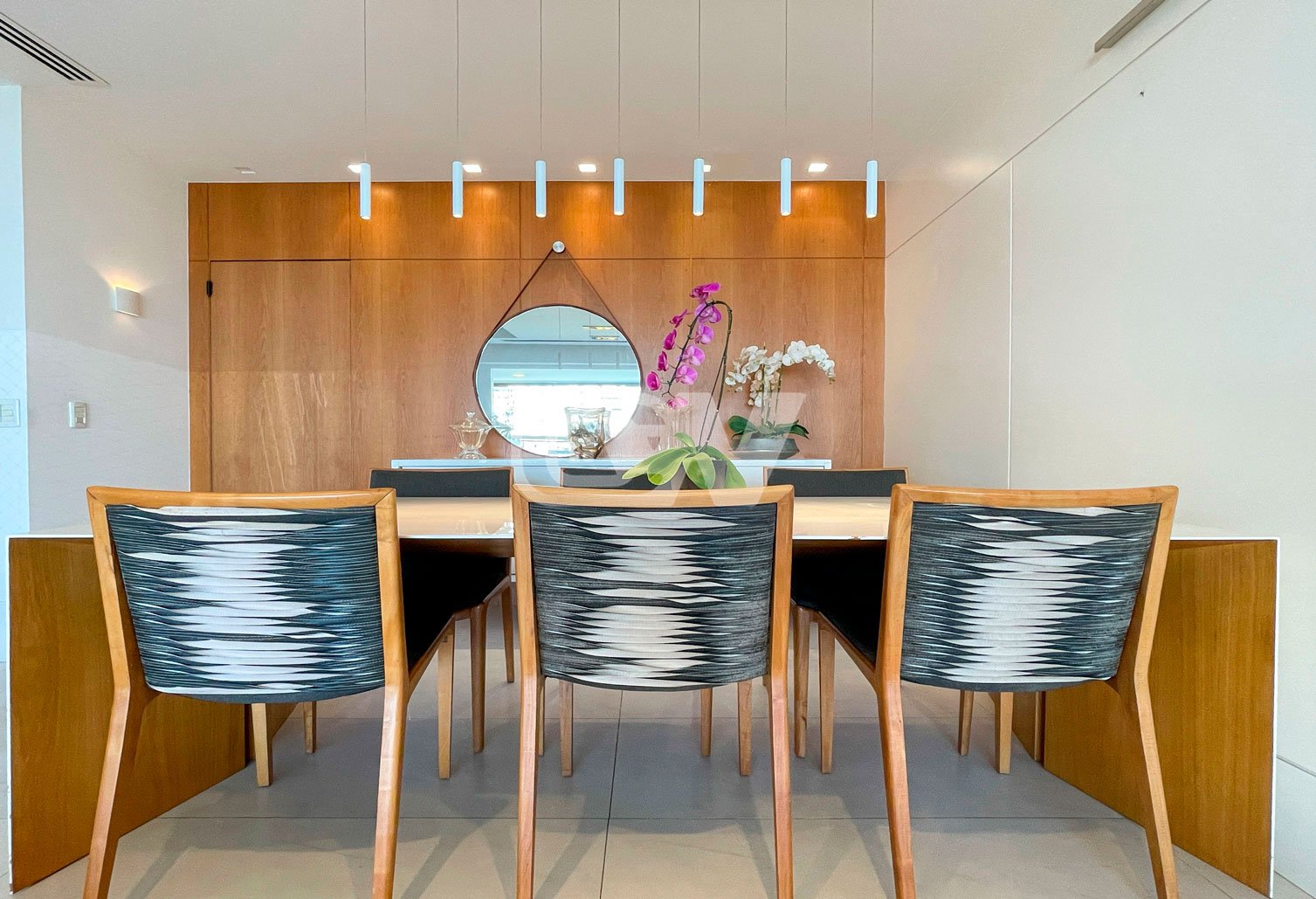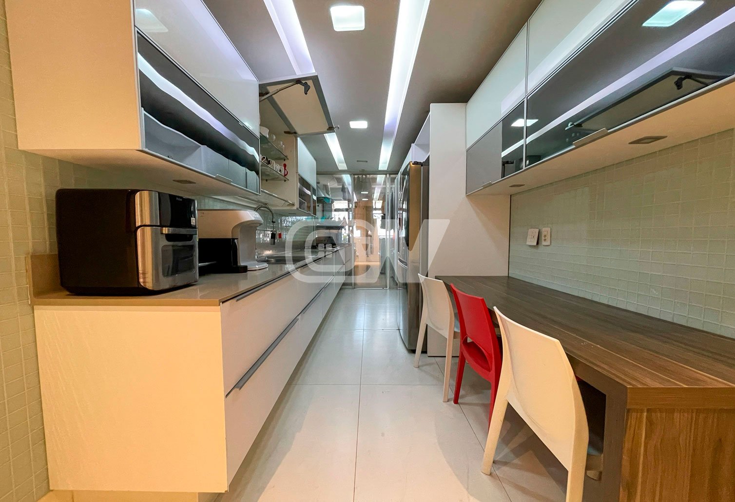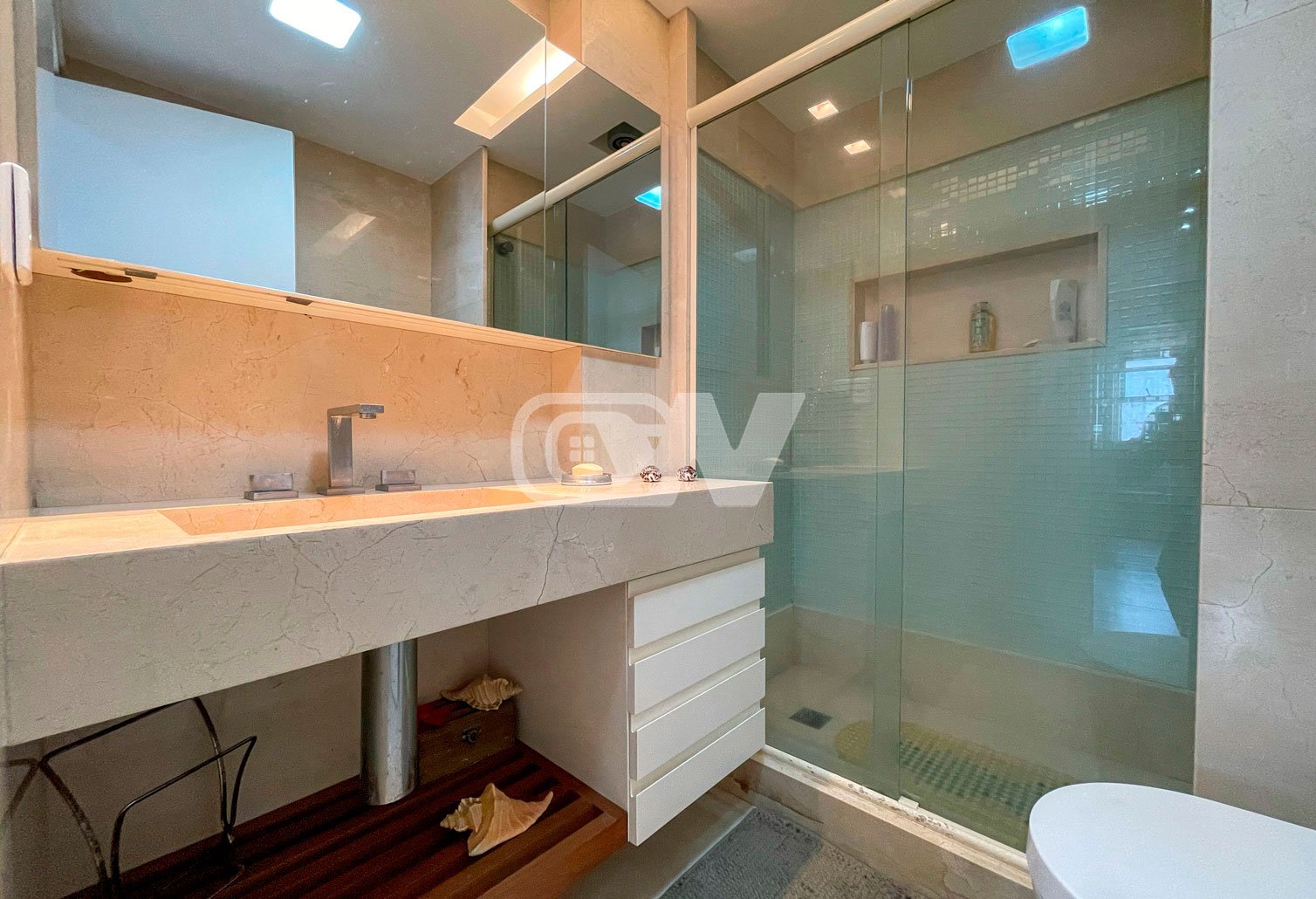 1° Pavimento: Ampla sala em três ambientes, integrada a varanda fechada em cortina de vidro, sol da manhã, vista lateral mar, totalmente reformada, projeto de iluminação e som, acabamento alto padrão, sistema de monitoramento por circuito fechado, ar condicionado dutado, marcenaria na varanda com bar e adega, banheiro social completo com cuba esculpida. Nesse pavimento são dois quartos sendo 1 suíte todos com armários planejados. Cozinha repleta de armários, área de serviço e dependência completa.