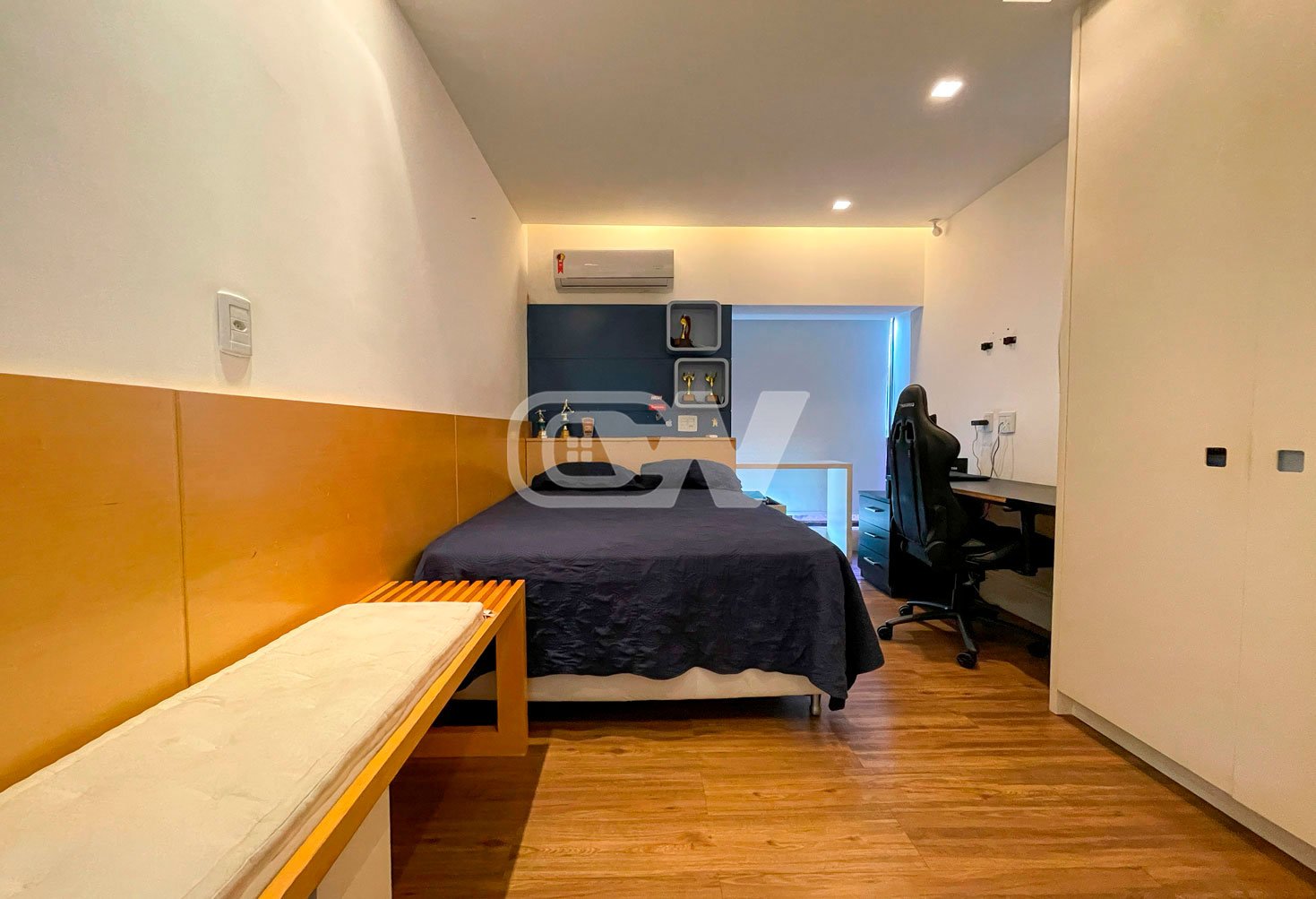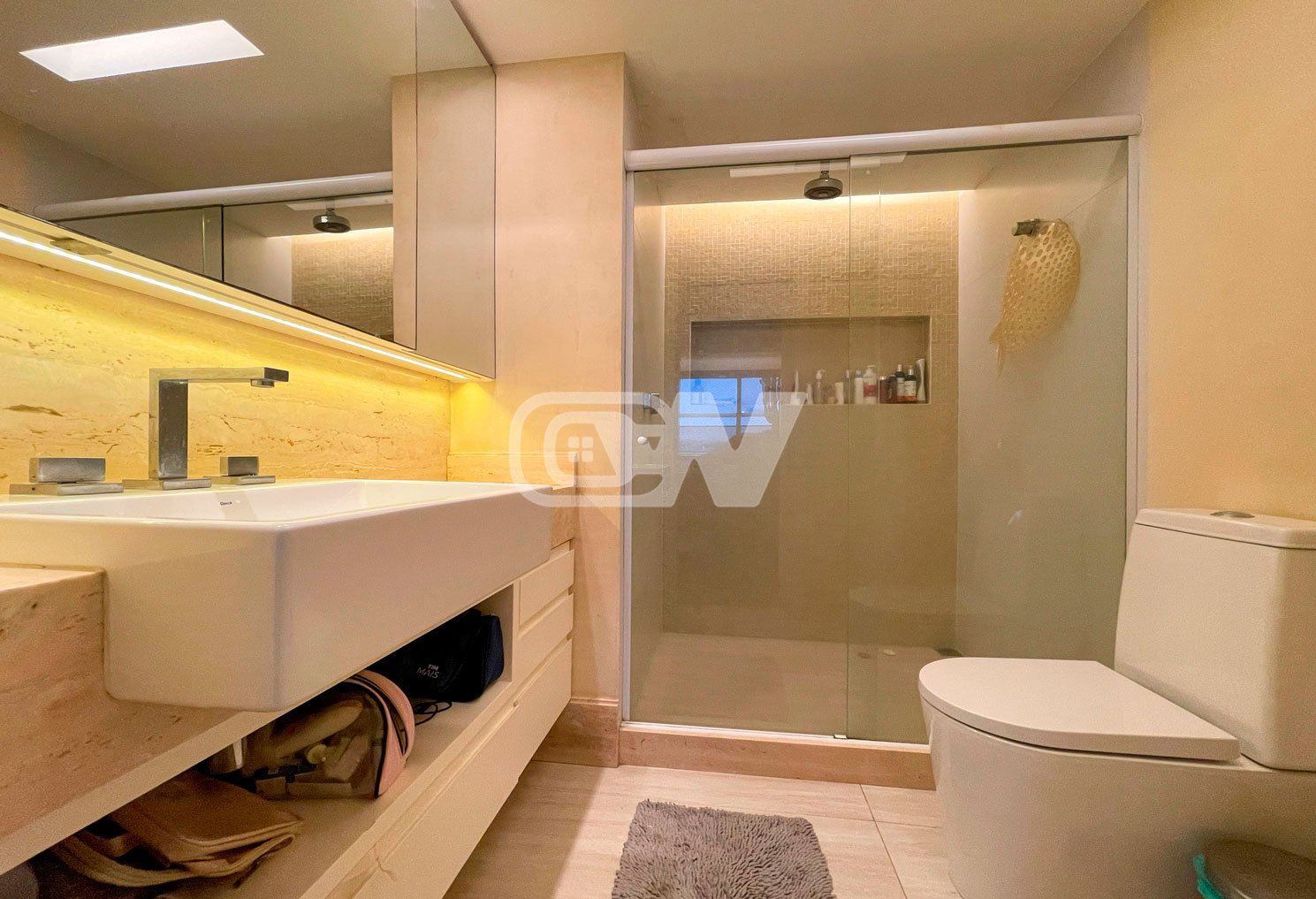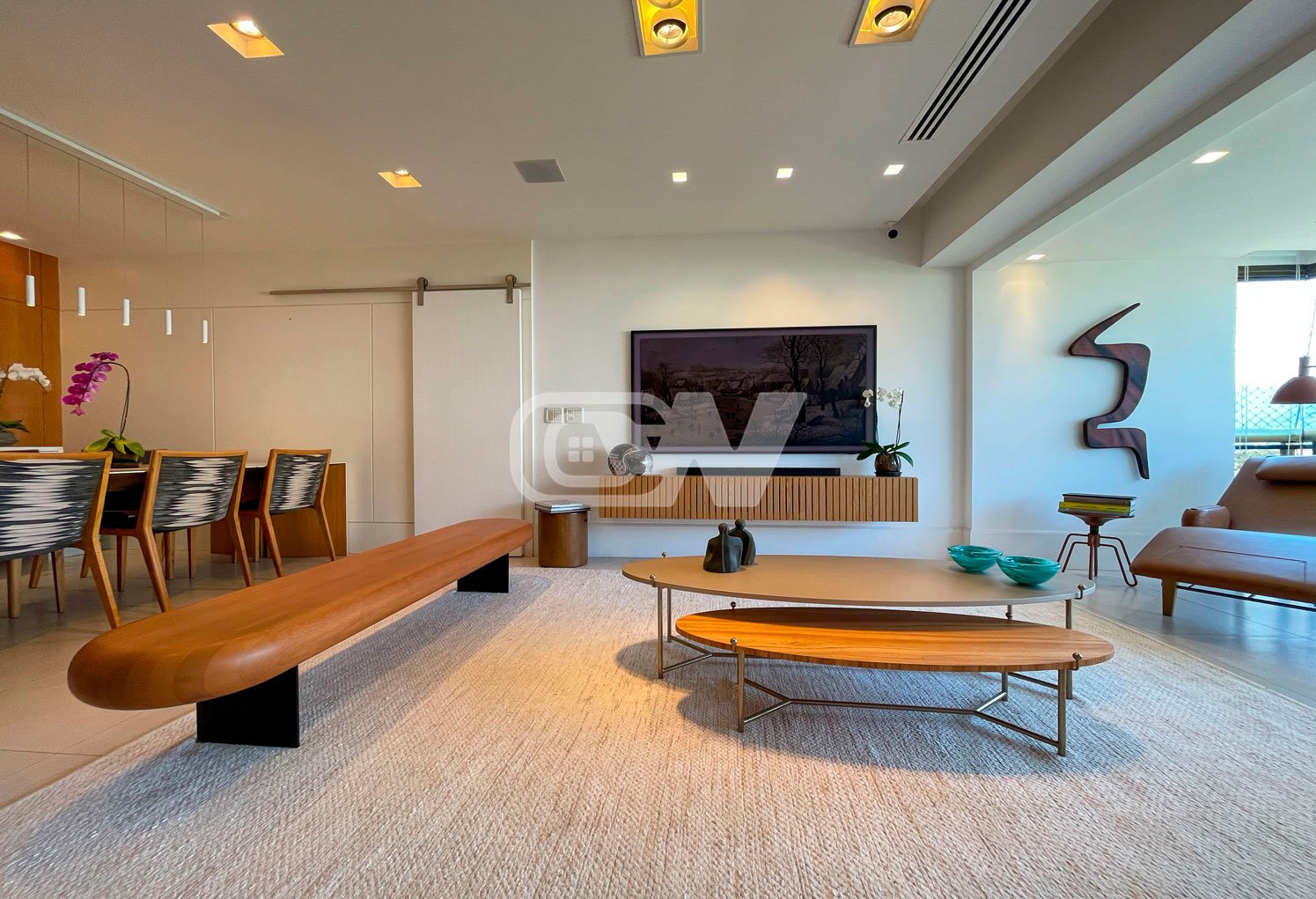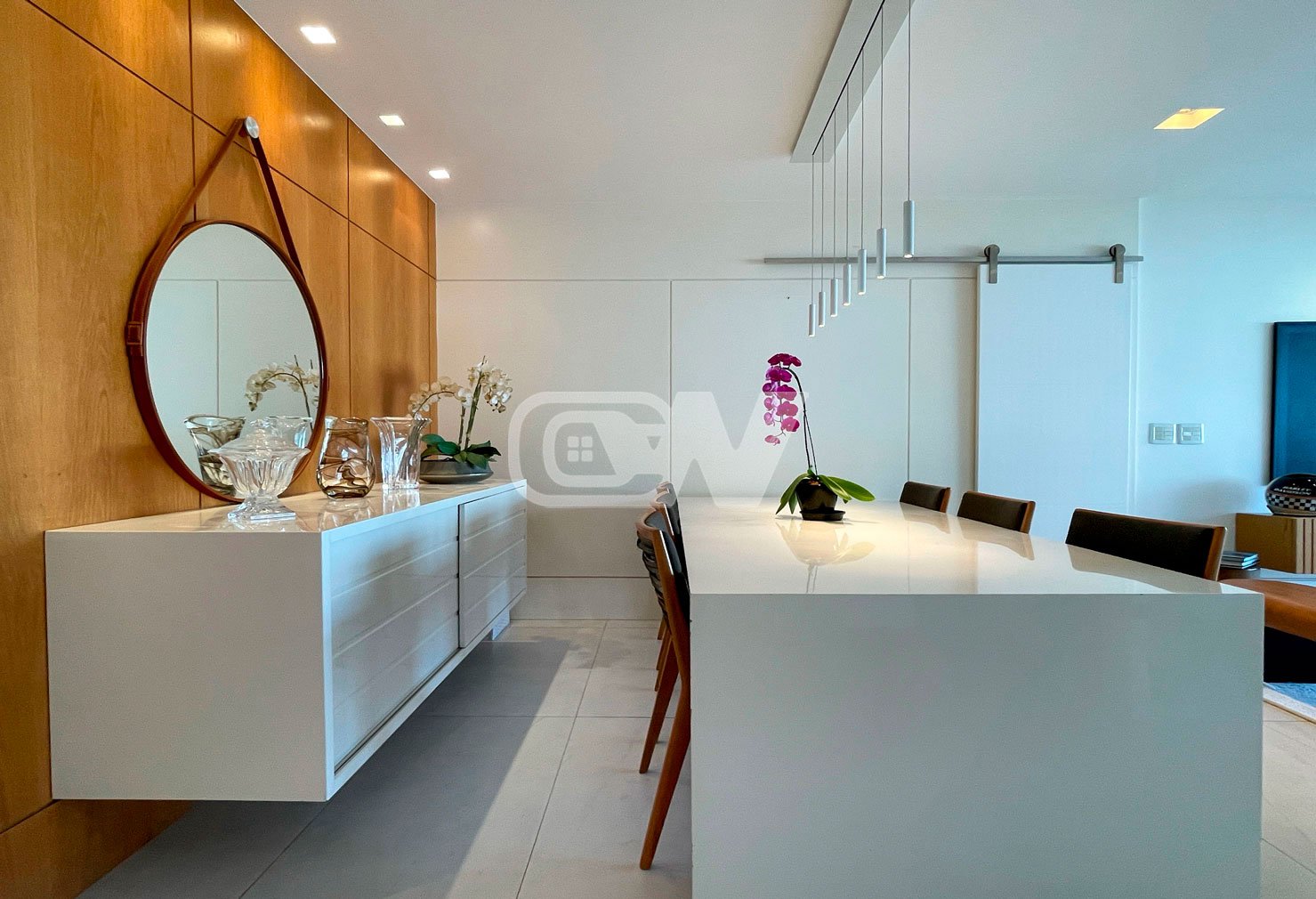 1° Pavimento: Ampla sala em três ambientes, integrada a varanda fechada em cortina de vidro, sol da manhã, vista lateral mar, totalmente reformada, projeto de iluminação e som, acabamento alto padrão, sistema de monitoramento por circuito fechado, ar condicionado dutado, marcenaria na varanda com bar e adega, banheiro social completo com cuba esculpida. Nesse pavimento são dois quartos sendo 1 suíte todos com armários planejados. Cozinha repleta de armários, área de serviço e dependência completa.