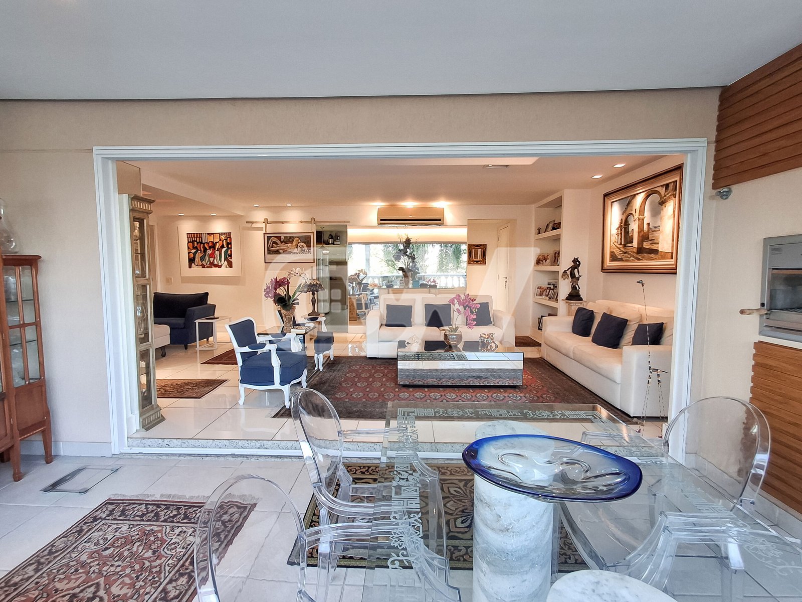 Sala ampla dividida três ambientes, sala de esta, sala de jantar  e sala de tv, climatizada por ar condicionado modelo split e totalmente integrada a varanda gourmet, fechada por cortina de vidro e lavabo de apoio.