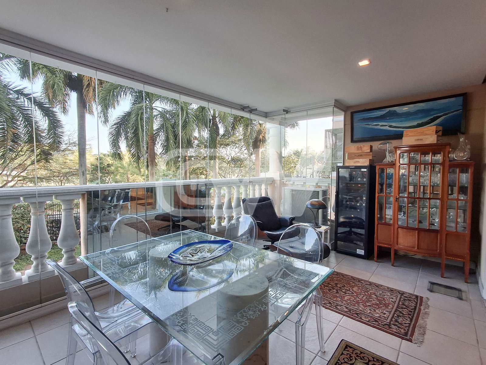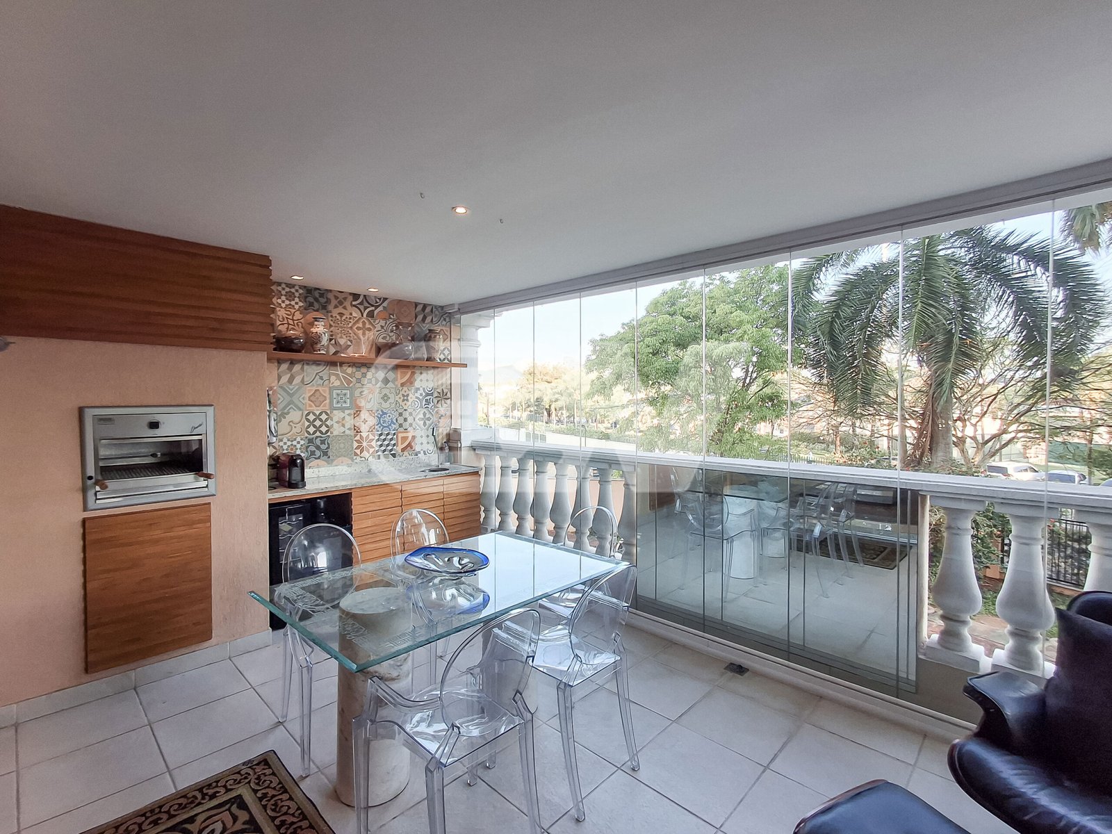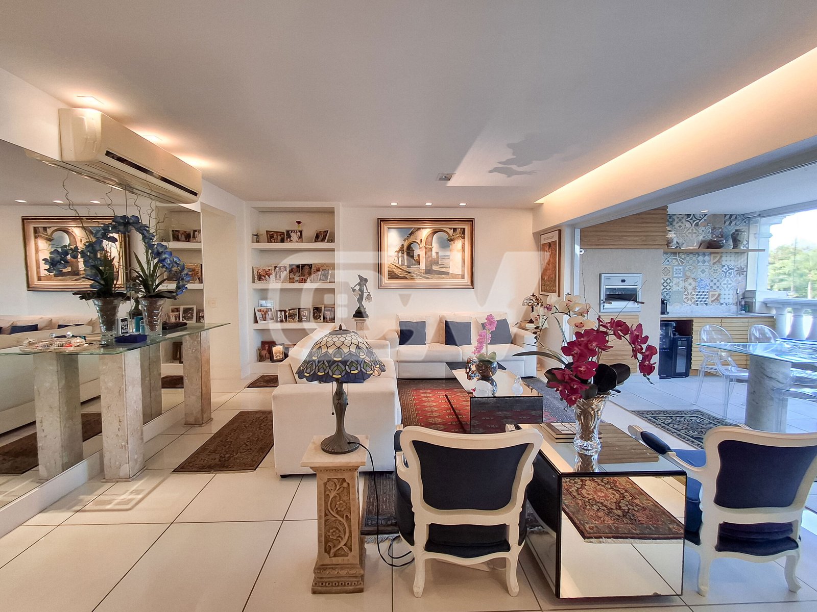 Sala ampla dividida três ambientes, sala de esta, sala de jantar  e sala de tv, climatizada por ar condicionado modelo split e totalmente integrada a varanda gourmet, fechada por cortina de vidro e lavabo de apoio.