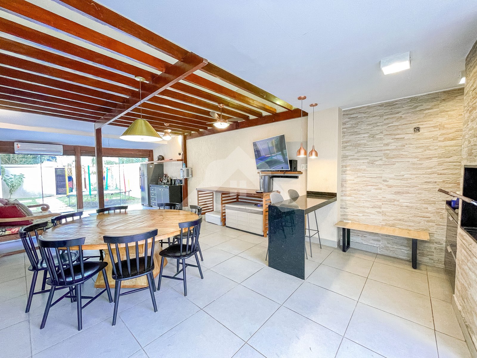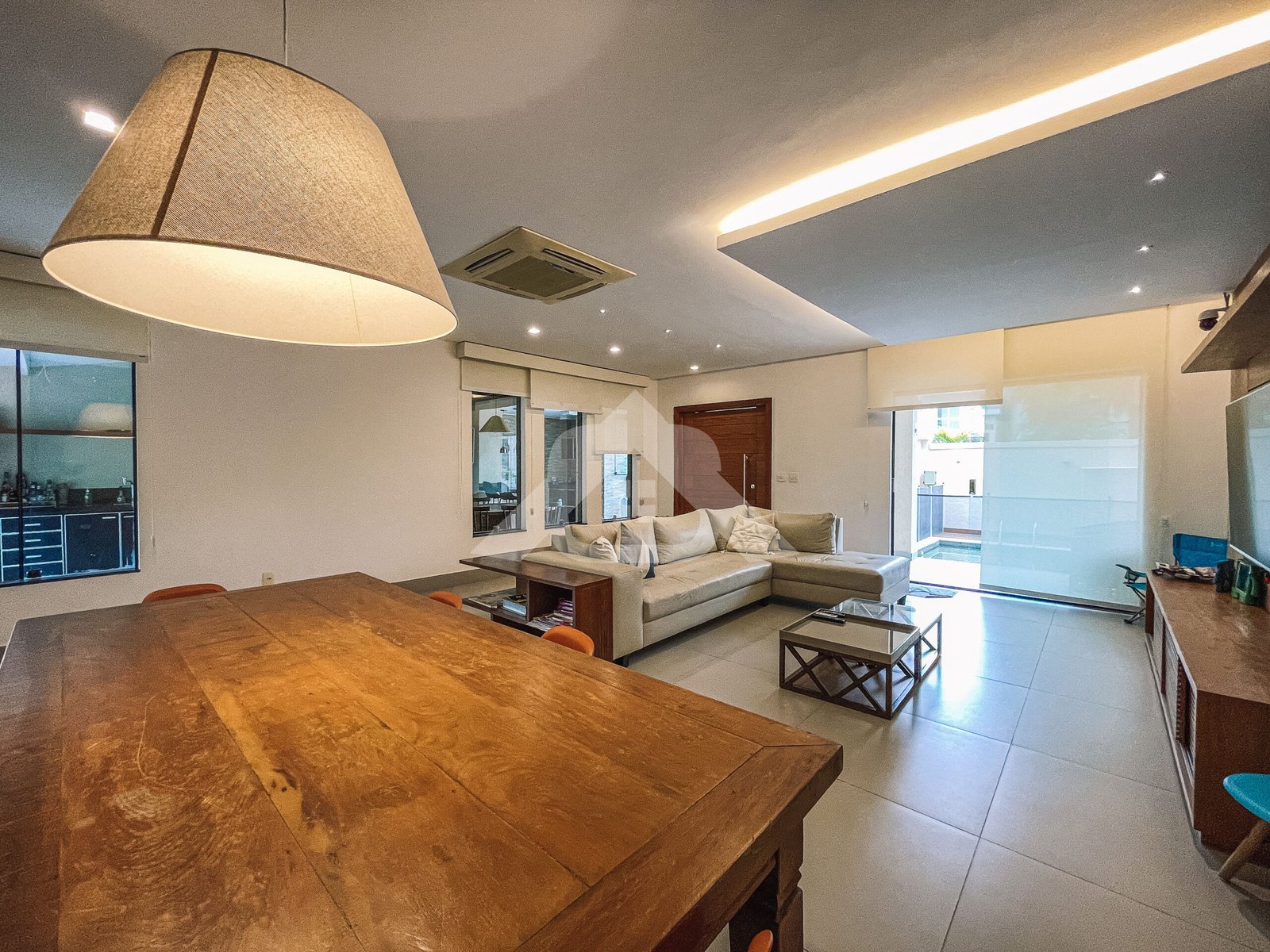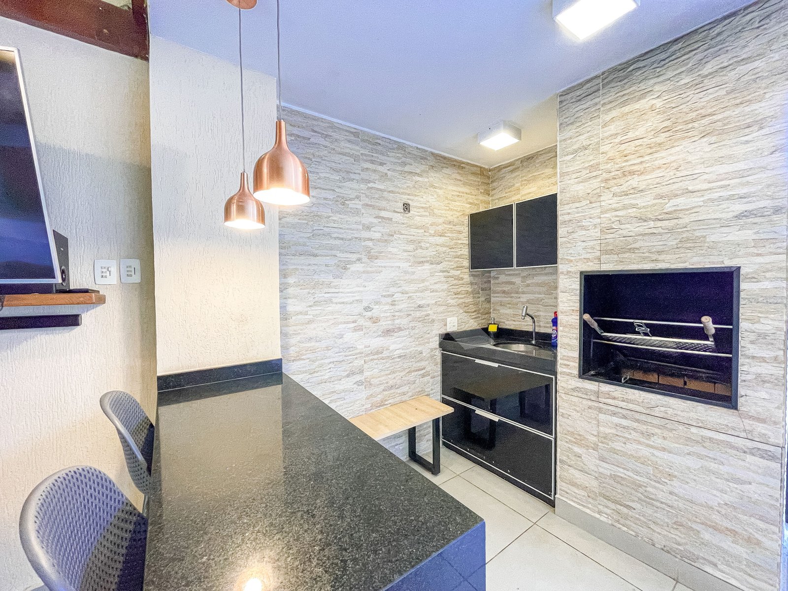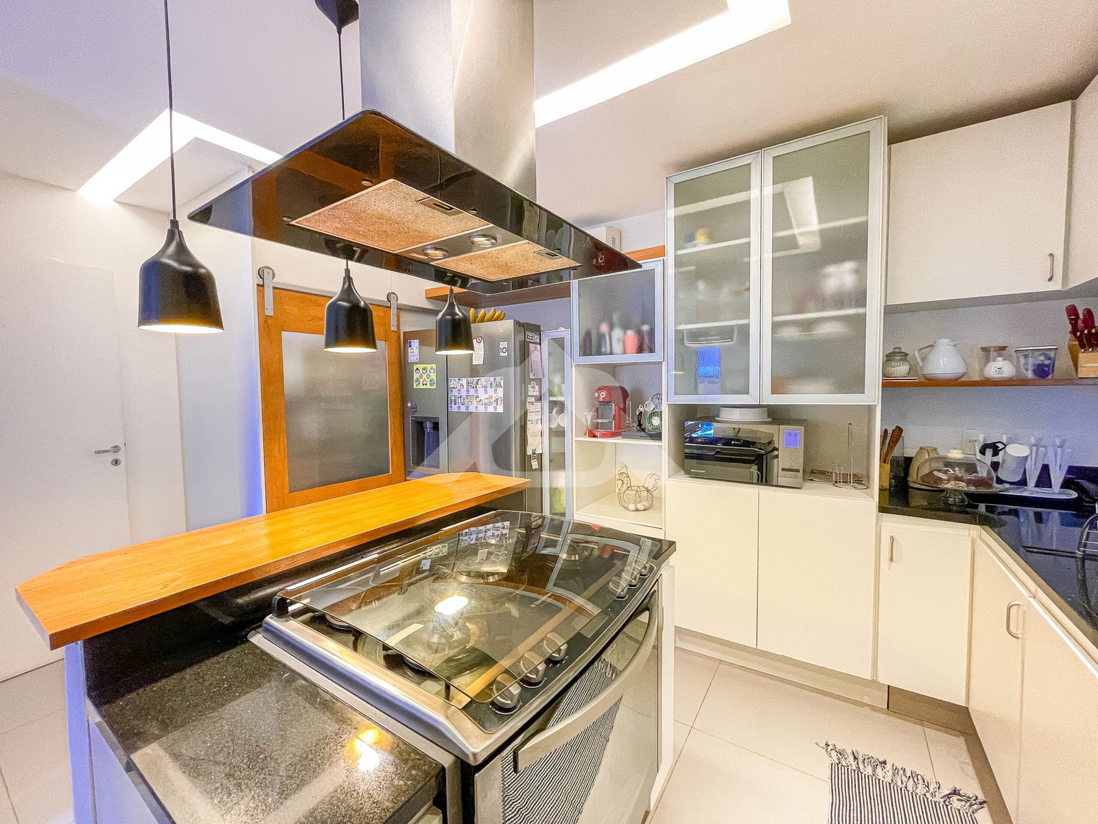 1° Pavimento: Salão em vários ambientes com piso porcelanato, projeto de iluminação, lavabo decorado, copa cozinha com armários planejados, despensa e área de serviço.