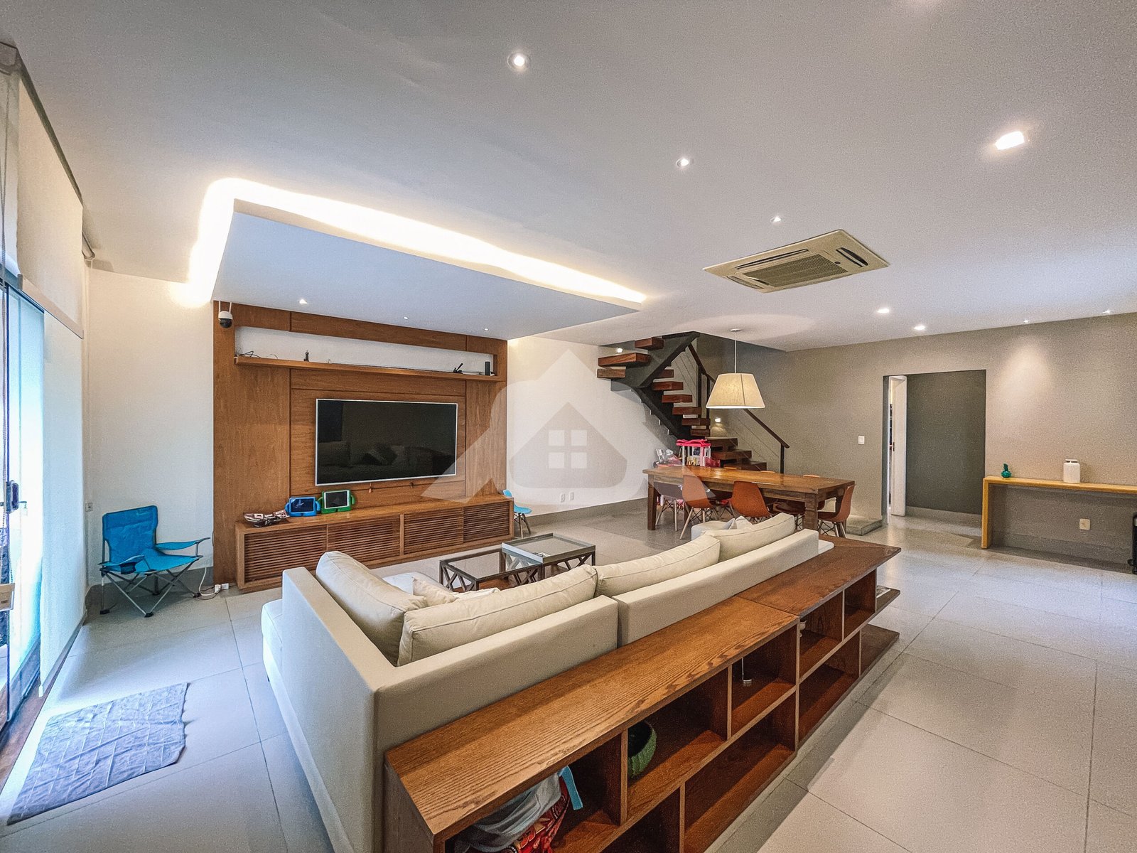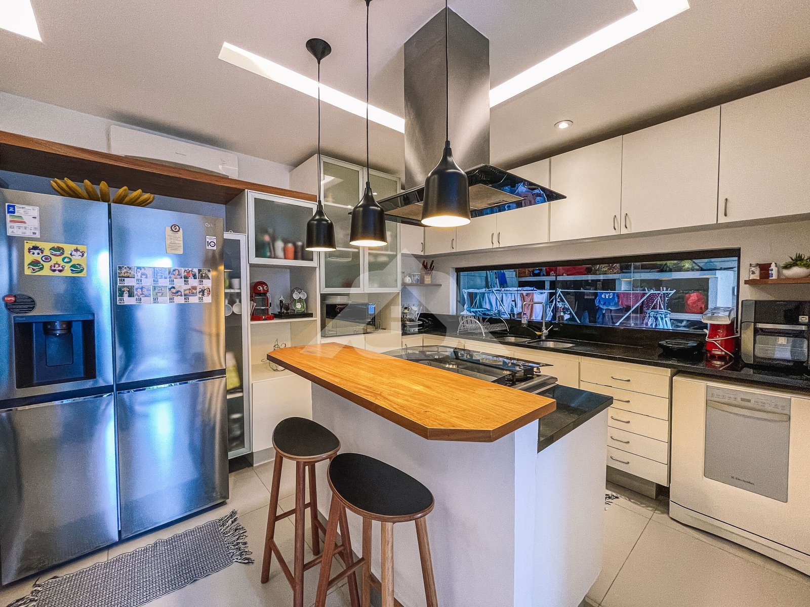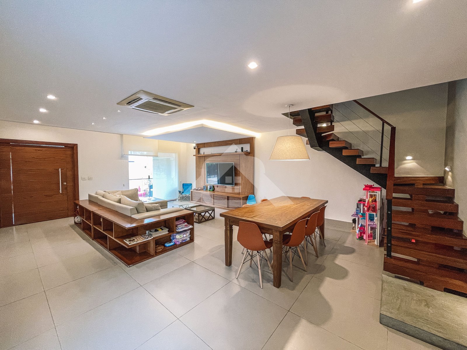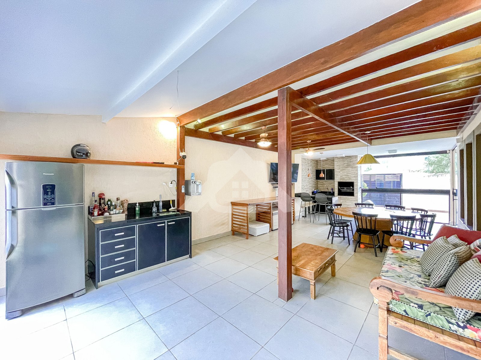 1° Pavimento: Salão em vários ambientes com piso porcelanato, projeto de iluminação, lavabo decorado, copa cozinha com armários planejados, despensa e área de serviço.